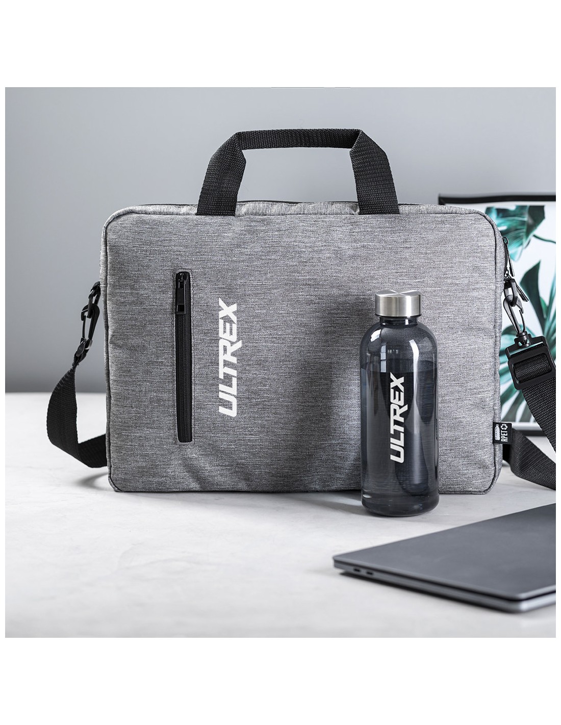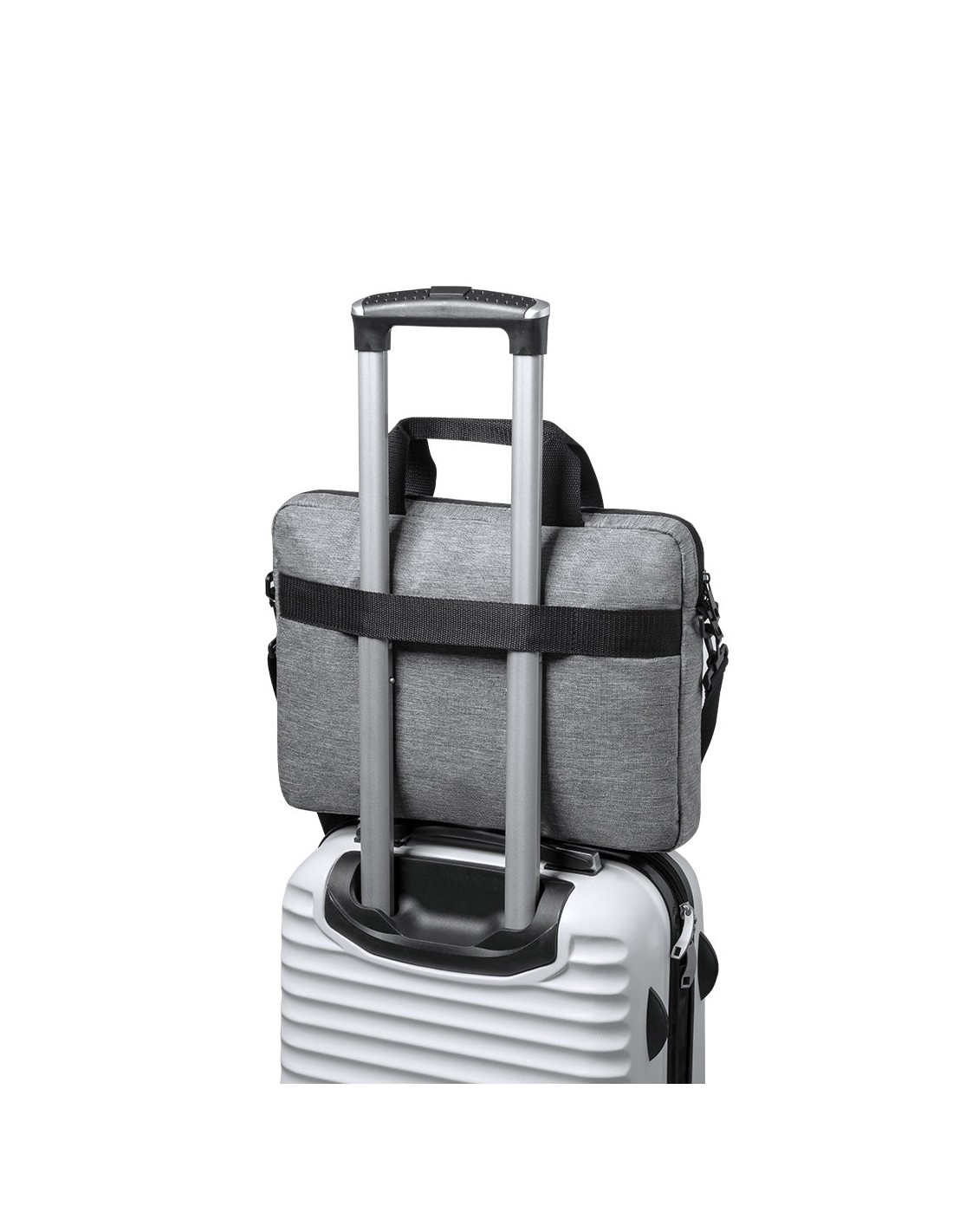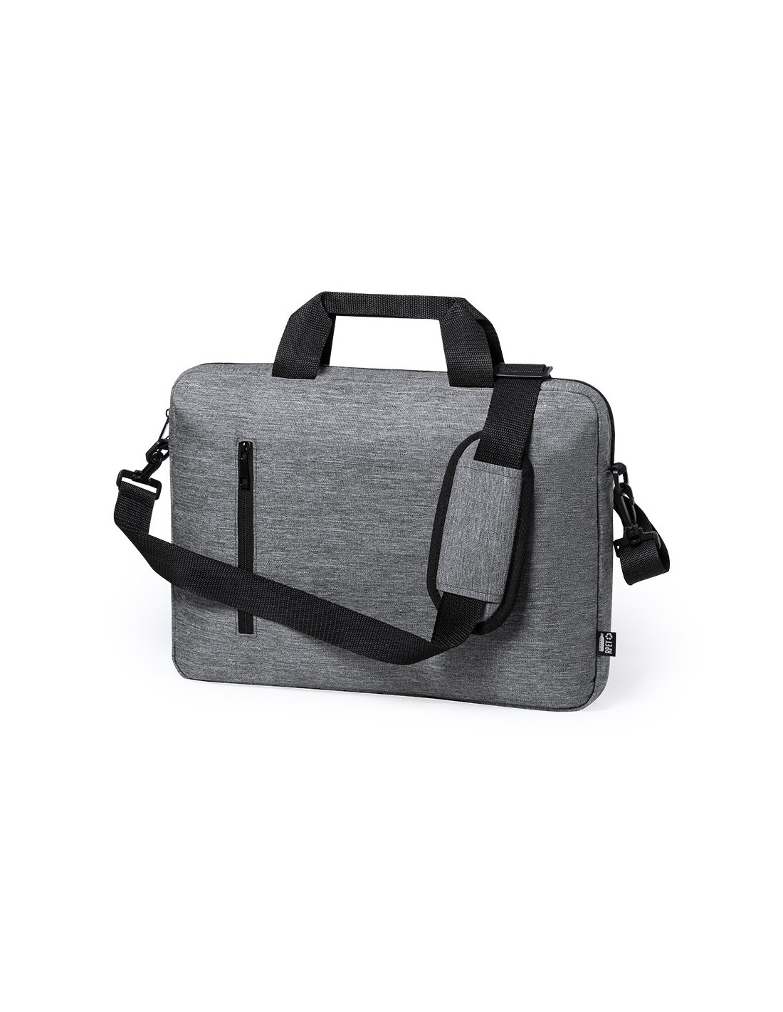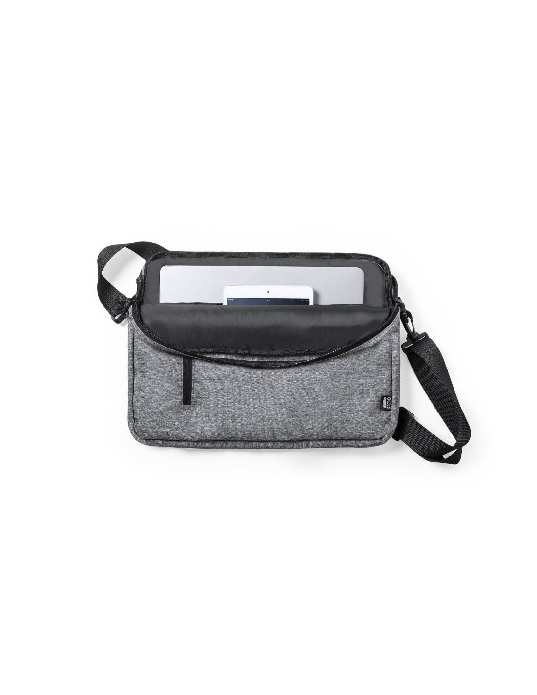 Elegante portadocumentos de línea nature en resistente 600D RPET efecto melange, elaborado a partir de plástico reciclado para así fomentar la reutilización de residuos plásticos y contribuir a la sostenibilidad del planeta. Detalles en negro, incluye compartimentos interiores acolchados para ordenador de hasta 15 pulgadas y tablet de hasta 10 pulgadas. Accesorio en parte posterior para anclaje al trolley, bolsillo exterior con cierre de cremallera, cómodas asas reforzadas, cinta bandolera ajustable con cierre de mosquetón y almohadilla para hombro a juego. Distintivo RPET en etiqueta exterior.