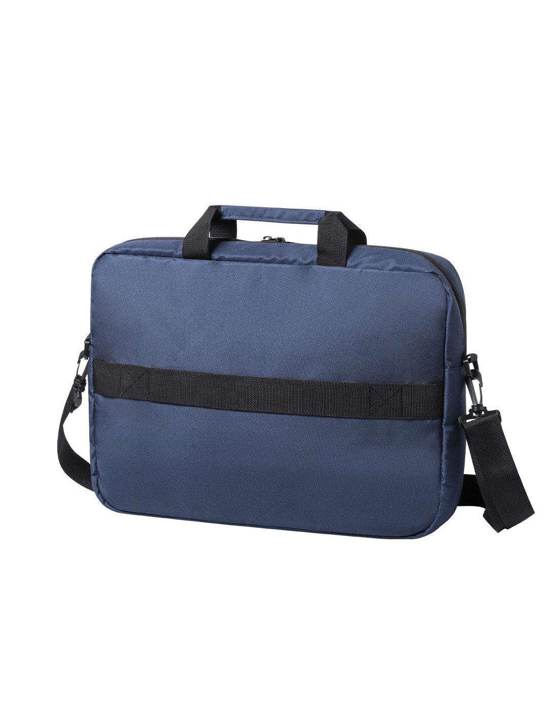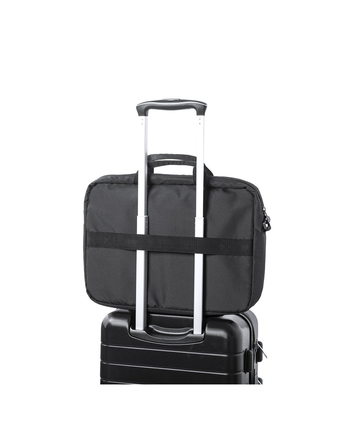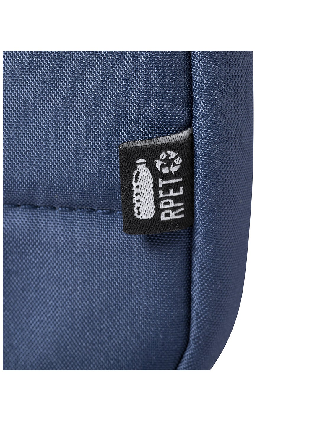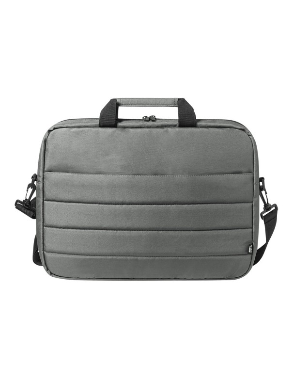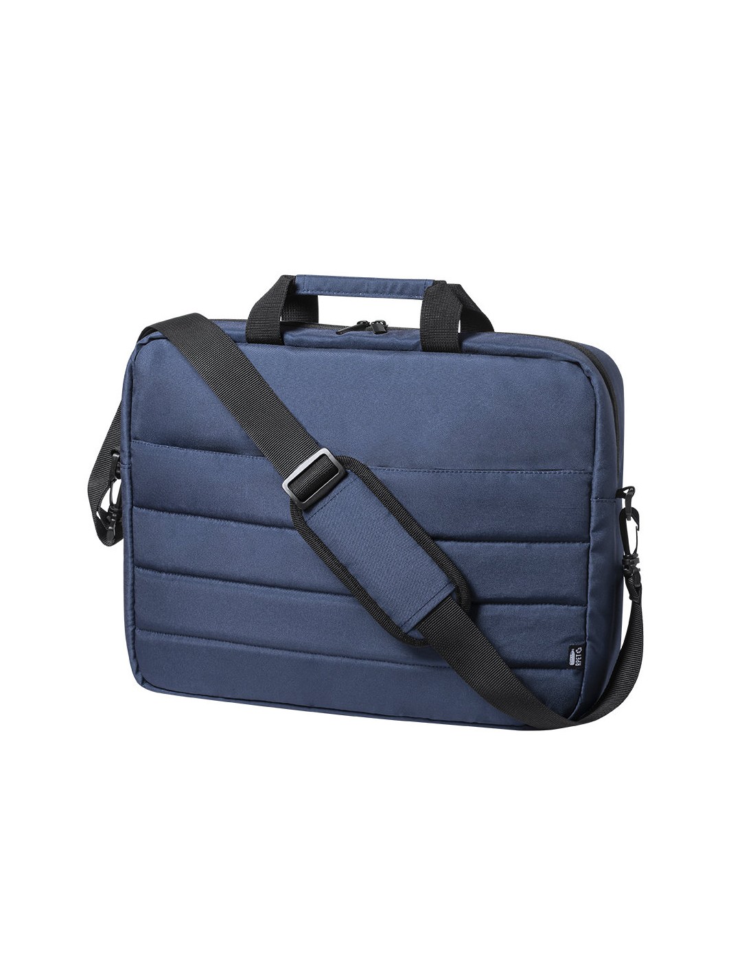 Maletín de línea nature con diseño urbano y acolchado total. Fabricado en resistente RPET 300D elaborado a partir de plástico reciclado, para así fomentar la reutilización de residuos plásticos y contribuir a la sostenibilidad del planeta. Accesorio para ajuste en trolley, con compartimento interior acolchado para ordenador portátil de hasta 15 pulgadas. Bolsillo principal con cierre de cremallera y tirador metálico. Cómodas asas de transporte reforzadas y cinta bandolera ajustable, con refuerzo acolchado para hombro y cierres giratorios de mosquetón. Distintivo RPET en etiqueta.