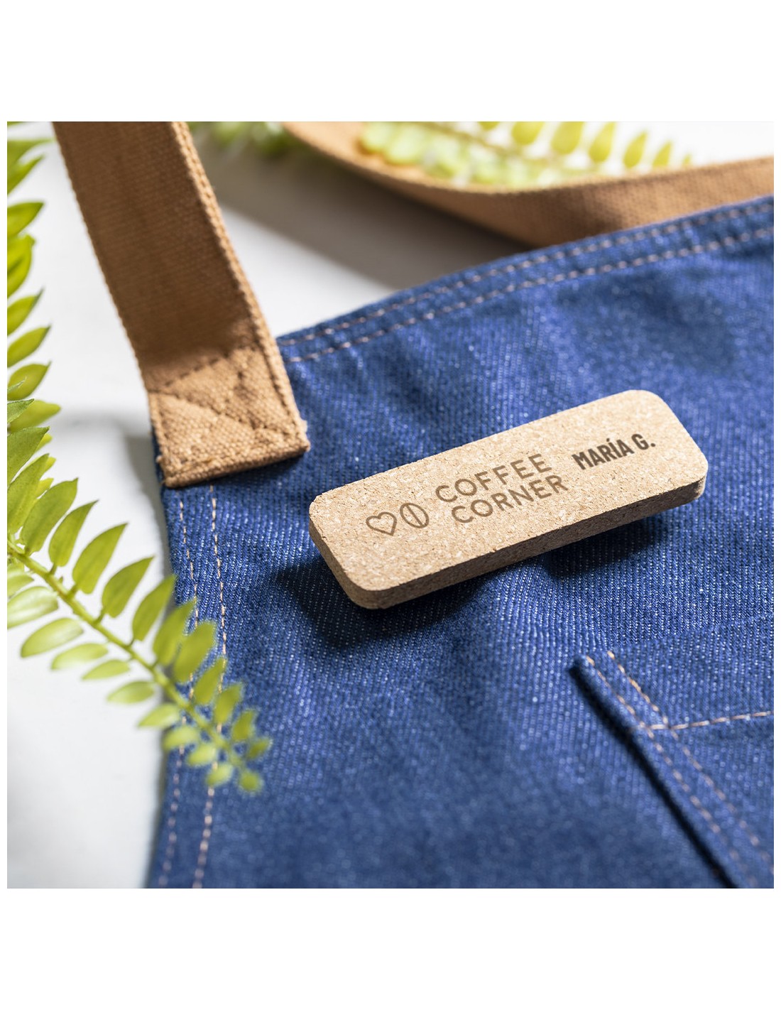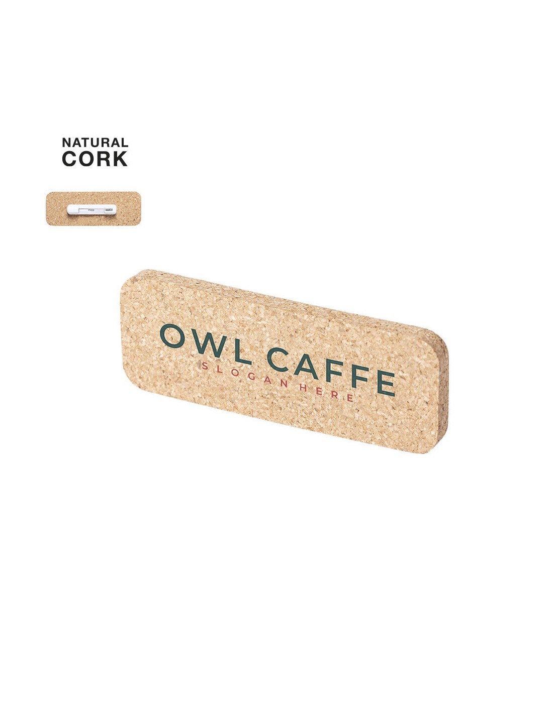 Identificador de línea nature fabricado en corcho natural, para así fomentar la utilización de materias primas naturales y reducir las emisiones contaminantes. Fijación de seguridad con imperdible en la parte trasera.