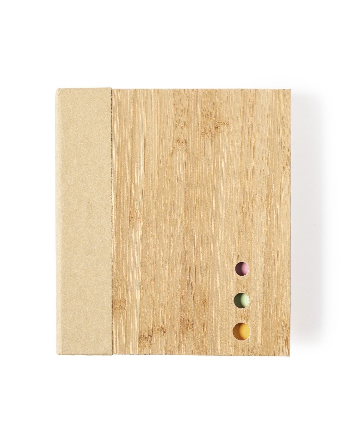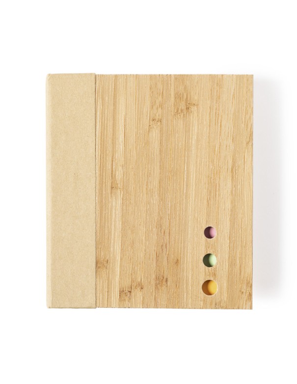 Portanotas de linea nature con tapas rígidas de bambú. Con 115 hojas adhesivas de acabado kraft, 115 hojas adhesivas medianas y 420 mini notas adhesivas.