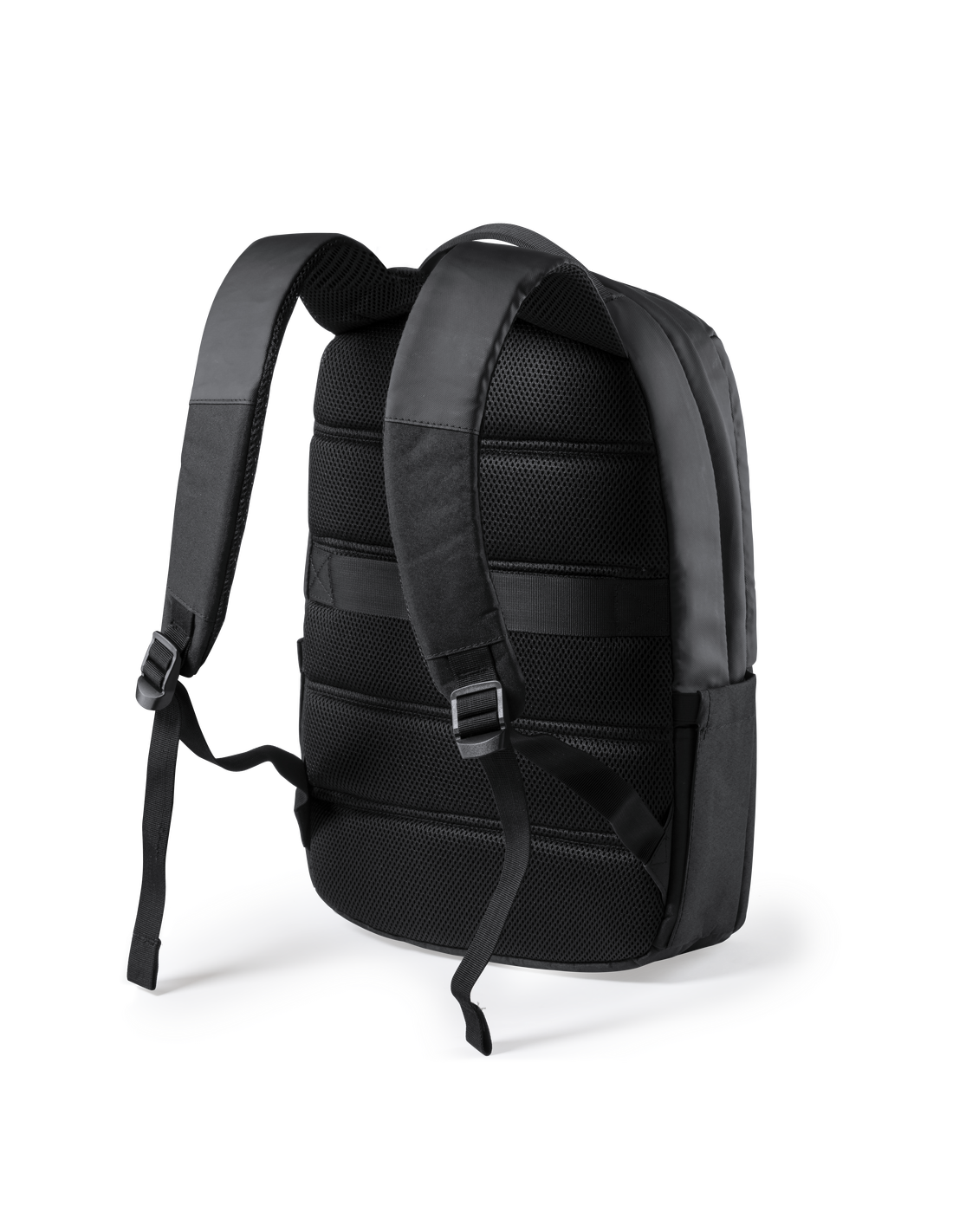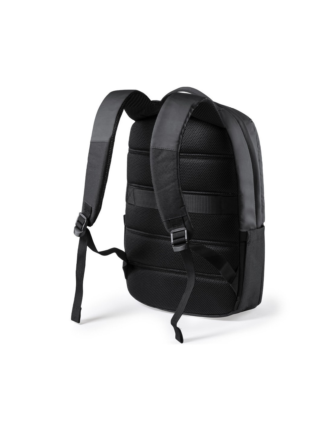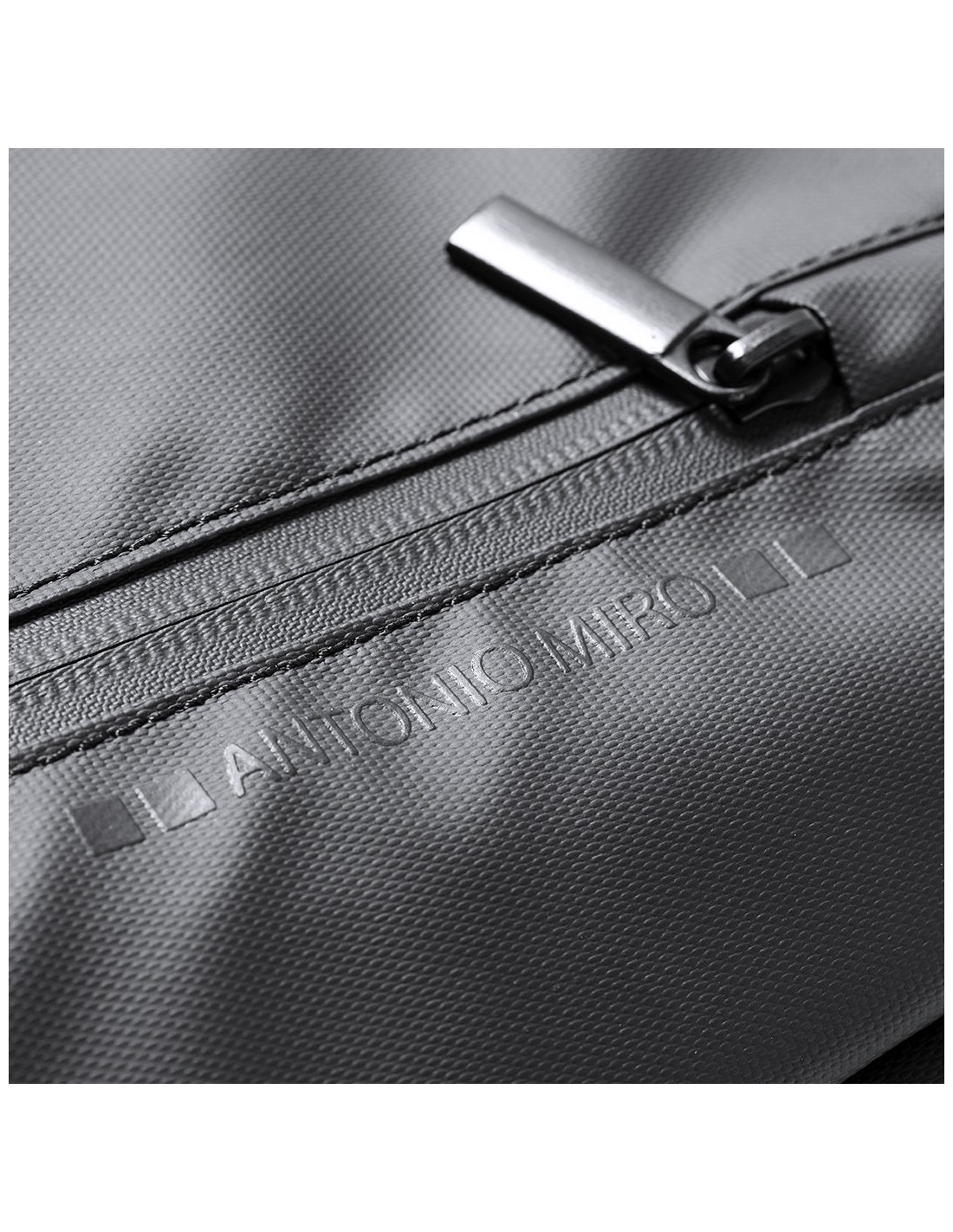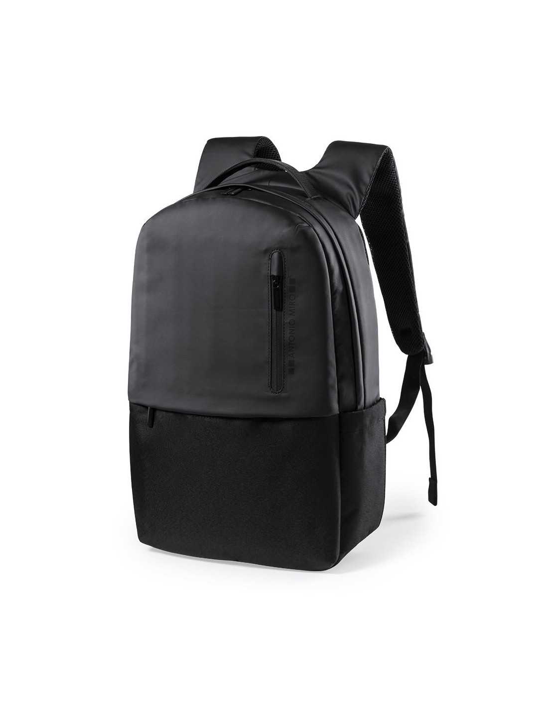 Mochila de Antonio Miró de calidad premium en resistente poliéster 600D de sobrio diseño en color negro. Con cierre de cremallera, bolsillo frontal y asa reforzada metálica. Con acolchado ergonómico en espalda y cintas de hombros, incluye compartimento interior acolchado para portátil de hasta 15 pulgadas y para tablets de hasta 10 pulgadas. Fundas interiores para bolígrafos y smartphone. Con logotipo de la marca en frontal.