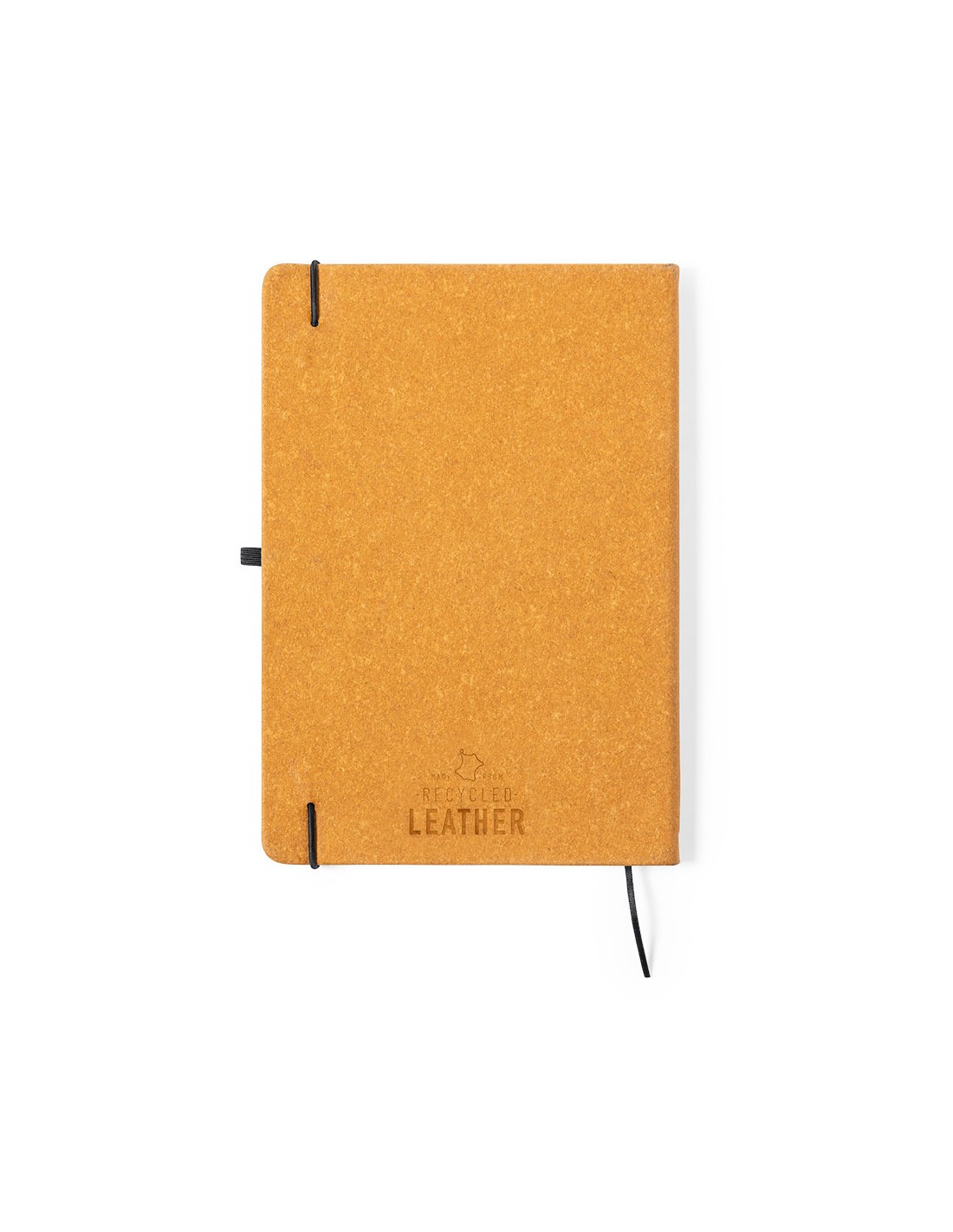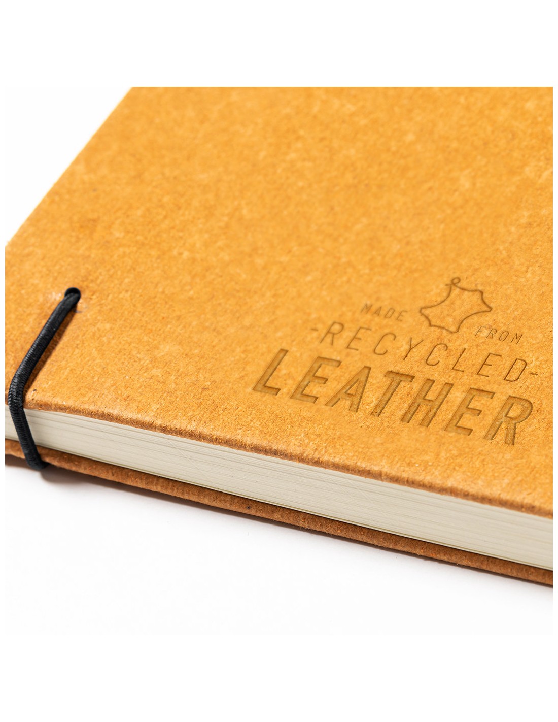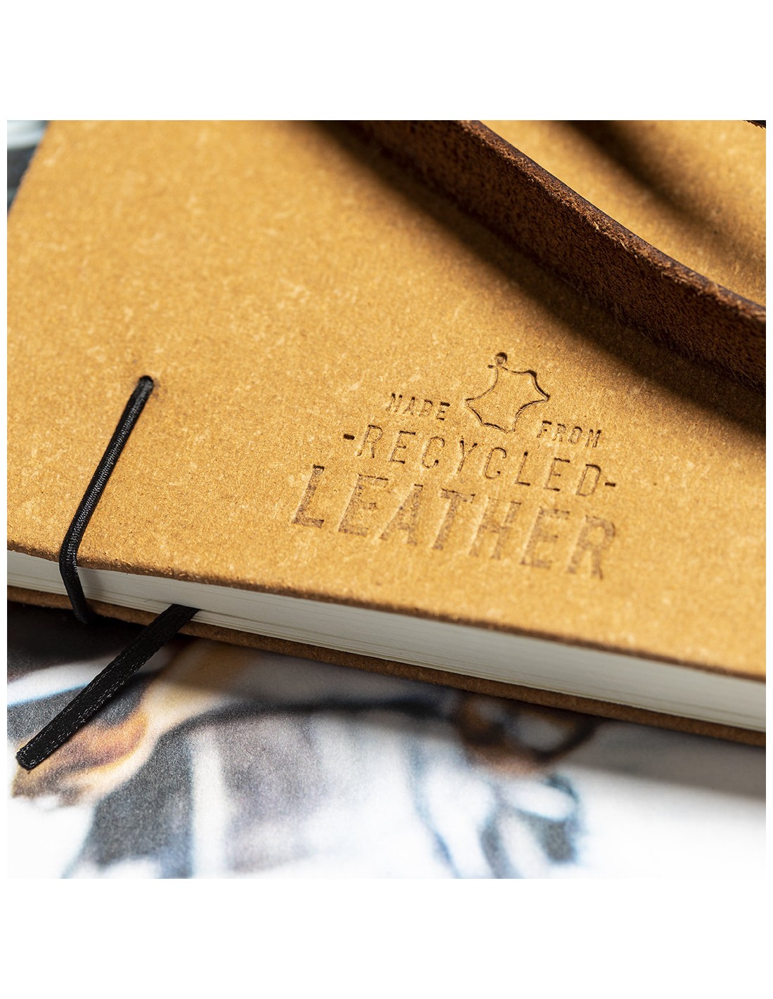 Bloc de notas de línea nature. Con tapas rígidas fabricadas en cuero reciclado, que rescata las fibras desechadas en los procesos de fabricación, minimizando el desperdicio de material, contribuyendo a reducir el impacto ambiental y manteniendo a la vez sus propiedades originales. Interior con 100 hojas de disposición a una raya. Incluye marcapáginas, elástico de cierre y soporte para bolígrafo a juego. Incluye distintivo cuero reciclado.