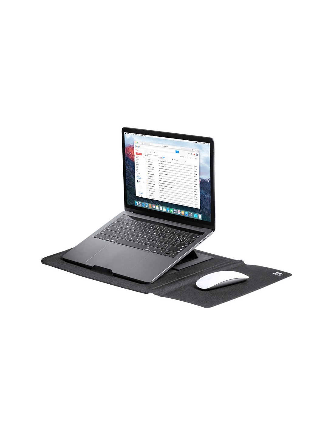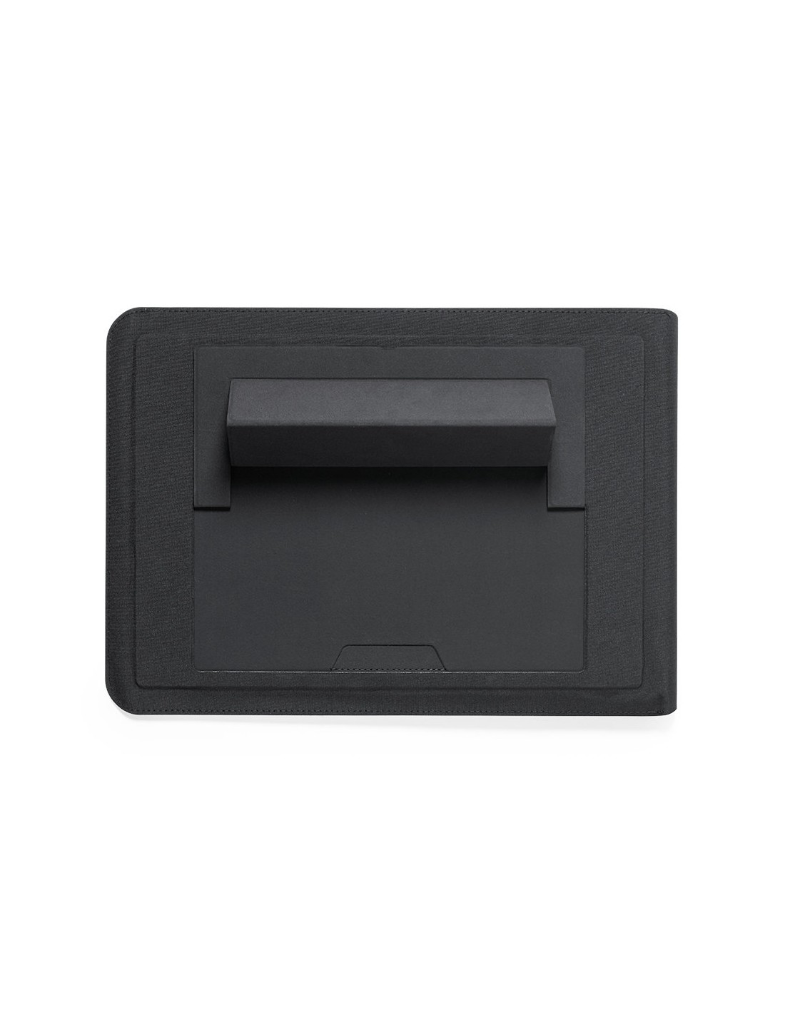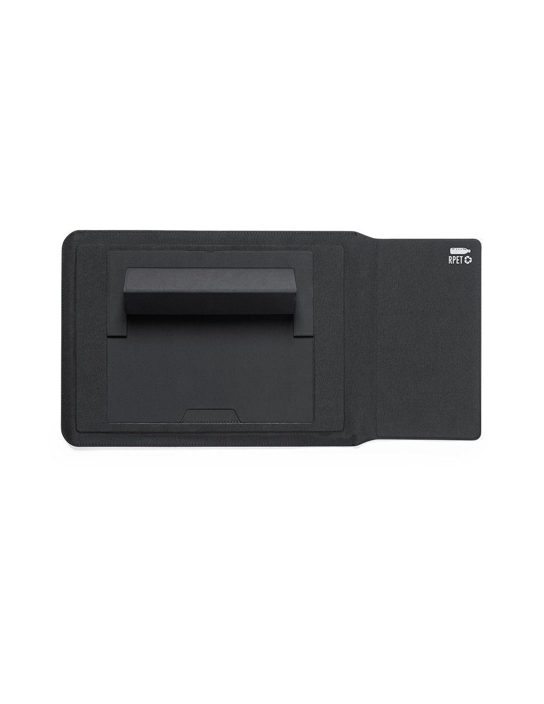 Funda de ordenador fabricada en poliéster 600D RPET, elaborado a partir de plástico reciclado, para así fomentar la reutilización de residuos plásticos y ayudar a la sostenibilidad del planeta. Con cierre magnético y distintivo RPET. Interior desplegable con alfombrilla para ratón y soporte inclinado para ordenador. Presentado en caja individual de diseño.