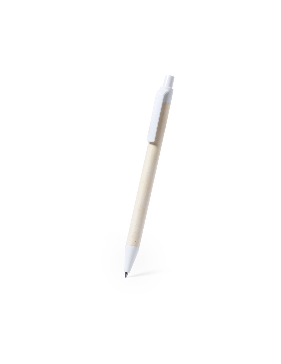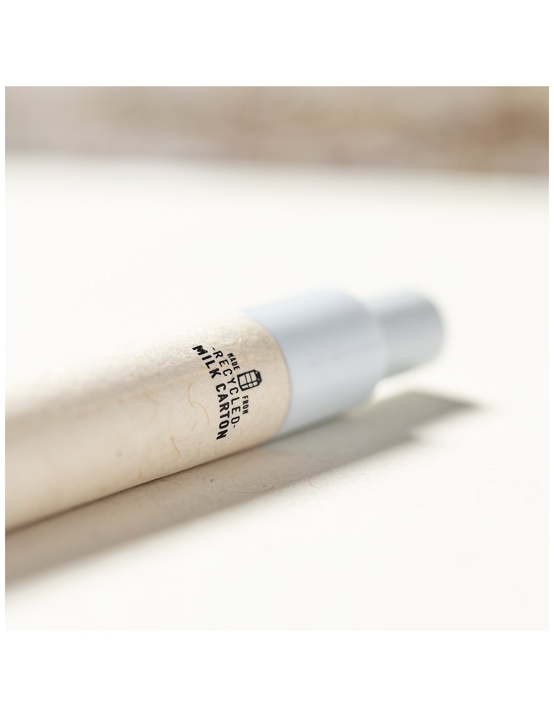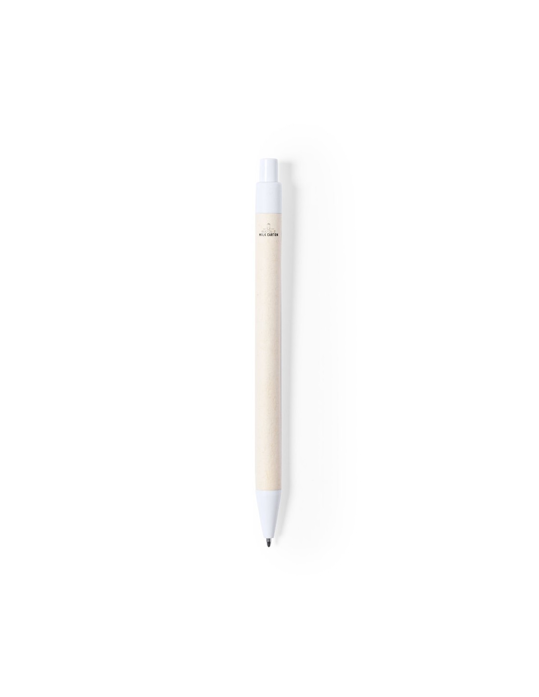 Bolígrafo de línea nature, con cuerpo fabricado con cartones de leche reciclados y detalles en color blanco. De mecanismo pulsador y en tinta azul, con distintivo cartón de leche reciclado en el cuerpo. Los cartones de leche se componen en su mayor parte de cartón y aluminio. Durante su proceso de reciclado, se separan los distintos materiales del envase para su reutilización y nuevo uso, contribuyendo así a recorrer el camino infinito de la economía circular. Este material se caracteriza por su alto grado de reciclabilidad, así como por su ligereza y resistencia.