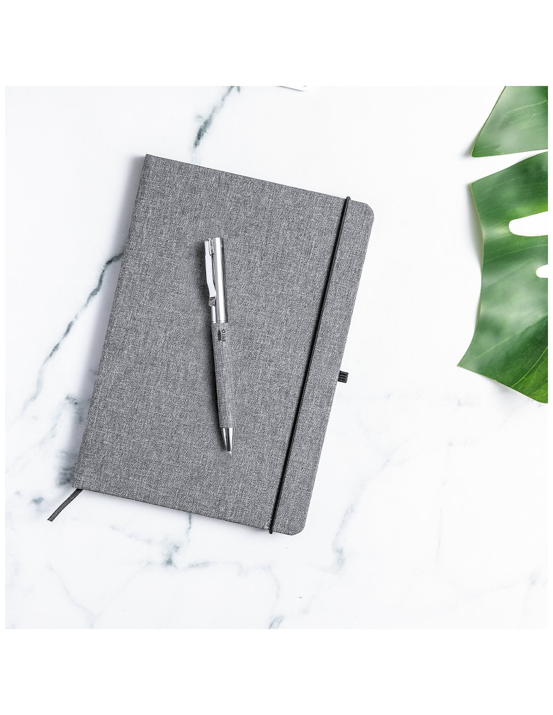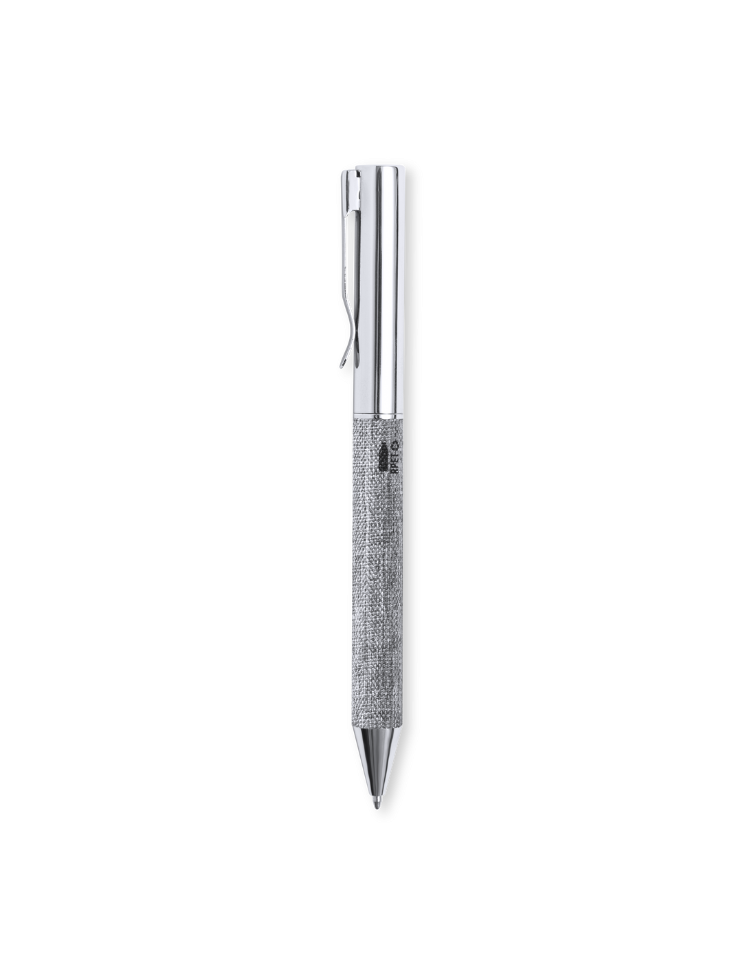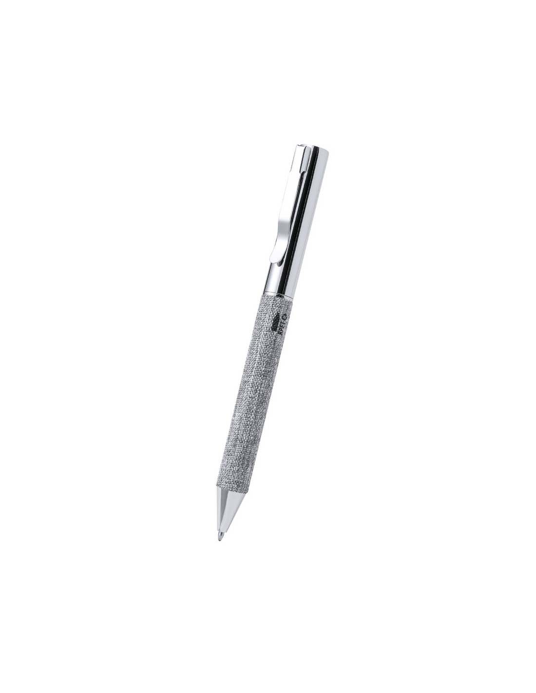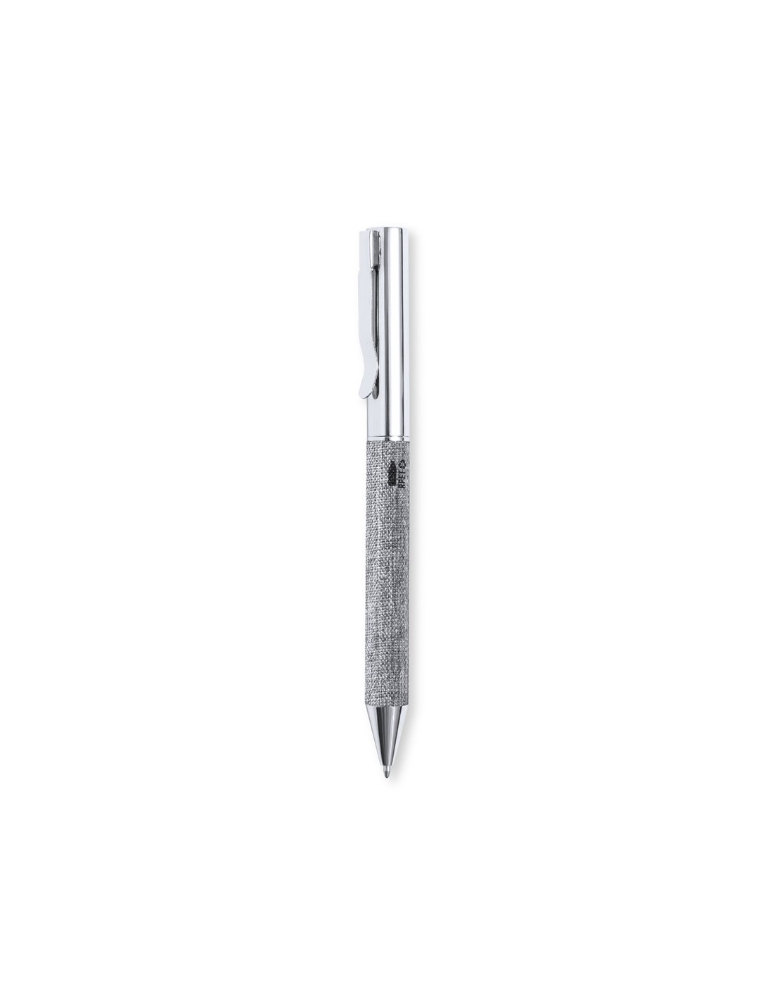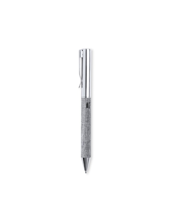 Bolígrafo fabricado en metal cromado y con cuerpo recubierto en poliéster RPET, elaborado a partir de plástico reciclado para así fomentar la reutilización de residuos plásticos y ayudar a la sostenibilidad del planeta. Elegante clip metálico y accesorios a juego, de mecanismo giratorio y en tinta azul. Con distintivo RPET en cuerpo y presentado estuche kraft con funda a juego.