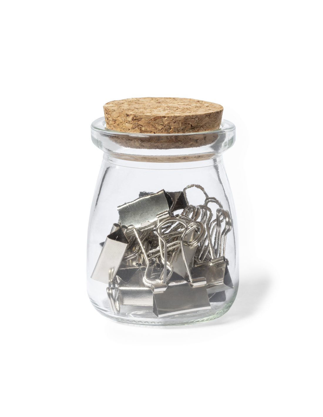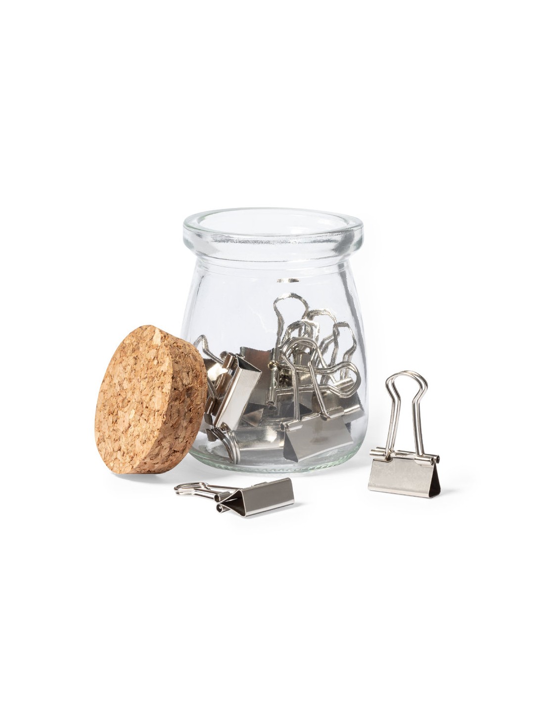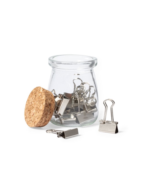 Portaclips fabricado en resistente cristal transparente, con original diseño vintage y tapón en corcho natural. Incluidos 15 clips metálicos, presentado en caja individual de cartón kraft.