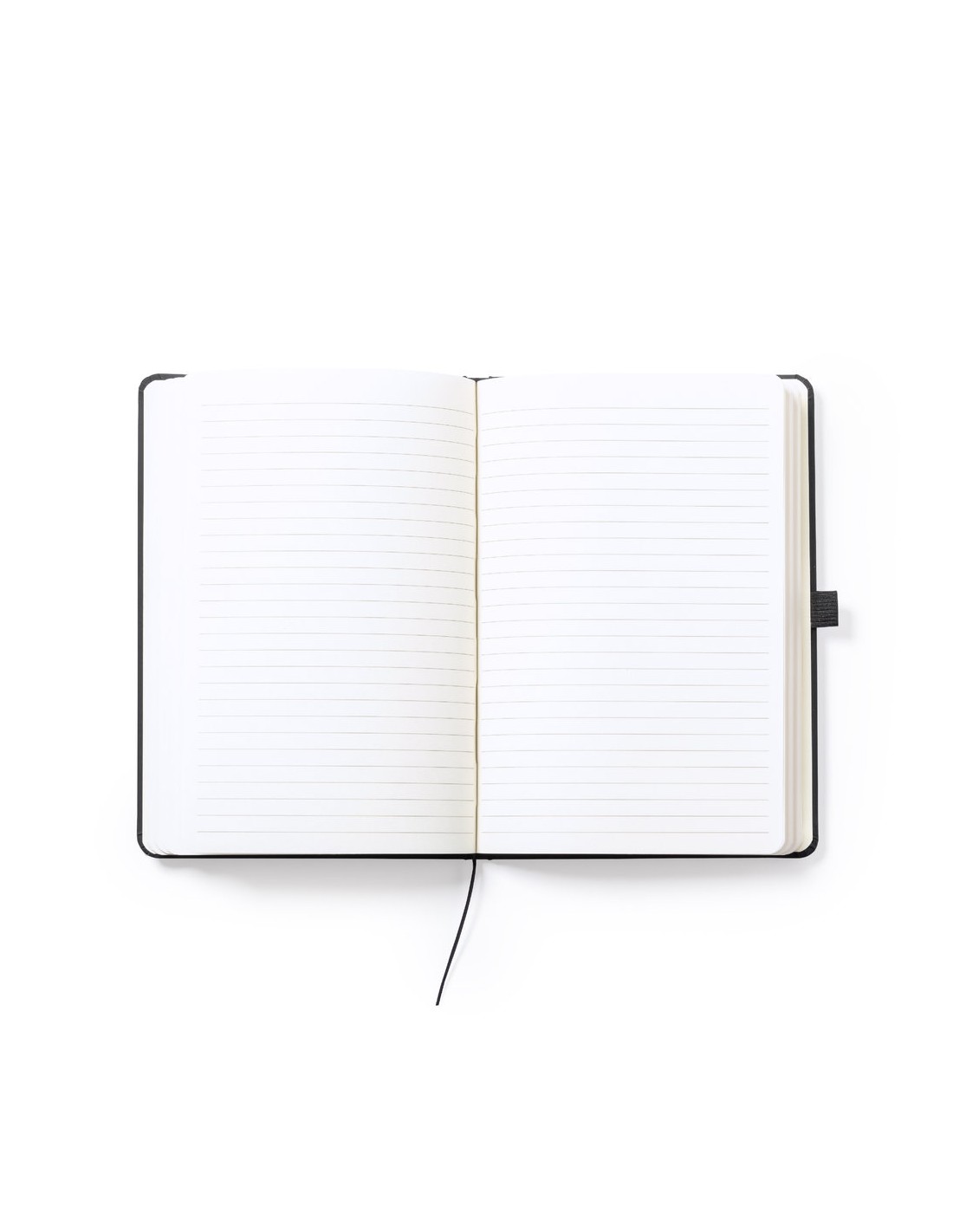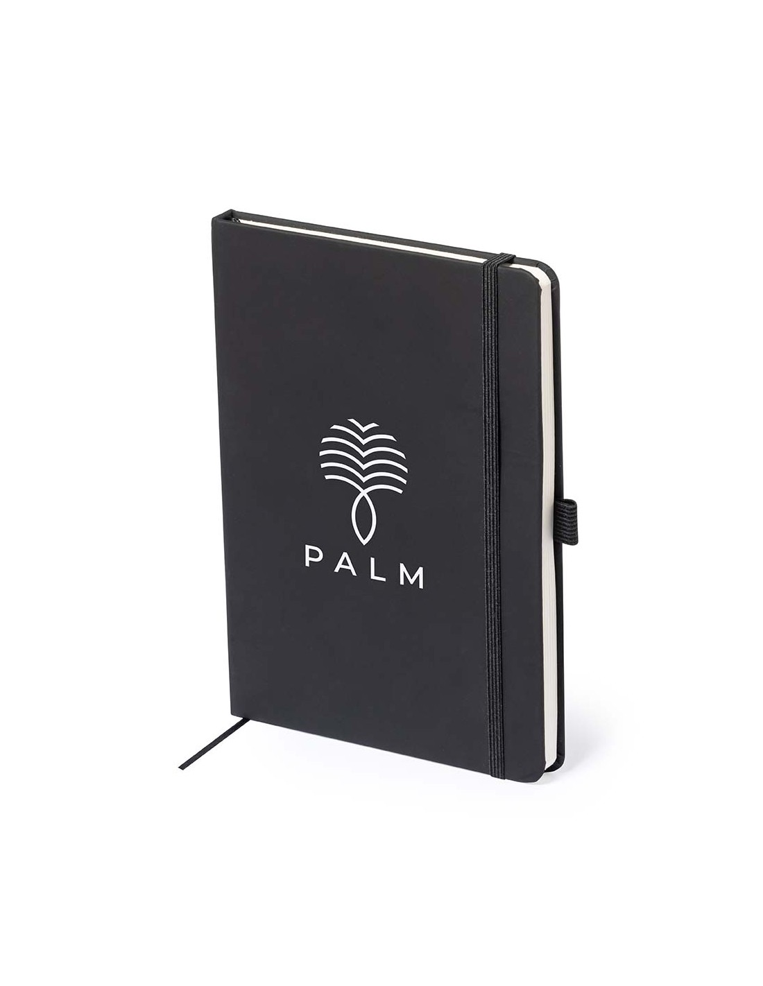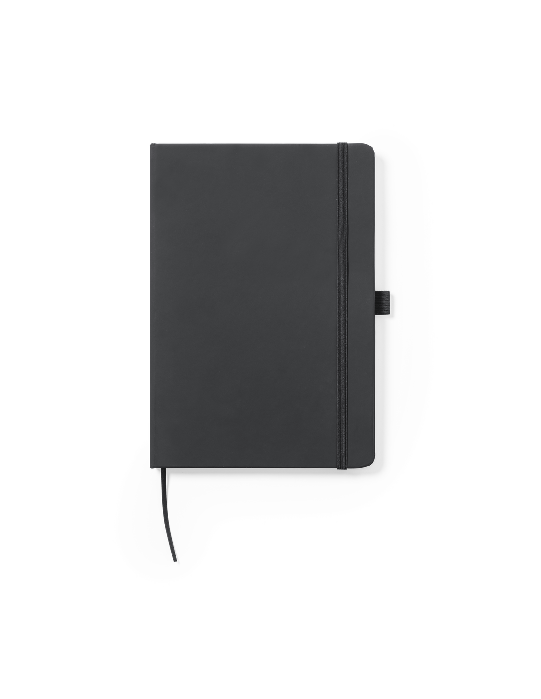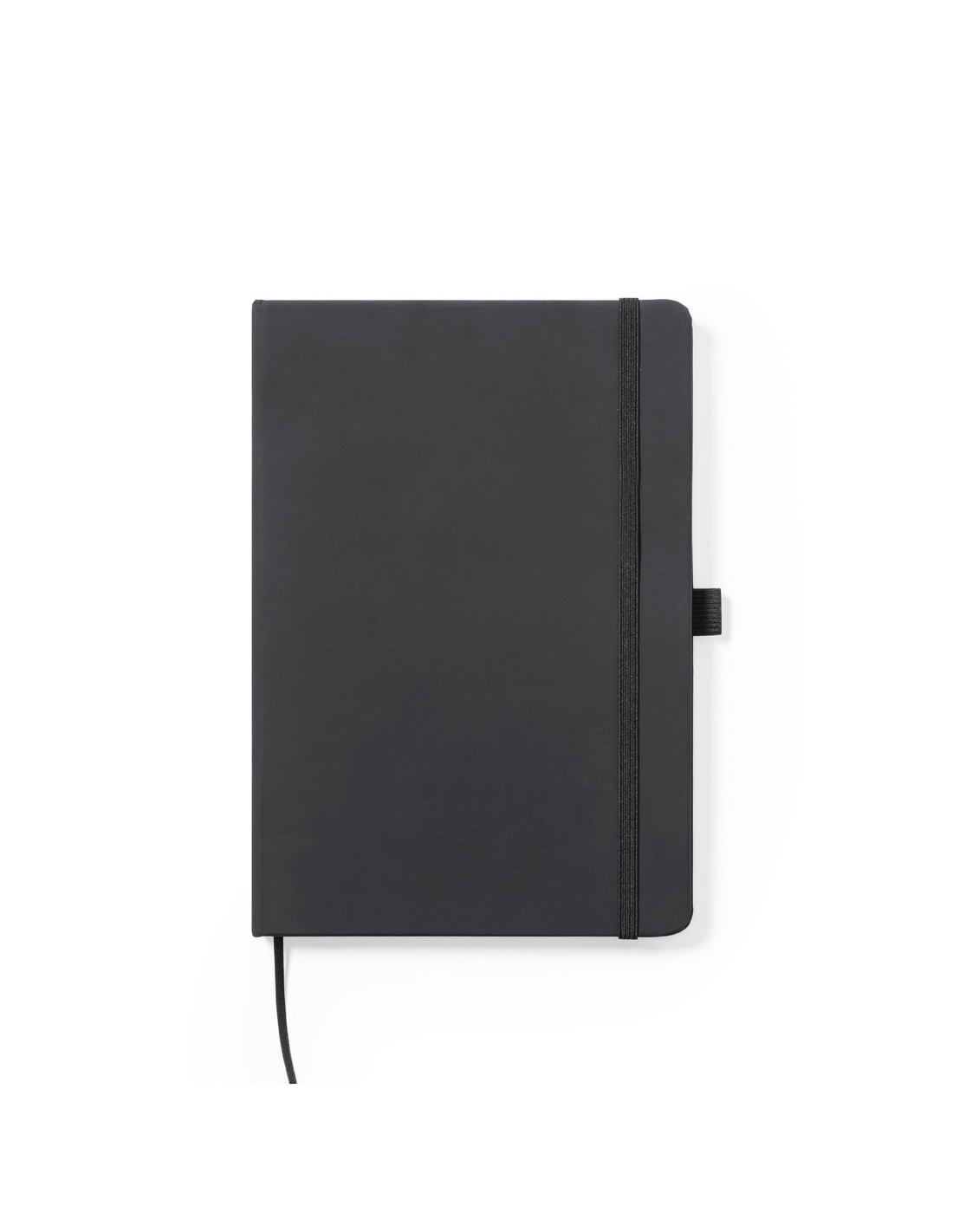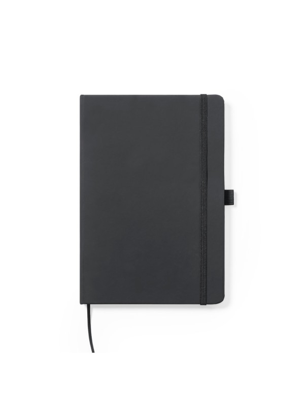 Bloc de notas fabricado en polipiel de elegante acabado en negro. Con tapas duras, marcapáginas y elástico de sujeción a juego. Interior con 100 hojas de disposición a 1 raya y soporte para bolígrafo (bolígrafo no incluido).