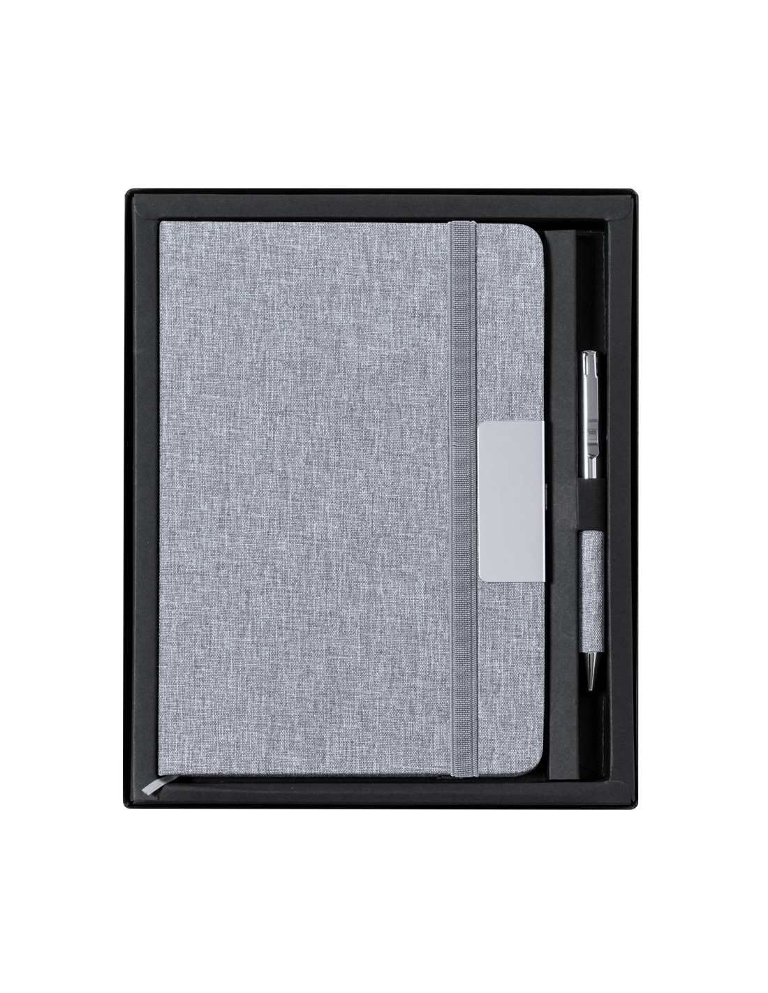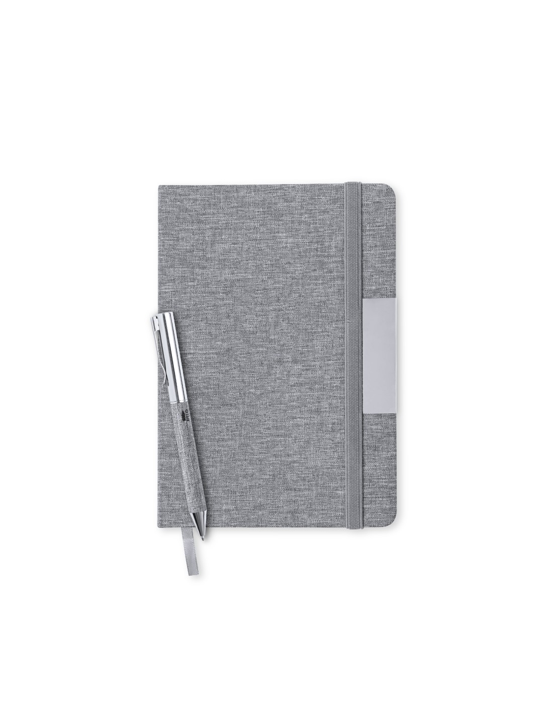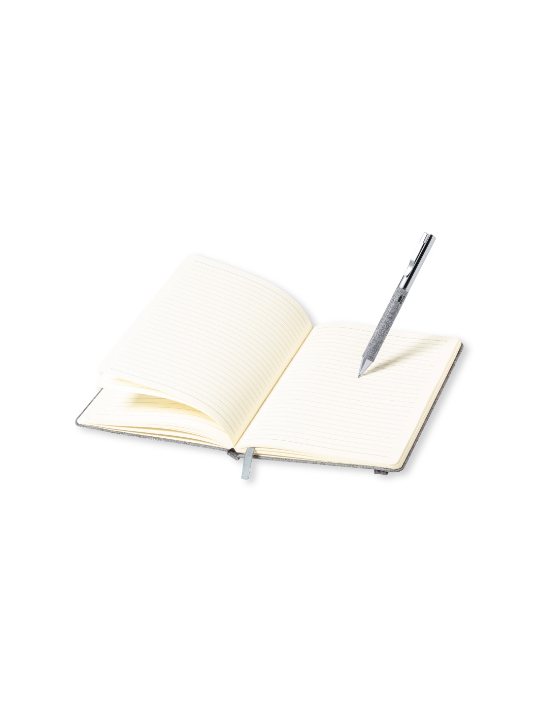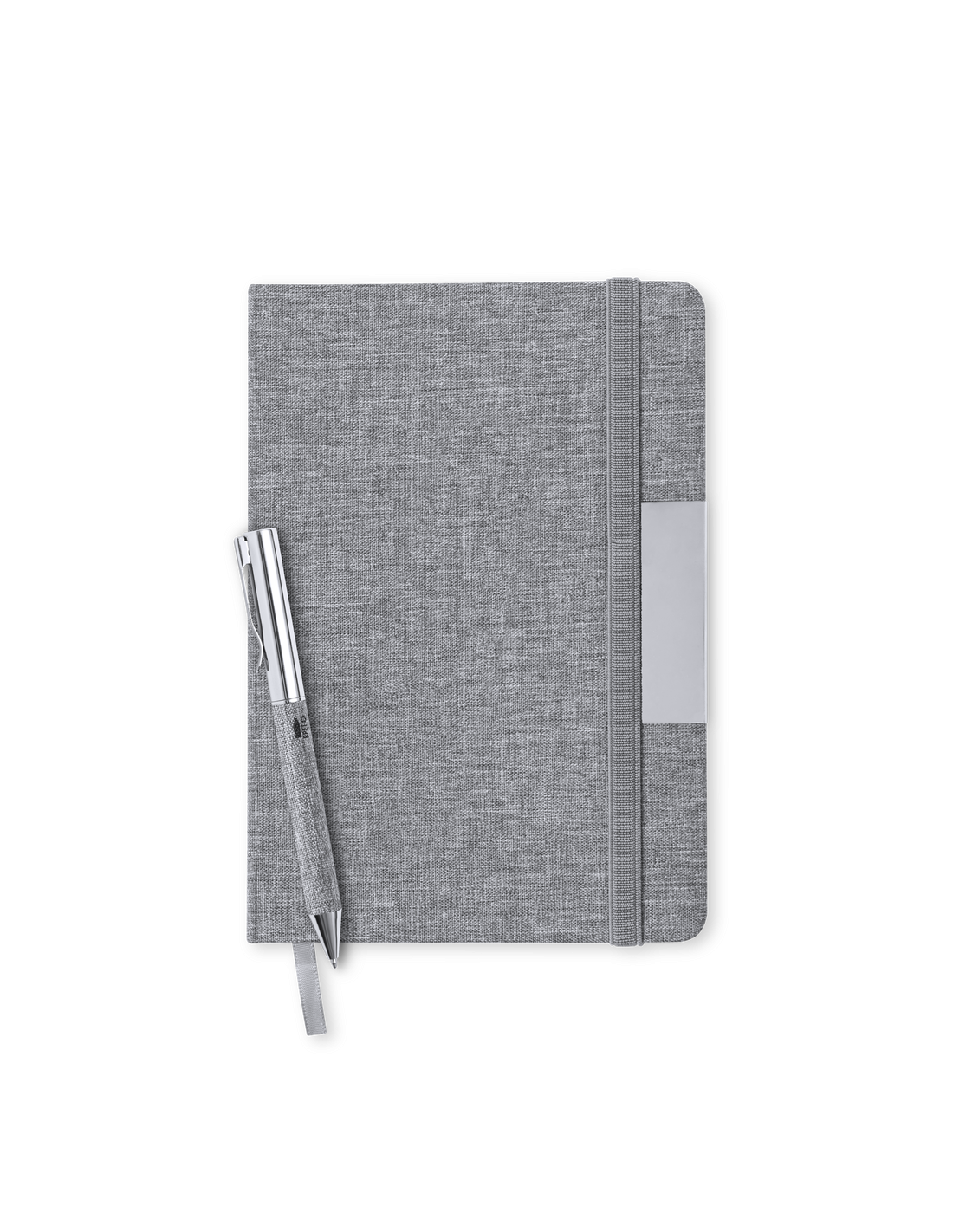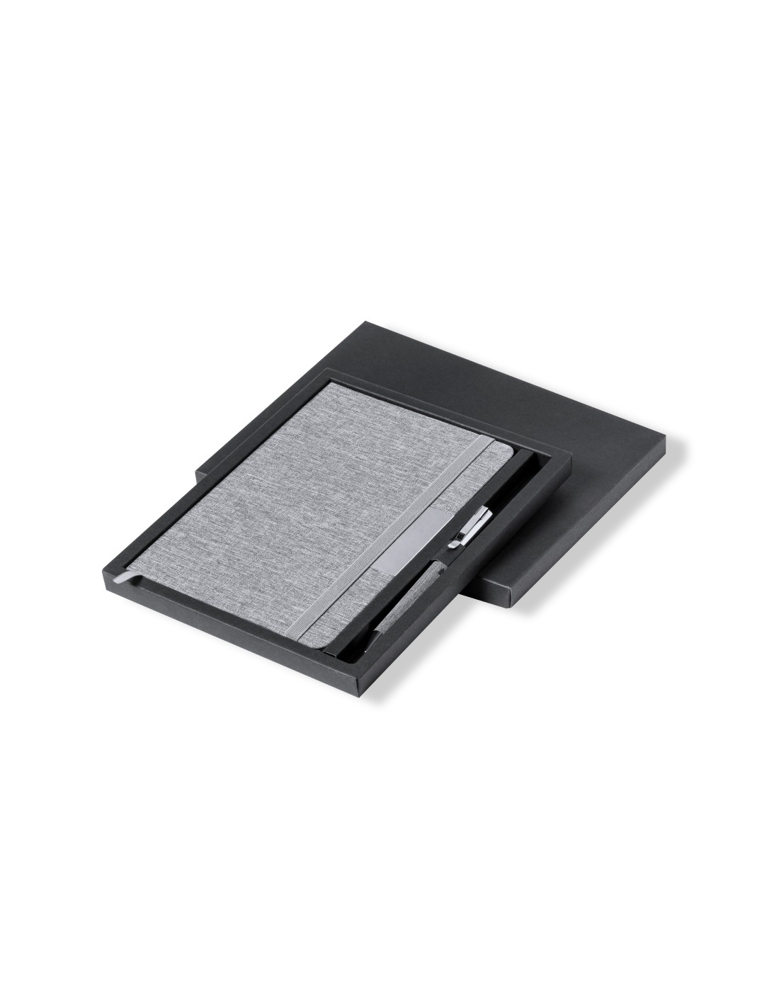 Set de bloc de notas y bolígrafo en RPET, elaborado a partir de plástico reciclado para así fomentar la reutilización de residuos plásticos y ayudar a la sostenibilidad del planeta. Incluye: Bloc de notas de tapas rígidas, con detalle metálico en la portada, marcapáginas de tela y elástico de sujeción a juego. 100 hojas interiores con disposición a una raya y distintivo RPET.Bolígrafo fabricado en metal cromado y con cuerpo recubierto en poliéster RPET. Elegante clip metálico y accesorios a juego, de mecanismo giratorio y en tinta azul. Con distintivo RPET en cuerpo.Set presentado en elegante estuche de diseño en color negro, con compartimento independiente para bloc de notas y bolígrafo.