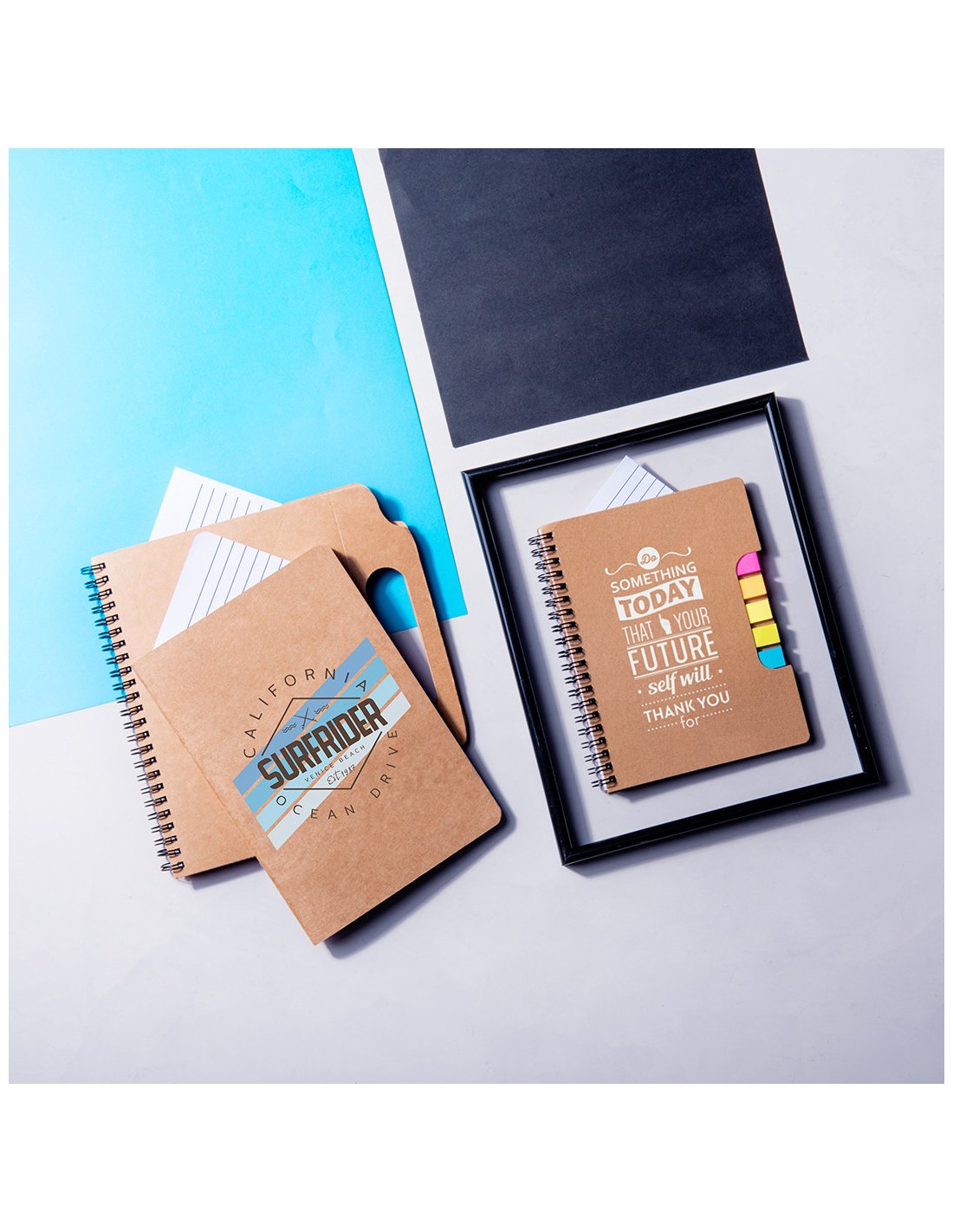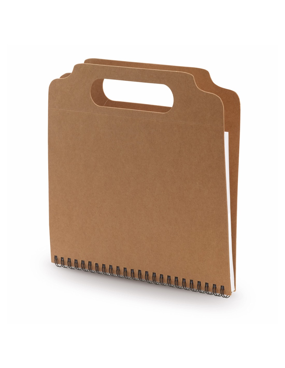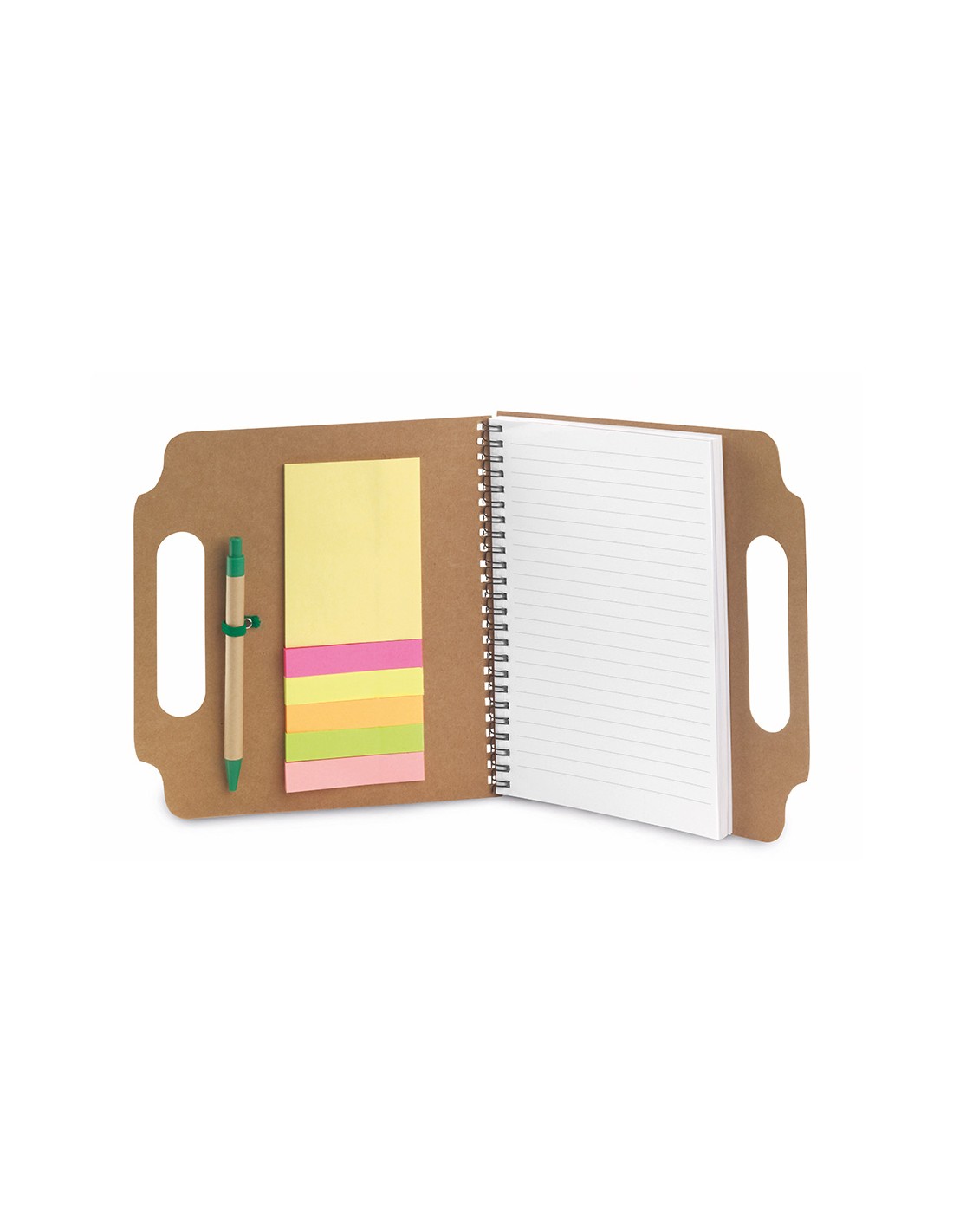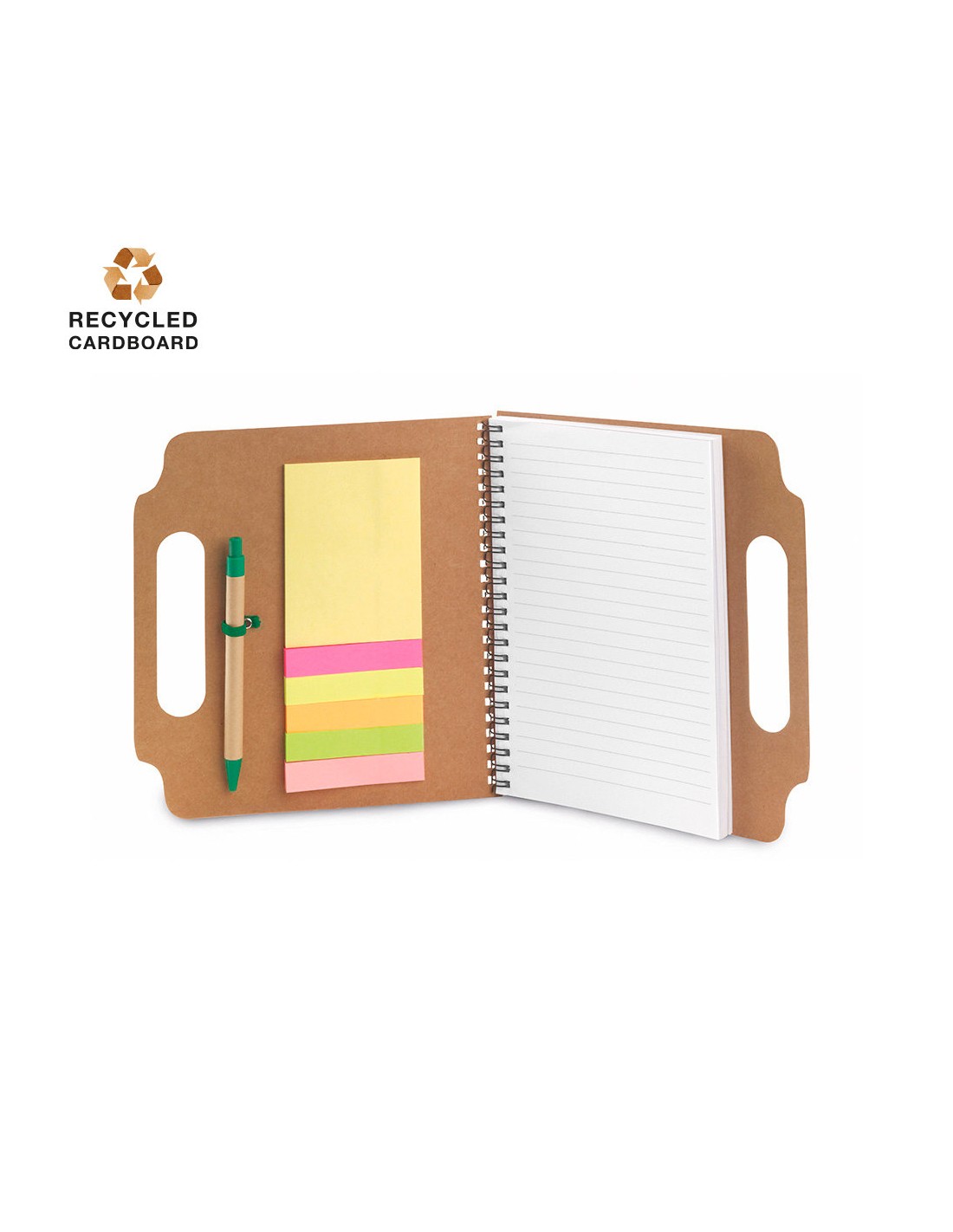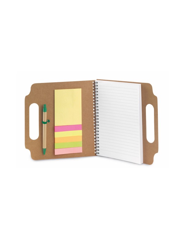 Bloc de notas adhesivas de anillas con bolígrafo de cartón reciclado incluido. De original diseño, con asas de transporte troqueladas y tapas de suave tacto acabadas en resistente cartón reciclado rígido. Con soporte para bolígrafo integrado, incluye bloc de 70 hojas con lineas horizontales, 25 notas adhesivas medianas y 125 mini notas adhesivas.