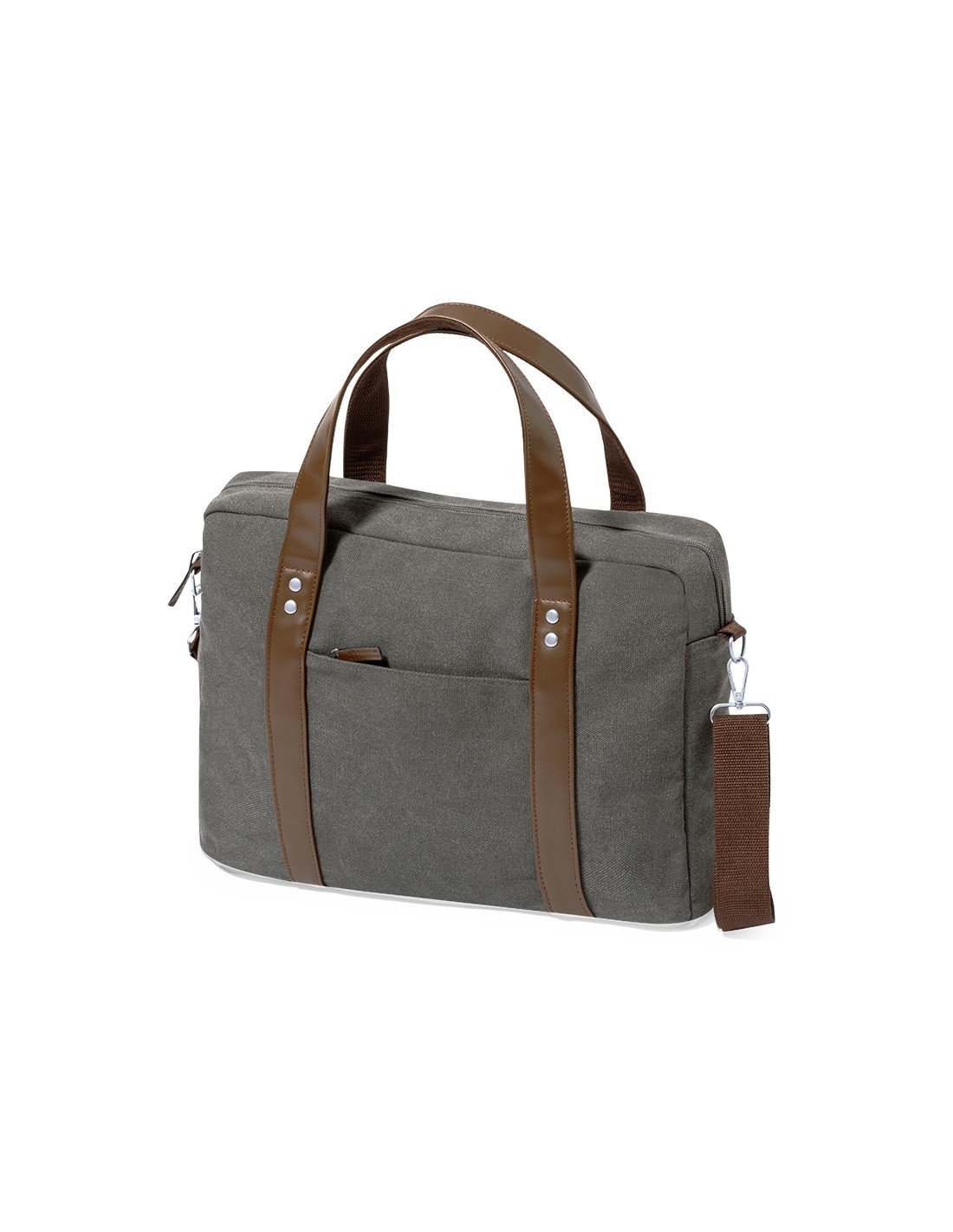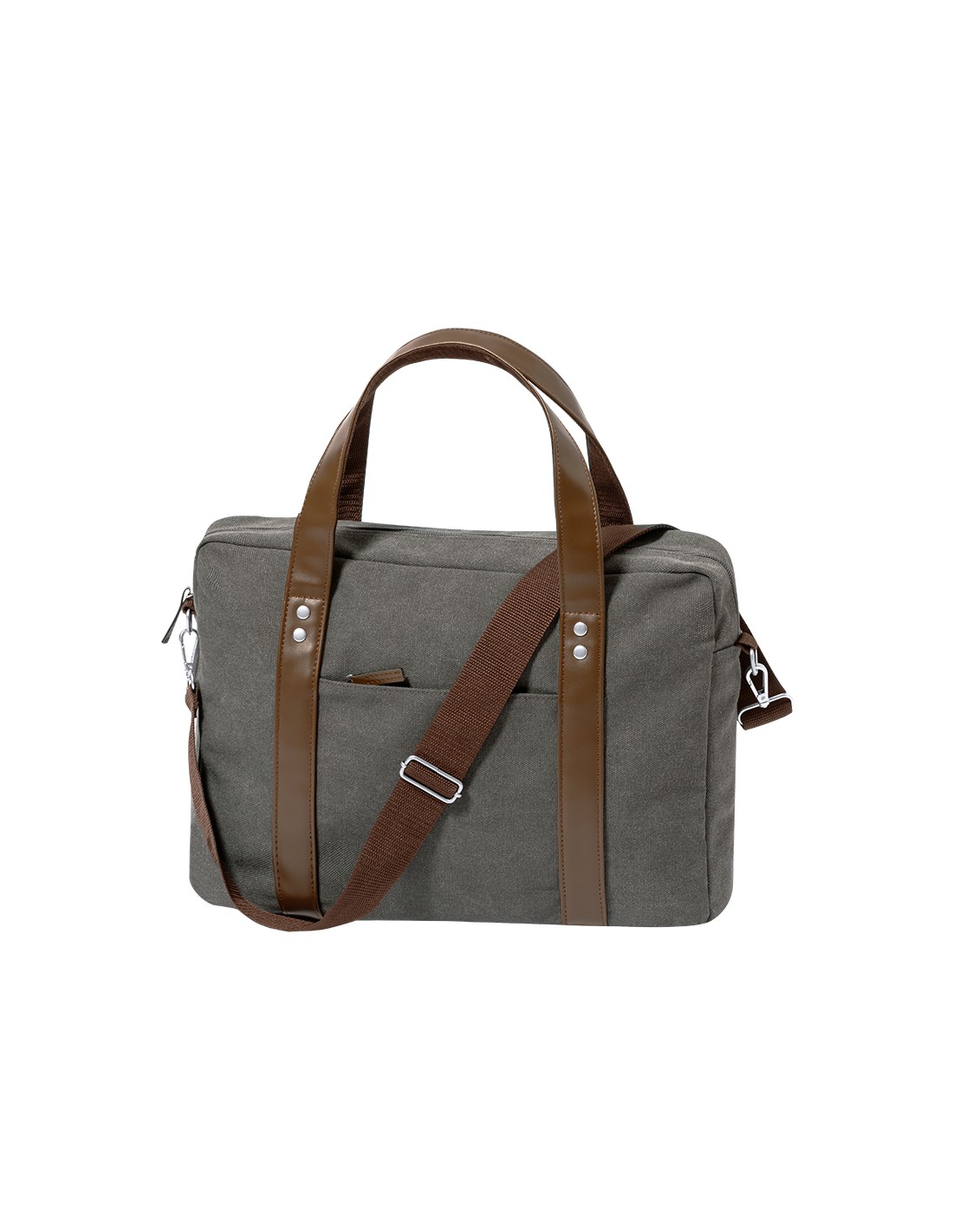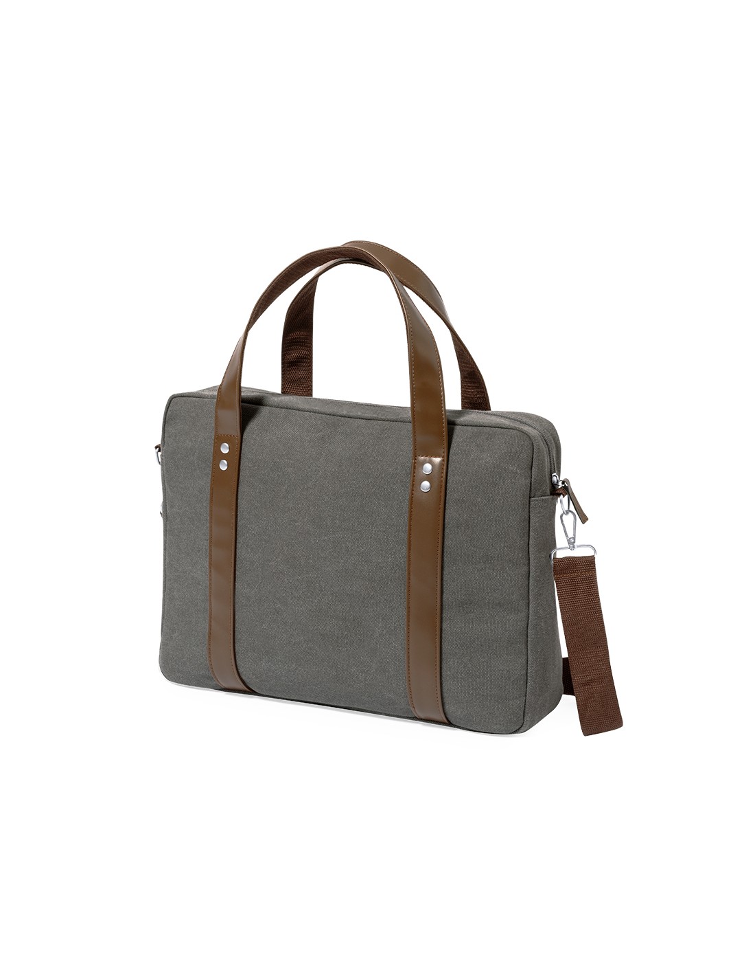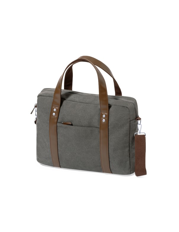 Portadocumentos bandolera de diseño atemporal, fabricado en resistente canvas de 475 g/m2, color gris, con cintas en polipiel y práctica cinta para hombro ajustable. Interior acolchado con compartimento ordenador portátil de hasta 15 pulgadas. Incluye práctico bolsillo en el exterior. Presentado en bolsa individual reciclada.