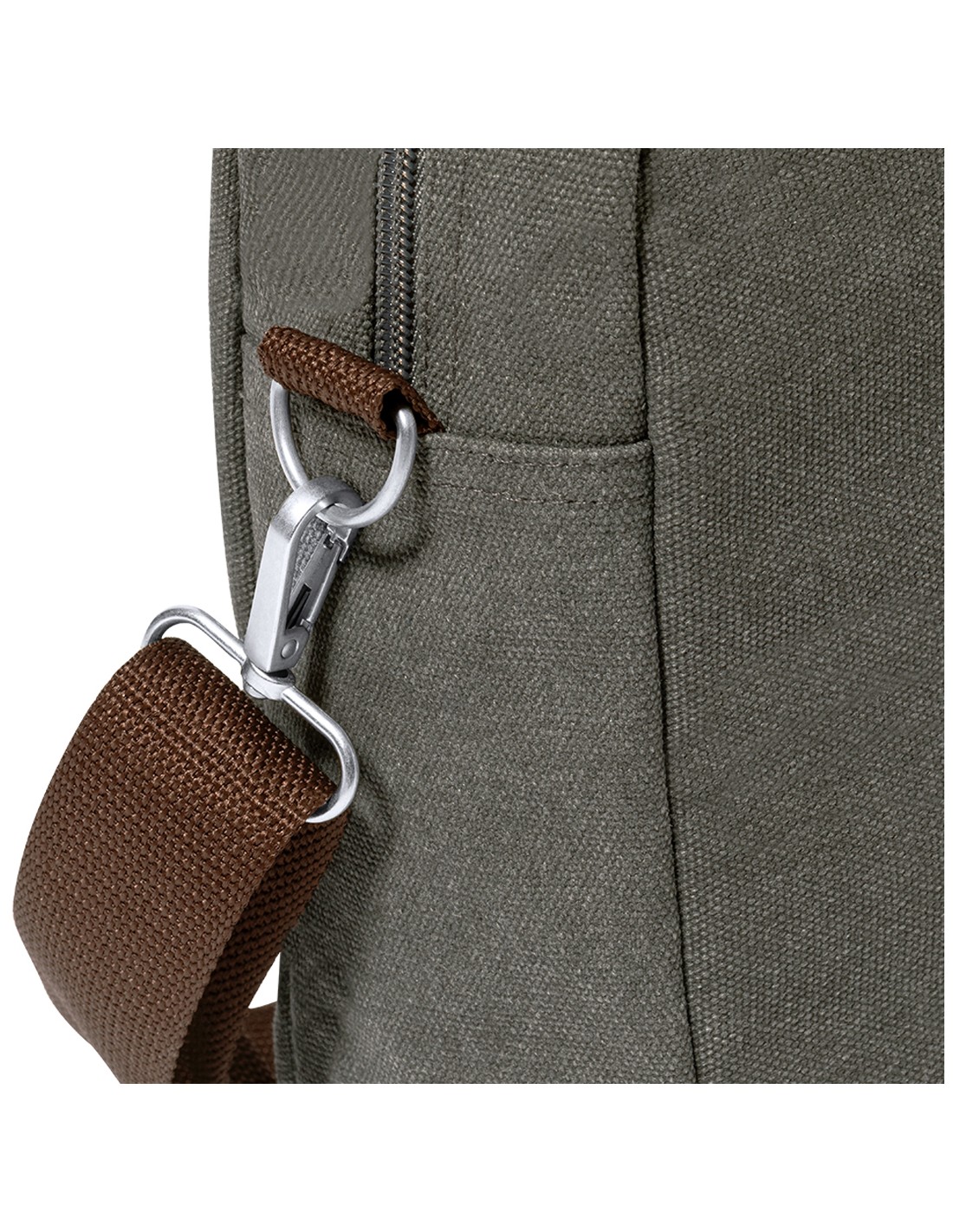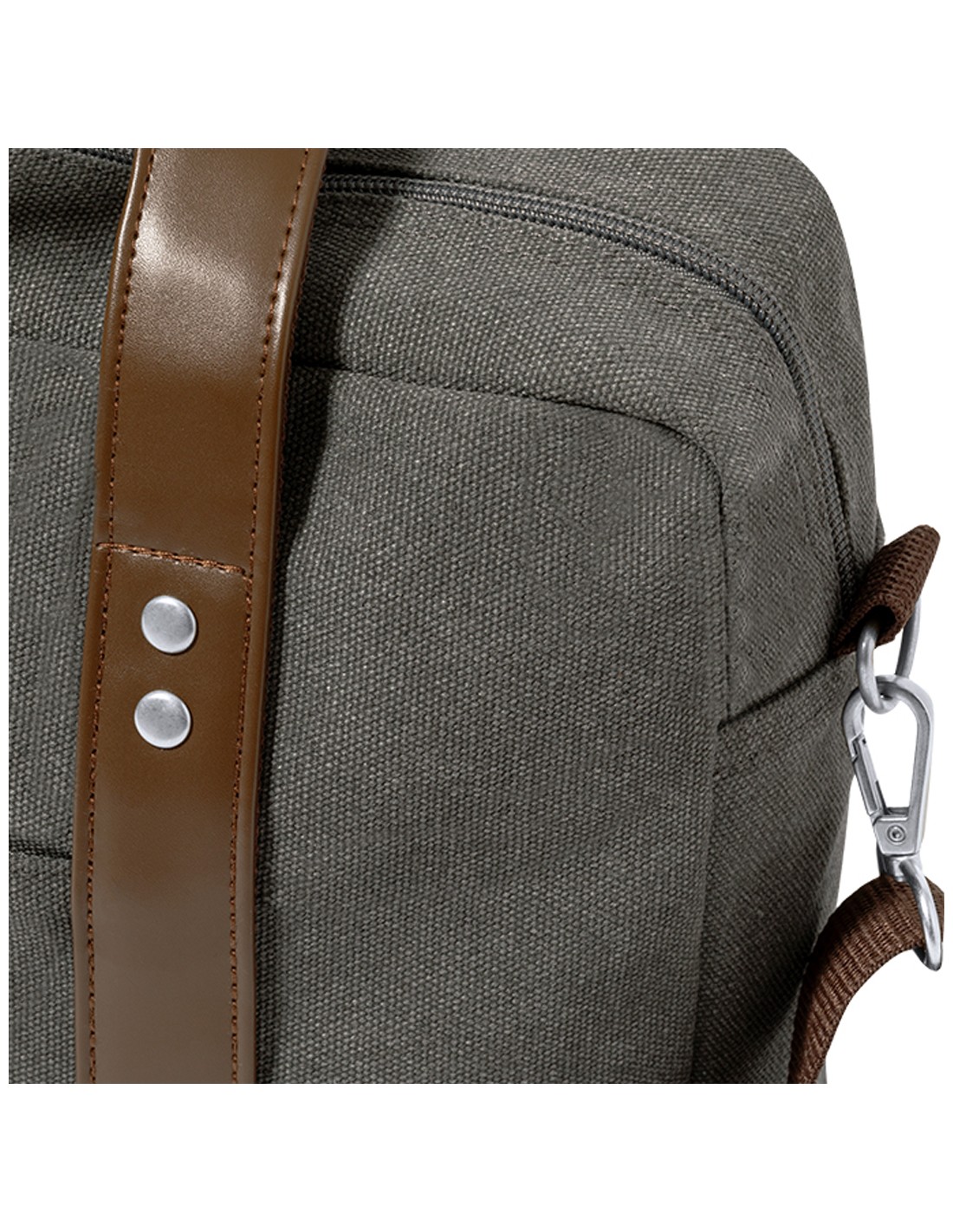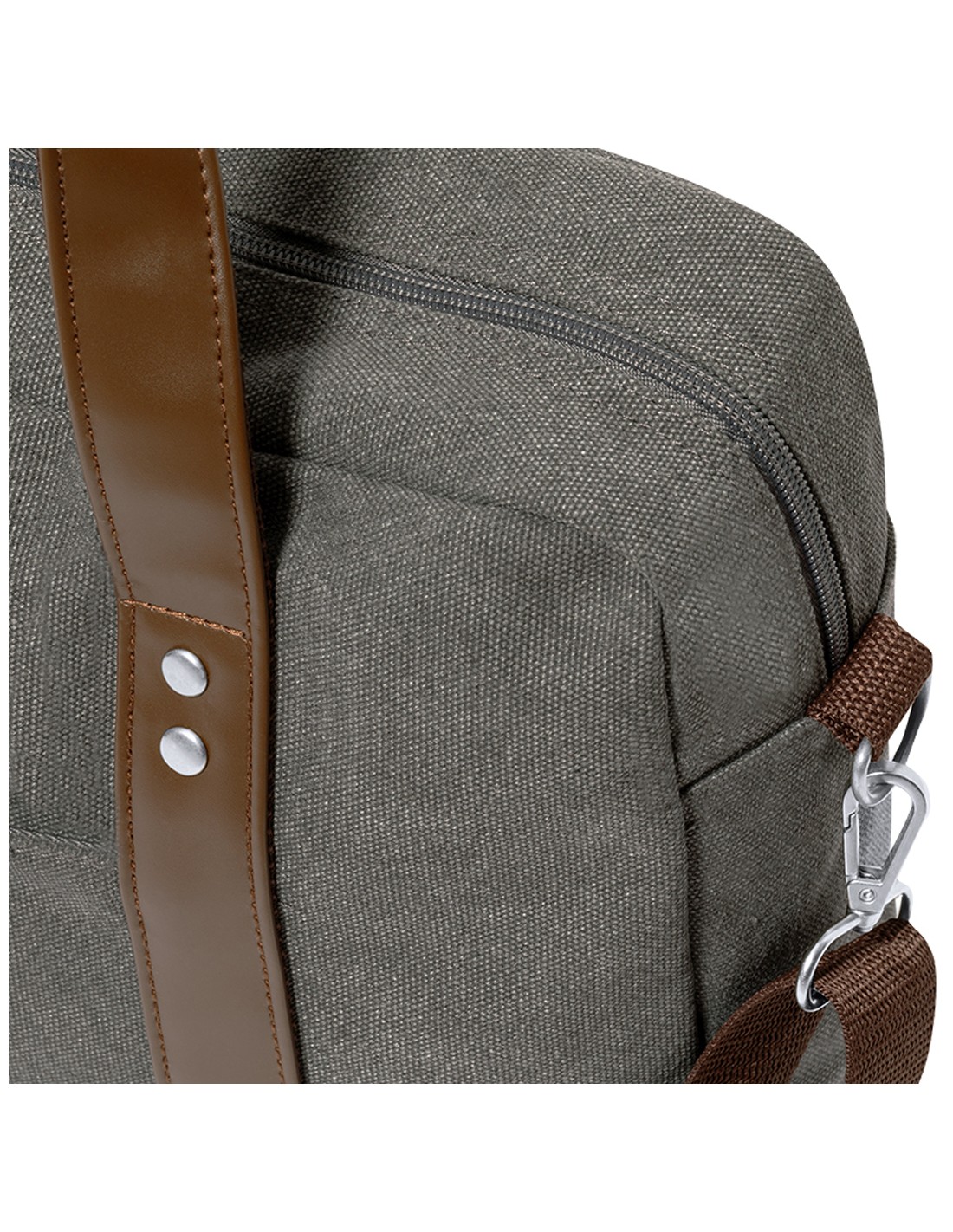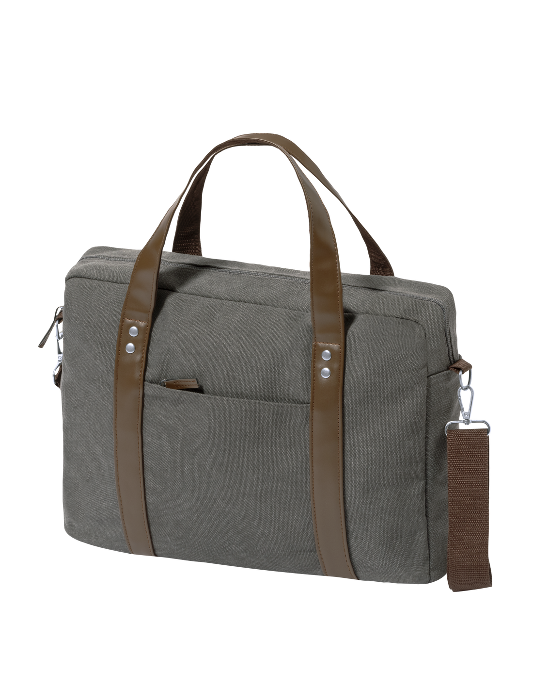 Portadocumentos bandolera de diseño atemporal, fabricado en resistente canvas de 475 g/m2, color gris, con cintas en polipiel y práctica cinta para hombro ajustable. Interior acolchado con compartimento ordenador portátil de hasta 15 pulgadas. Incluye práctico bolsillo en el exterior. Presentado en bolsa individual reciclada.