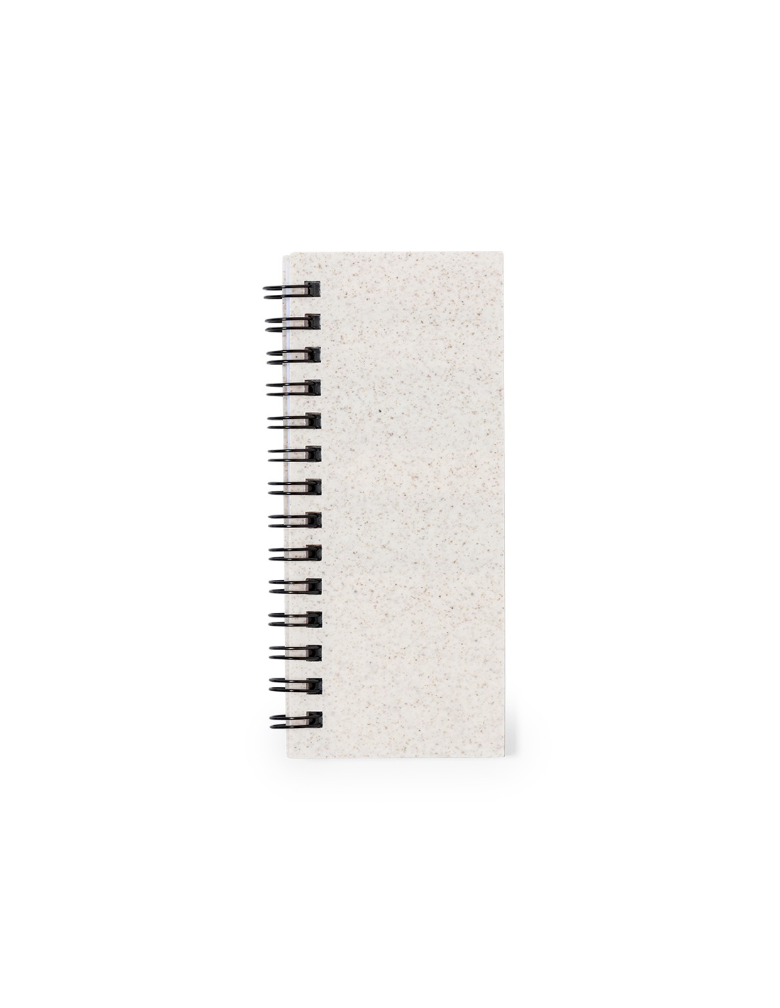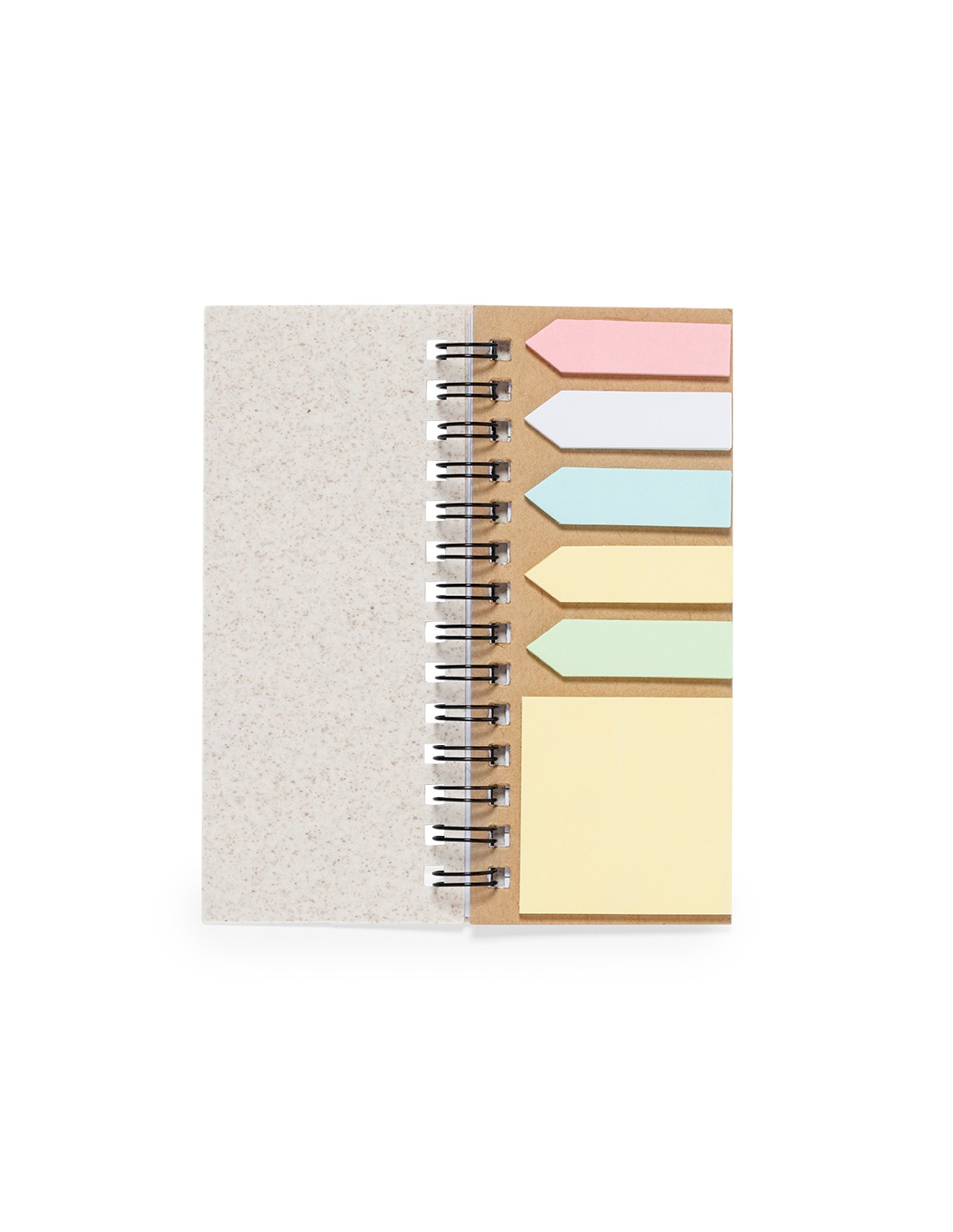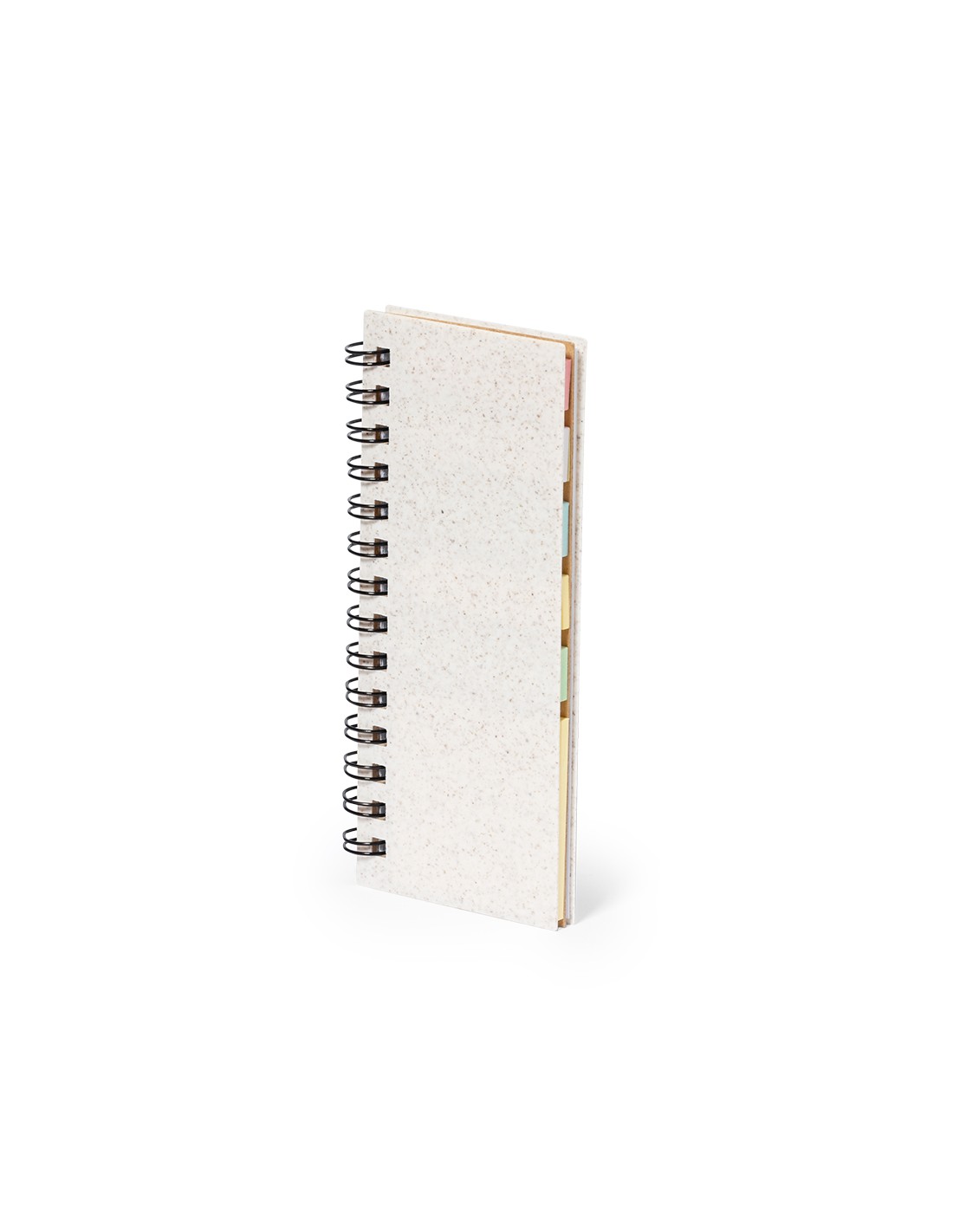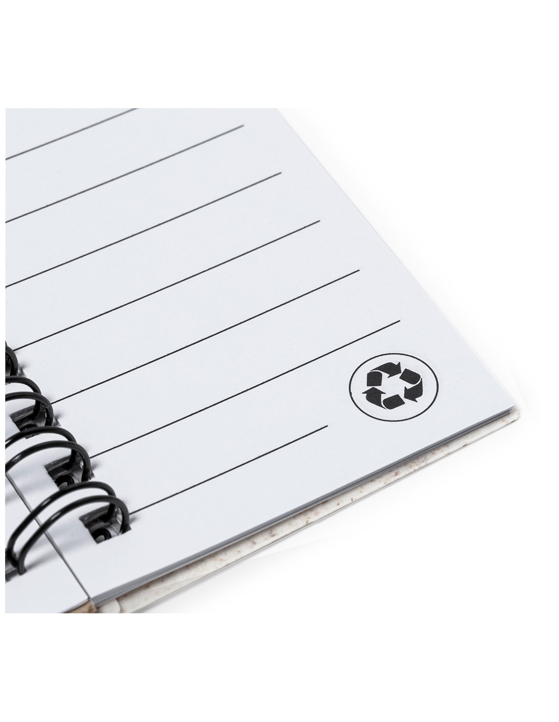 Bloc de notas con tapas en fibra de trigo. Con distintivo wheat straw en la contraportada. Incluye:Bloc de anillas de 30 hojas blancas con disposición a una raya y distintivo reciclado por ambas caras.25 notas adhesivas medianas.125 mininotas adhesivas en varios colores. Elaborado con elementos vegetales para así fomentar la utilización de materias primas naturales y reducir las emisiones contaminantes.Presentado en bolsa individual reciclada.