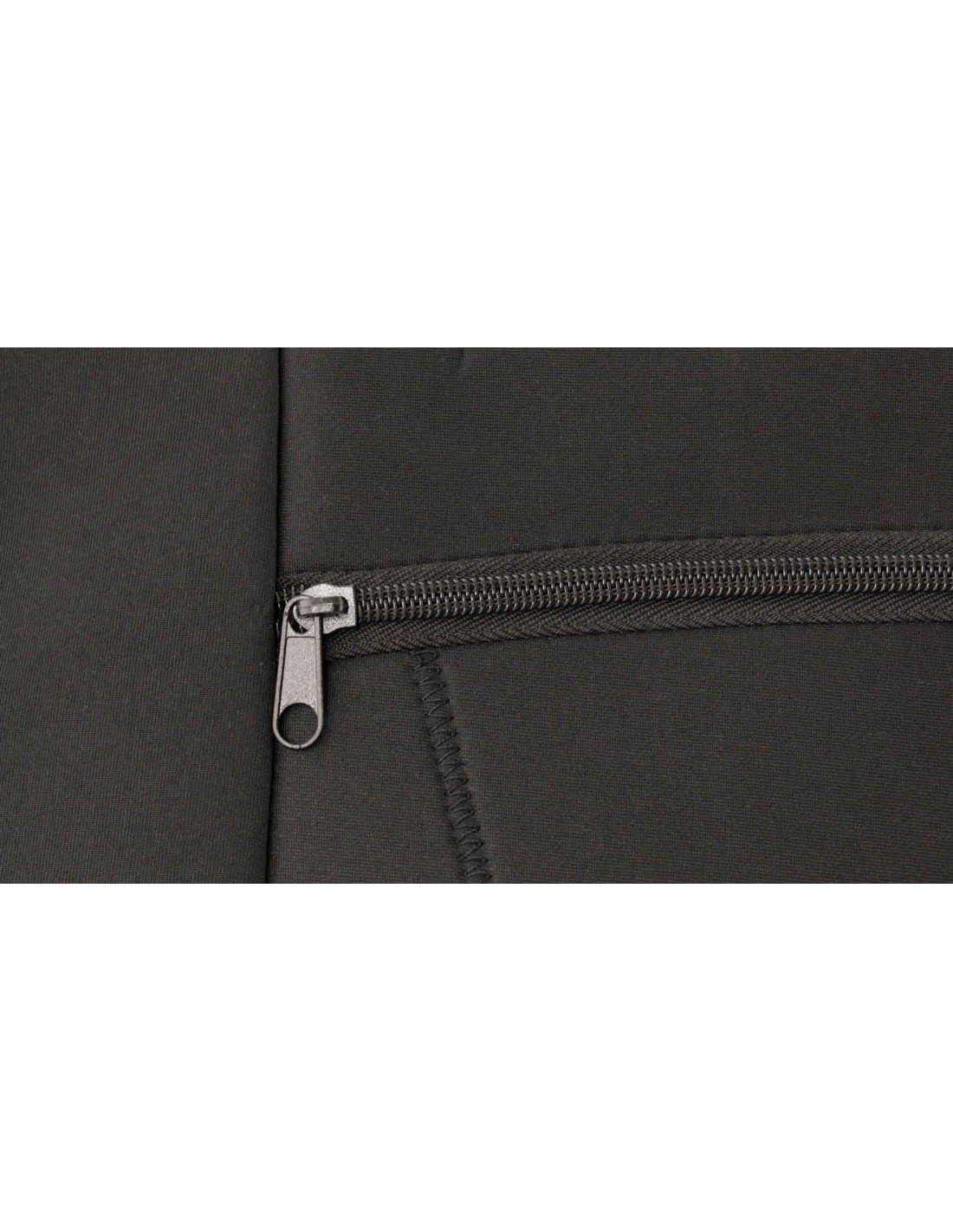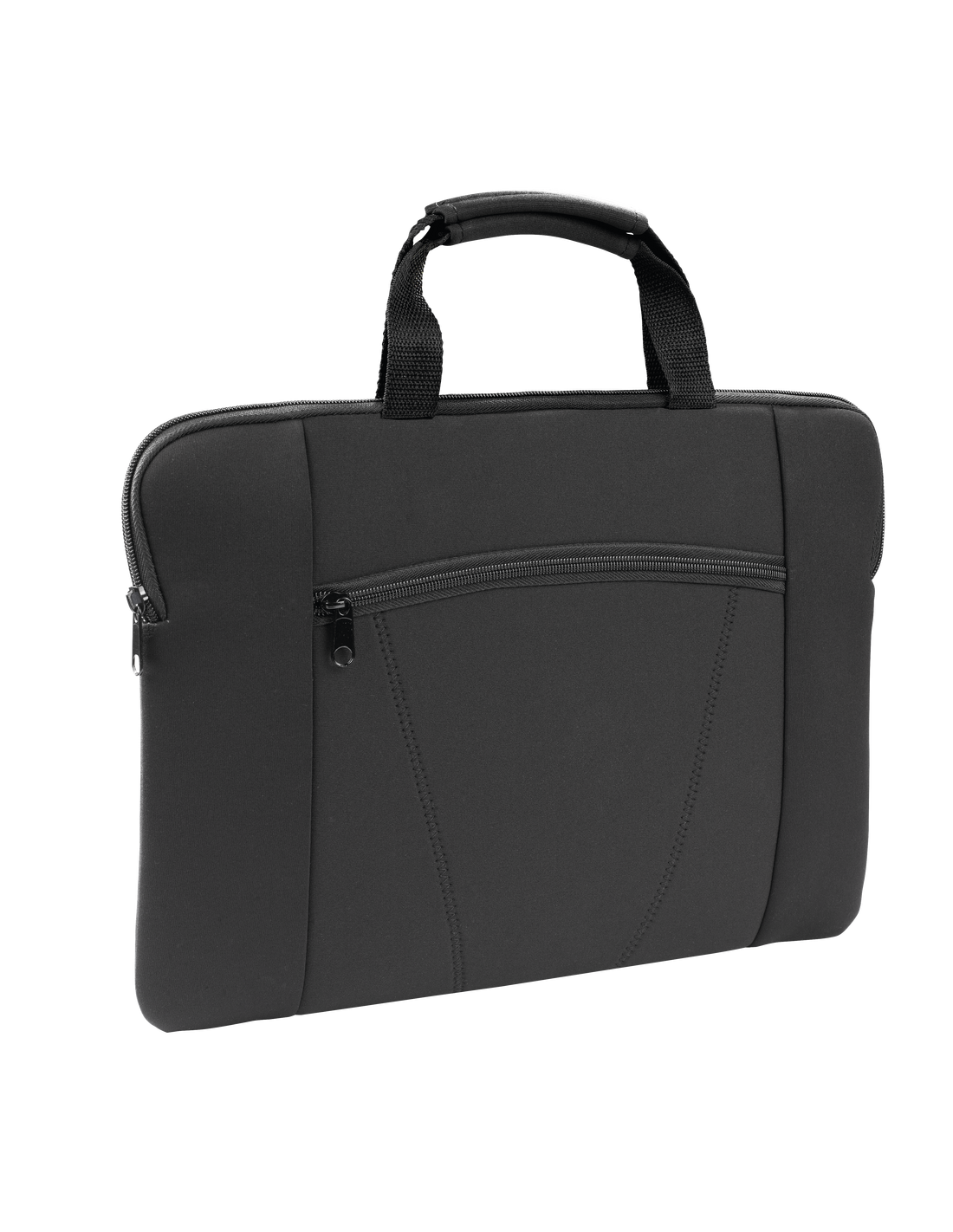 Resistente portadocumentos de soft shell con cierre de cremallera y bolsillo frontal. En elegante acabado de color negro y refuerzos en color en las asas.