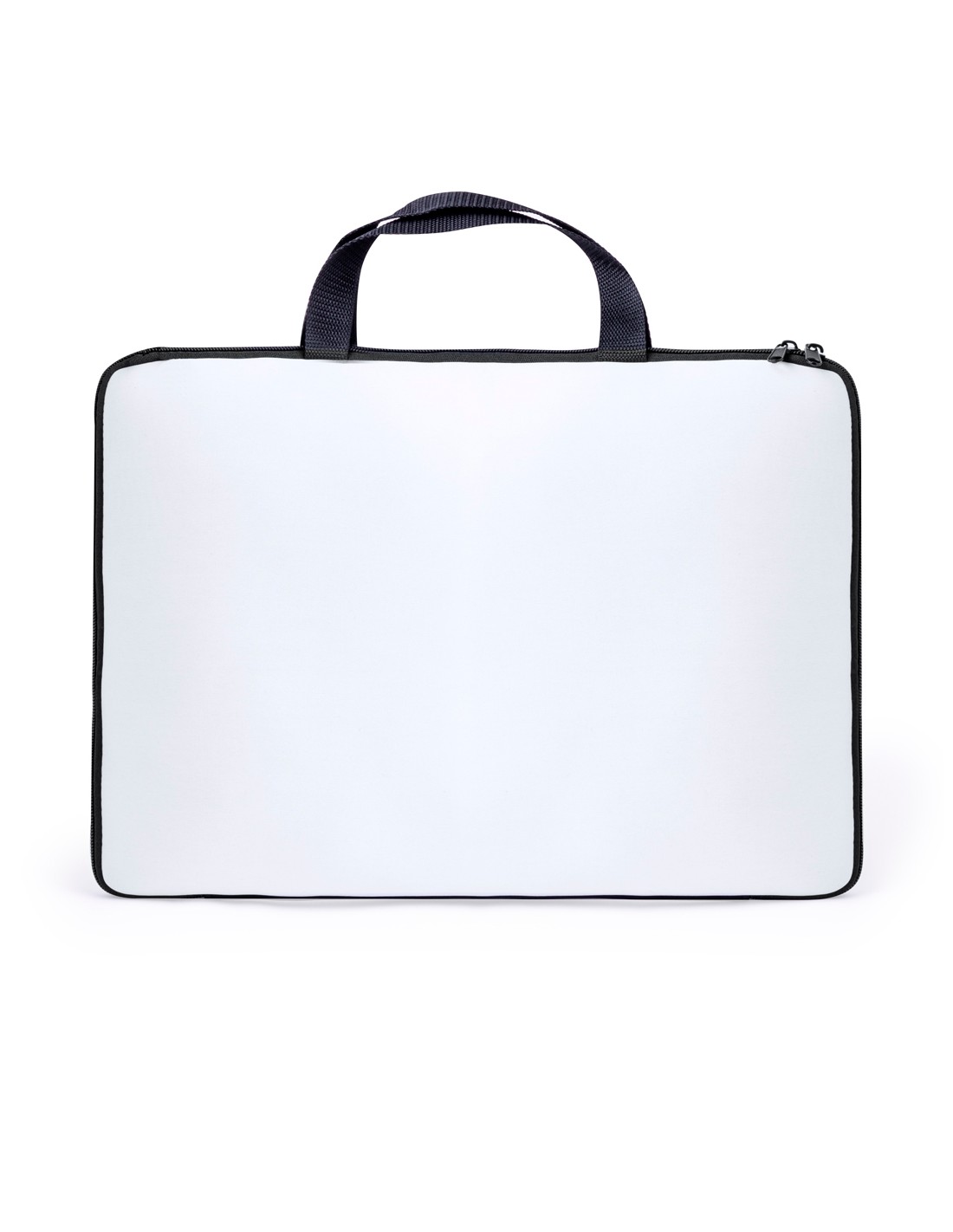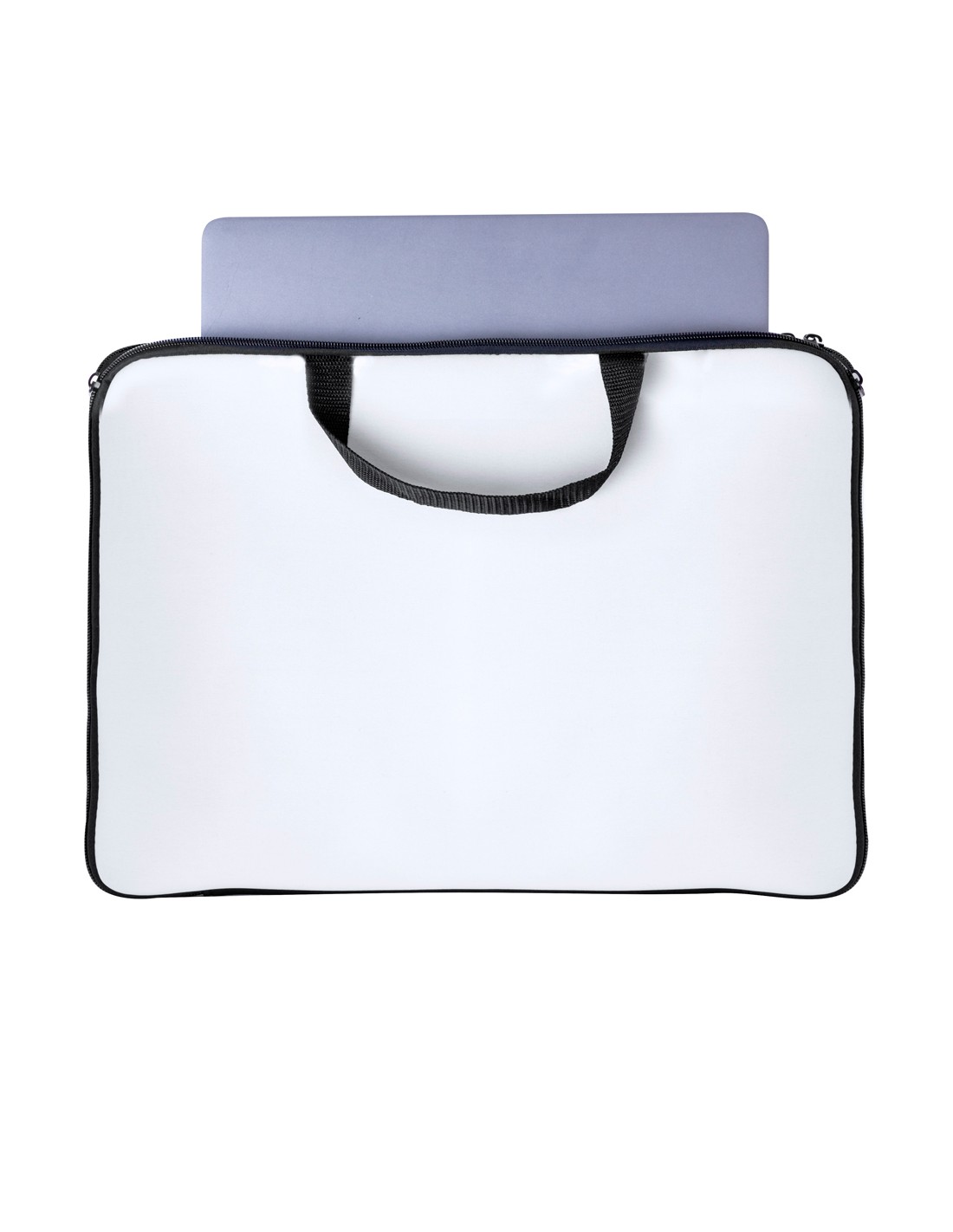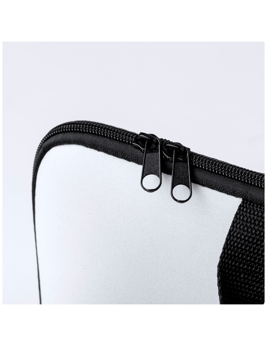 Práctica funda para ordenador portátil de hasta 15 pulgadas en soft shell. Especialmente diseñada para la sublimación con dos caras amplias para el marcaje, de cierre por cremallera de doble tirador en color negro y dos asas. Presentado individualmente en una bolsa reciclada.