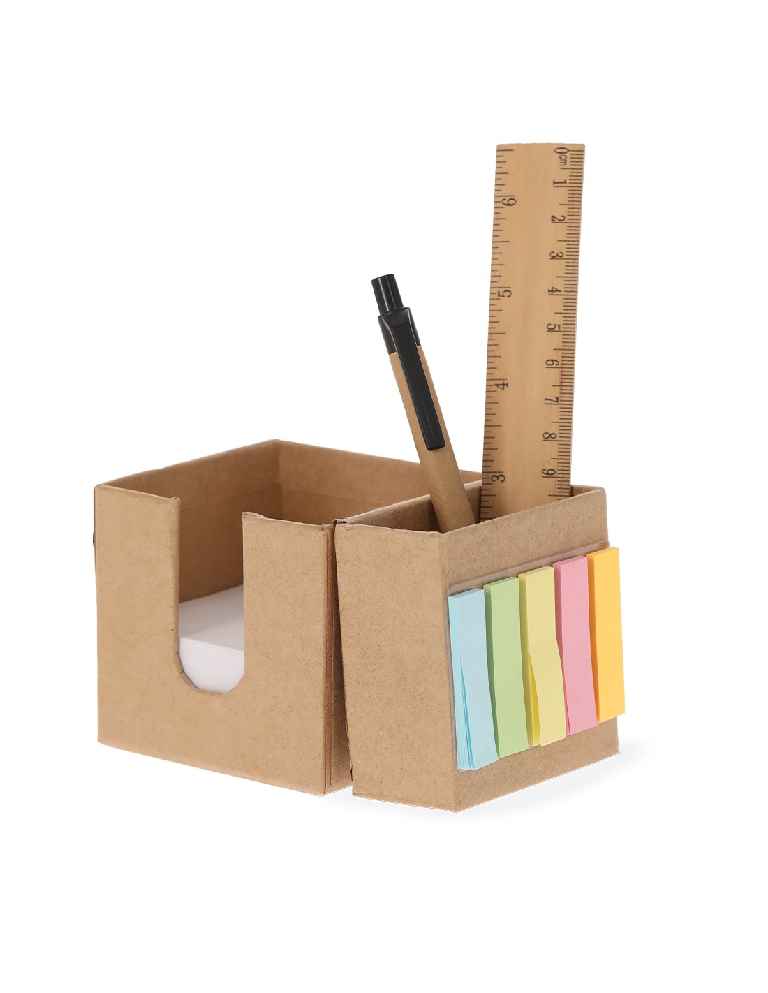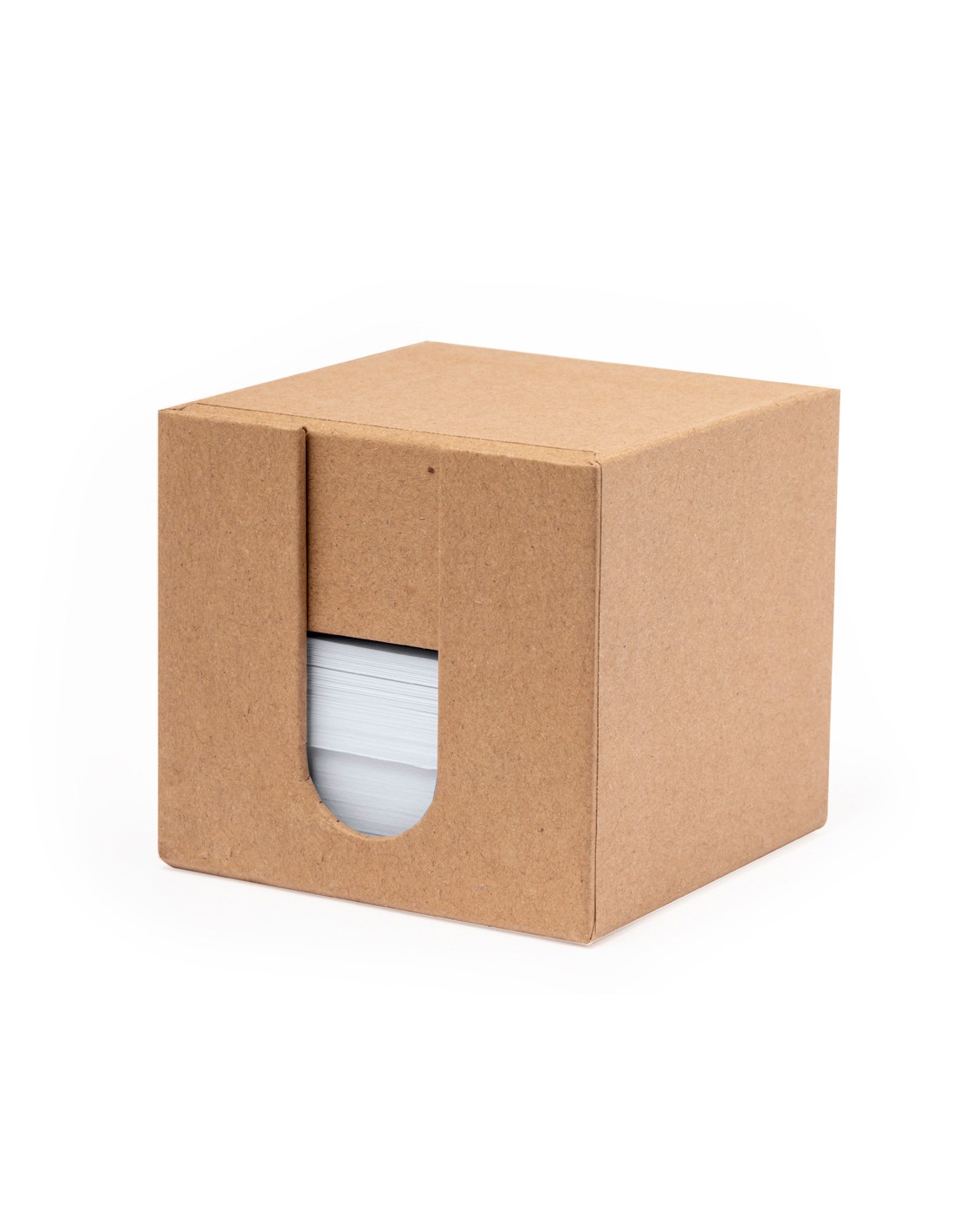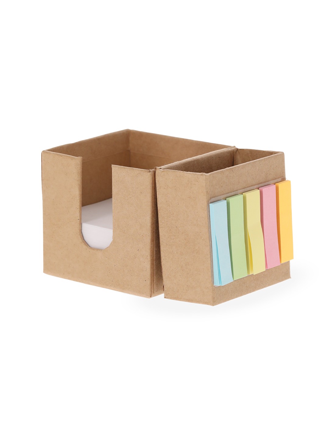 Portanotas fabricado en cartón reciclado. Práctico cubo desplegable con 320 hojas de 7,5x7,5 cm y 125 mininotas adhesivas de 1,5x5cm en variados colores, con práctico hueco para usar como lapicero. El cartón reciclado proviene del reaprovechamiento de excedente de fabricaciones y reciclaje de papel en el final de su vida útil, convirtiéndose en un lienzo ecológico y sostenible.