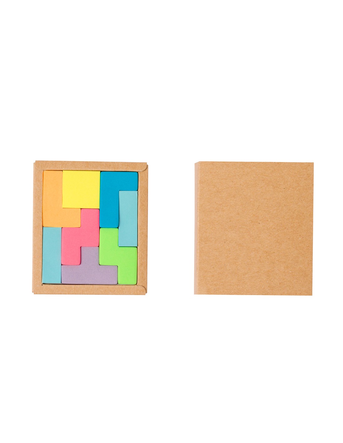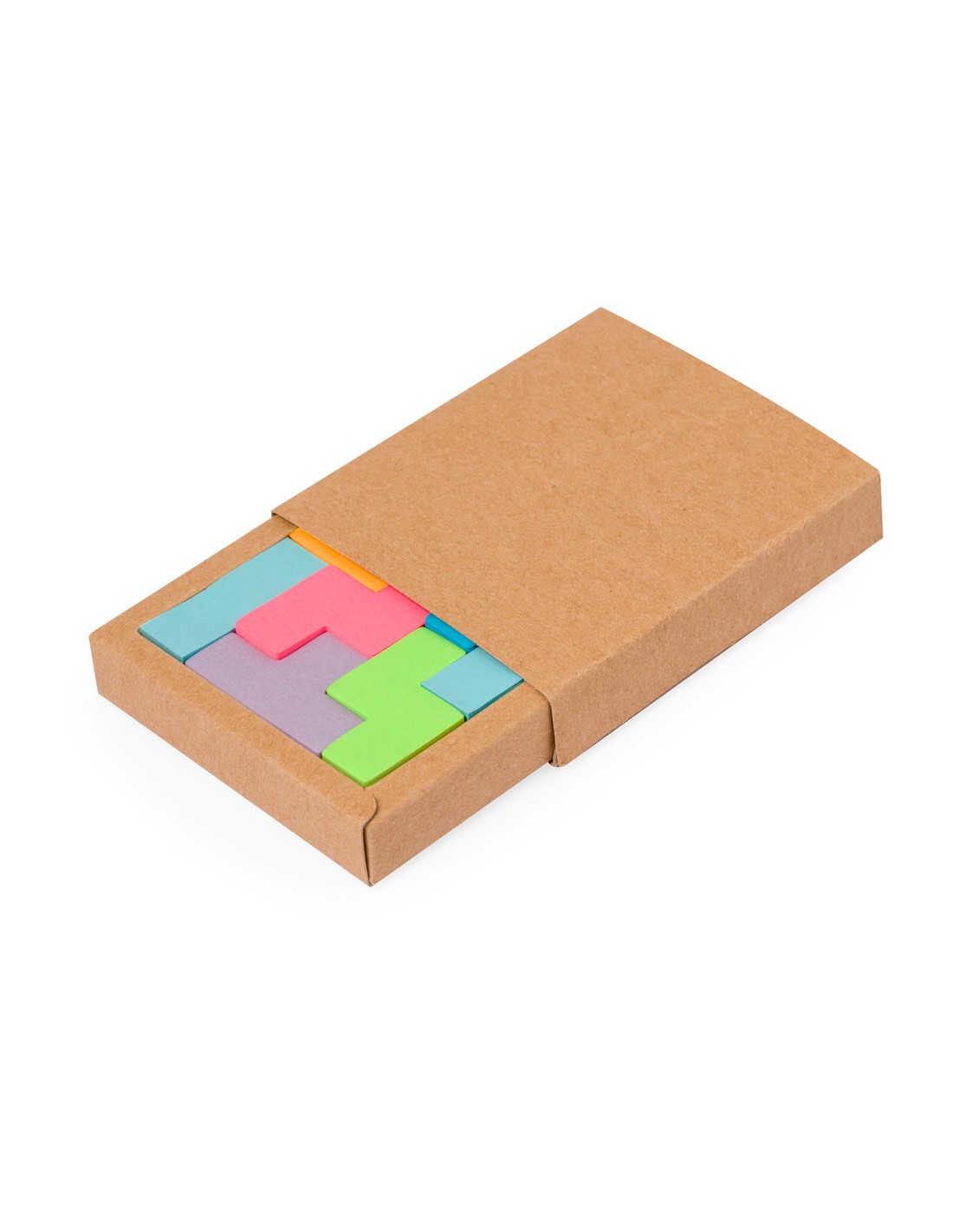 Portanotas fabricado en cartón reciclado. Con 200 mininotas adhesivas en diferentes colores y formas geométricas. Presentados en una caja de cartón reciclado con funda.