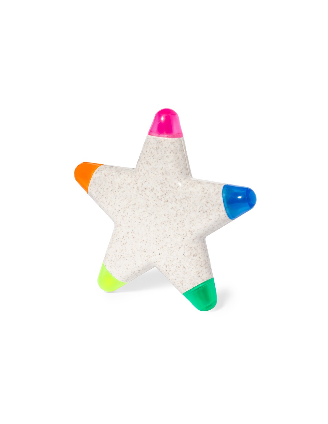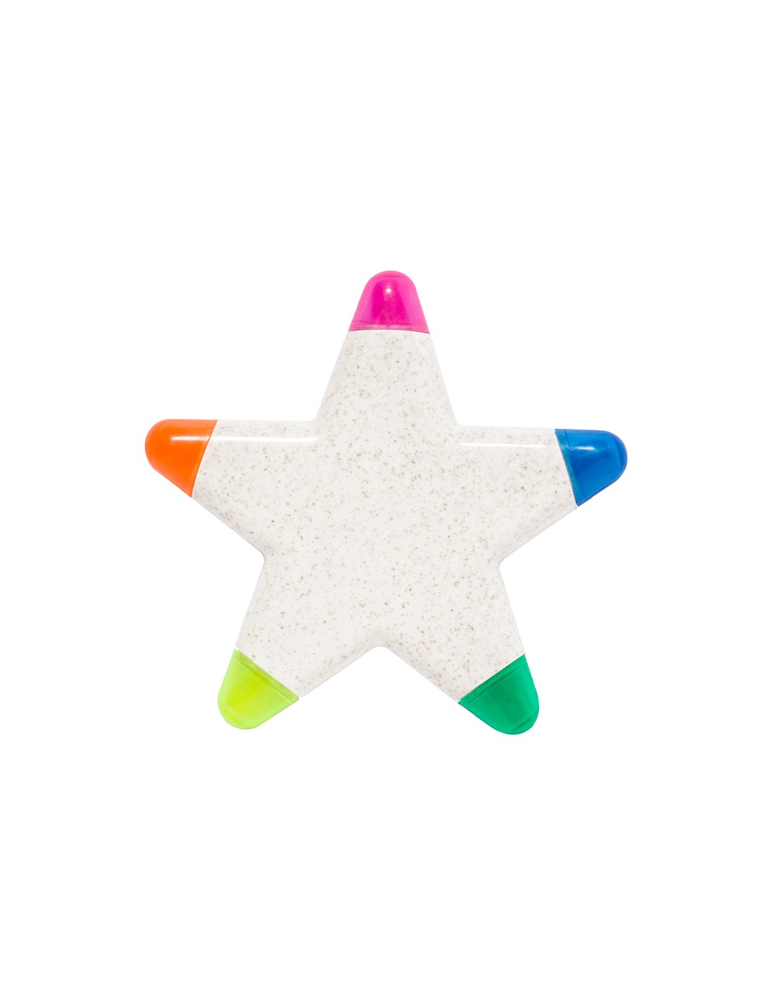 Original marcador fluorescente de cinco colores fabricado en caña de trigo. Con cuerpo de estrella en suave acabado brillante, especialmente diseñado para marcaje a todo color. Con capuchas translúcidas a juego con el marcador. Presentado en bolsa de papel reciclado.La caña de trigo fomenta la utilización de materias primas naturales, reduciendo así las emisiones contaminantes.
