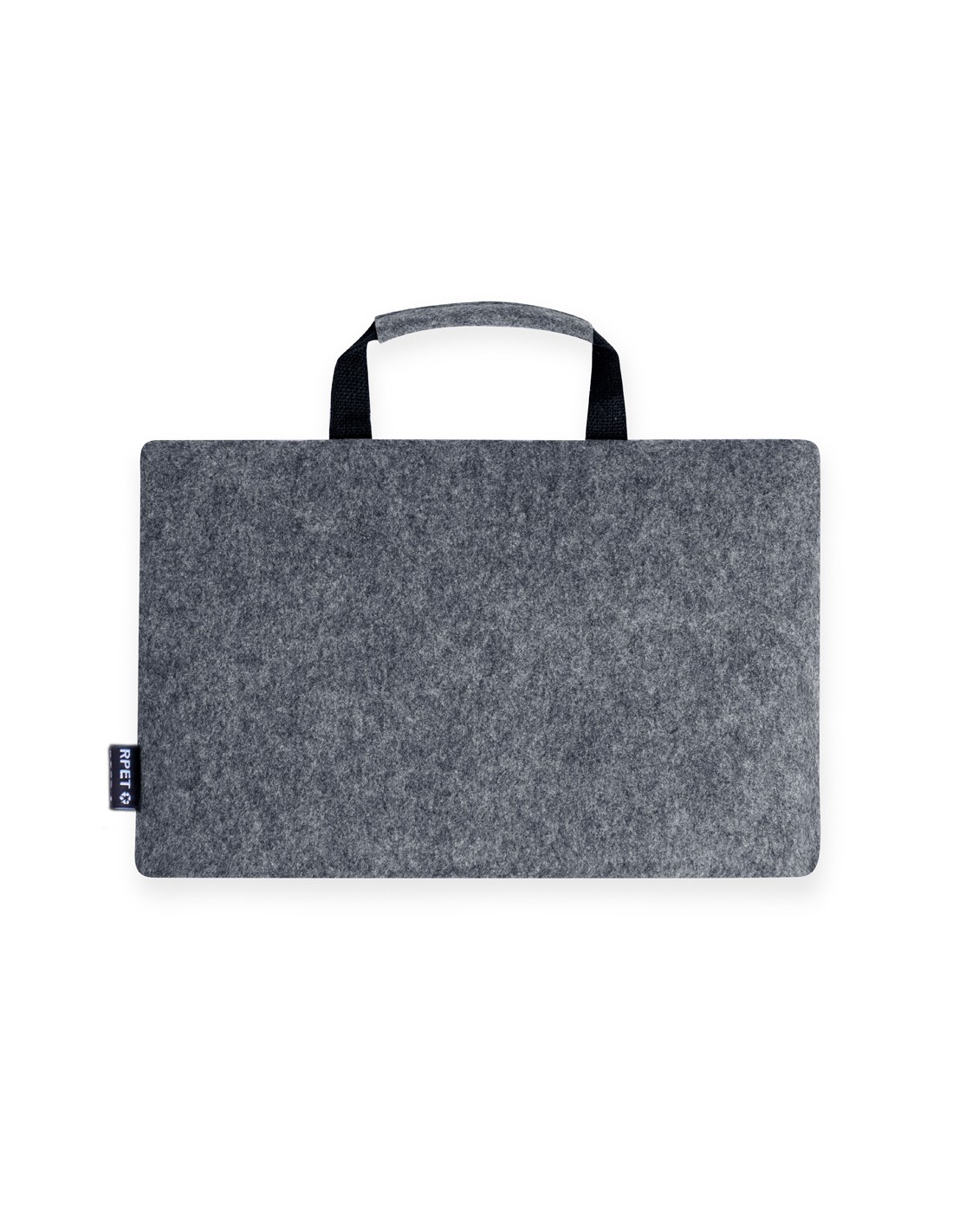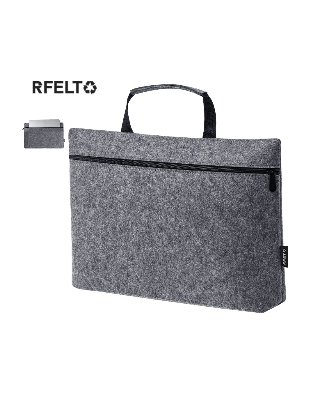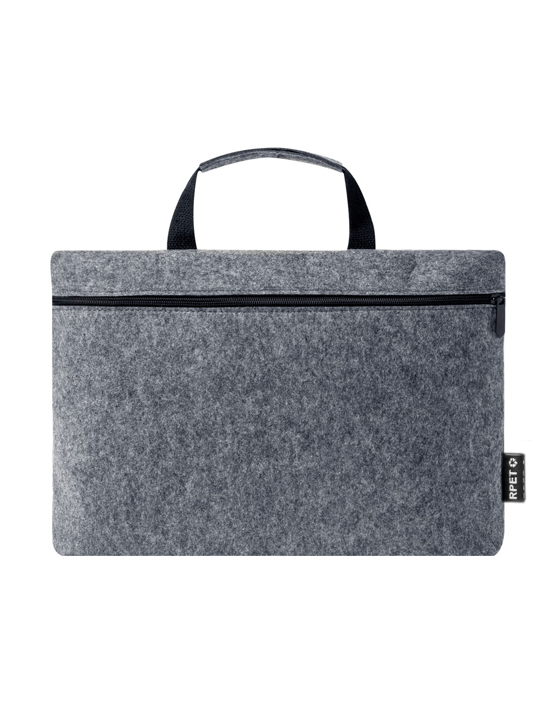 Portadocumentos en resistente fieltro RPET efecto melange. Compartimento principal con cierre de cremallera, para ordenador portátil de hasta 15 pulgadas, y pequeño bolsillo interior. Con resistentes asas a juego con detalles en negro. Logotipo RPET en etiqueta exterior. El fieltro RPET es fruto de la combinación del proceso de reciclaje de materiales plásticos junto con la técnica milenaria de fabricación del fieltro, dando como resultado un material de eco-tendencia que, además de ser de origen reciclado, también se convierte en reciclable.