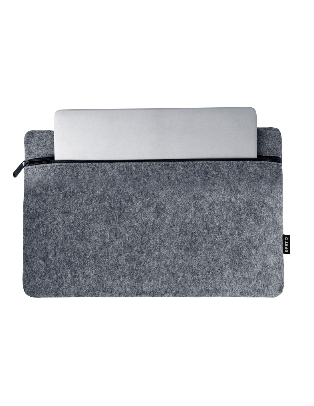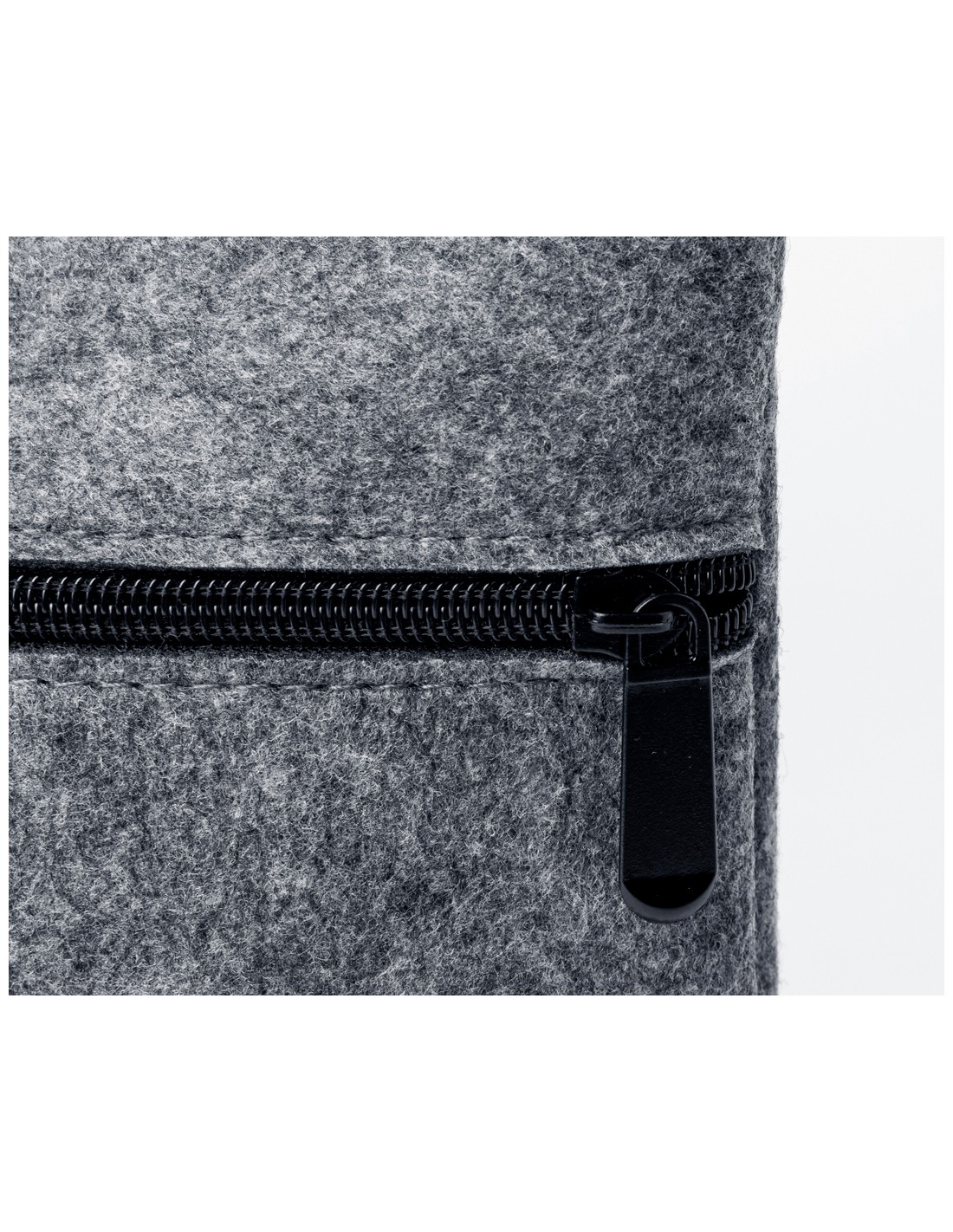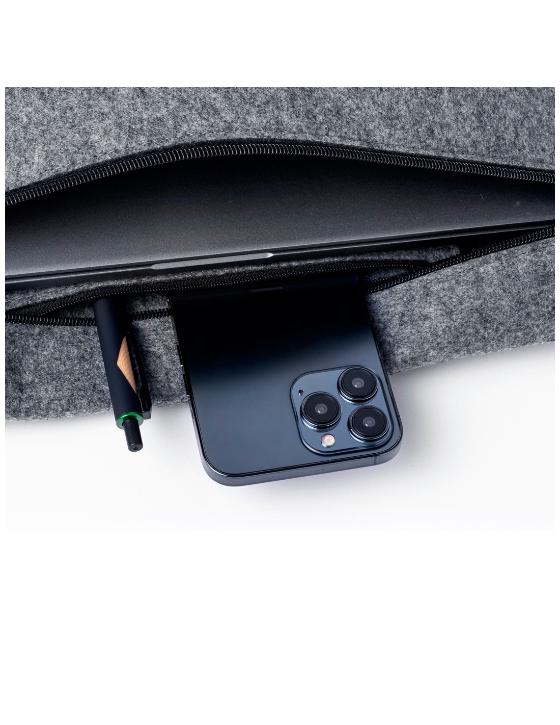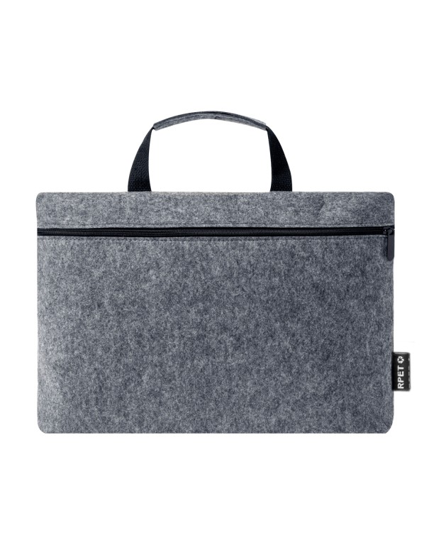 Portadocumentos en resistente fieltro RPET efecto melange. Compartimento principal con cierre de cremallera, para ordenador portátil de hasta 15 pulgadas, y pequeño bolsillo interior. Con resistentes asas a juego con detalles en negro. Logotipo RPET en etiqueta exterior. El fieltro RPET es fruto de la combinación del proceso de reciclaje de materiales plásticos junto con la técnica milenaria de fabricación del fieltro, dando como resultado un material de eco-tendencia que, además de ser de origen reciclado, también se convierte en reciclable.