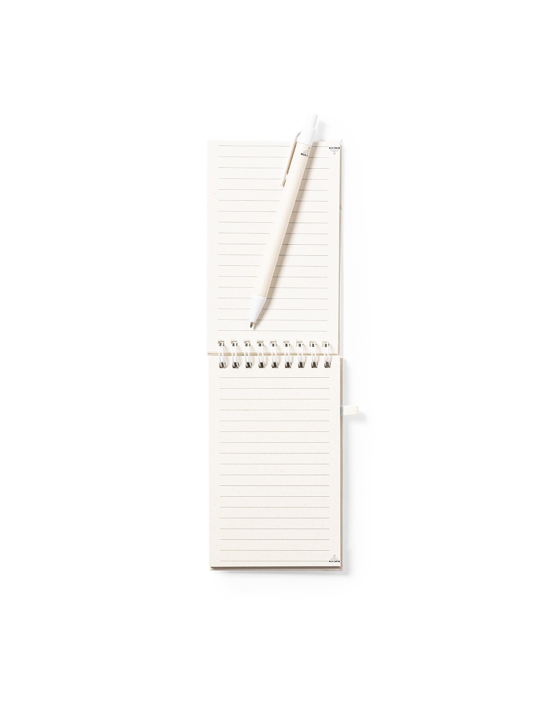 Libreta de tapas duras fabricada a partir de cartones de leche reciclados. Con 80 hojas de disposición a una raya, elástico de sujeción a juego y soporte para bolígrafo. Además, incluye bolígrafo fabricado a juego, con mecanismo pulsador y en tinta azul. Logotipo Recycled Milk Cartón en la esquina de las hojas, contraportada y bolígrafo. Presentada en bolsa individual reciclada.Los cartones de leche se componen en su mayor parte de cartón y aluminio. Durante su proceso de reciclado, se separan los distintos materiales del envase para su reutilización y nuevo uso, contribuyendo así a recorrer el camino infinito de la economía circular. Este material se caracteriza por su alto grado de reciclabilidad, así como por su ligereza y resistencia.