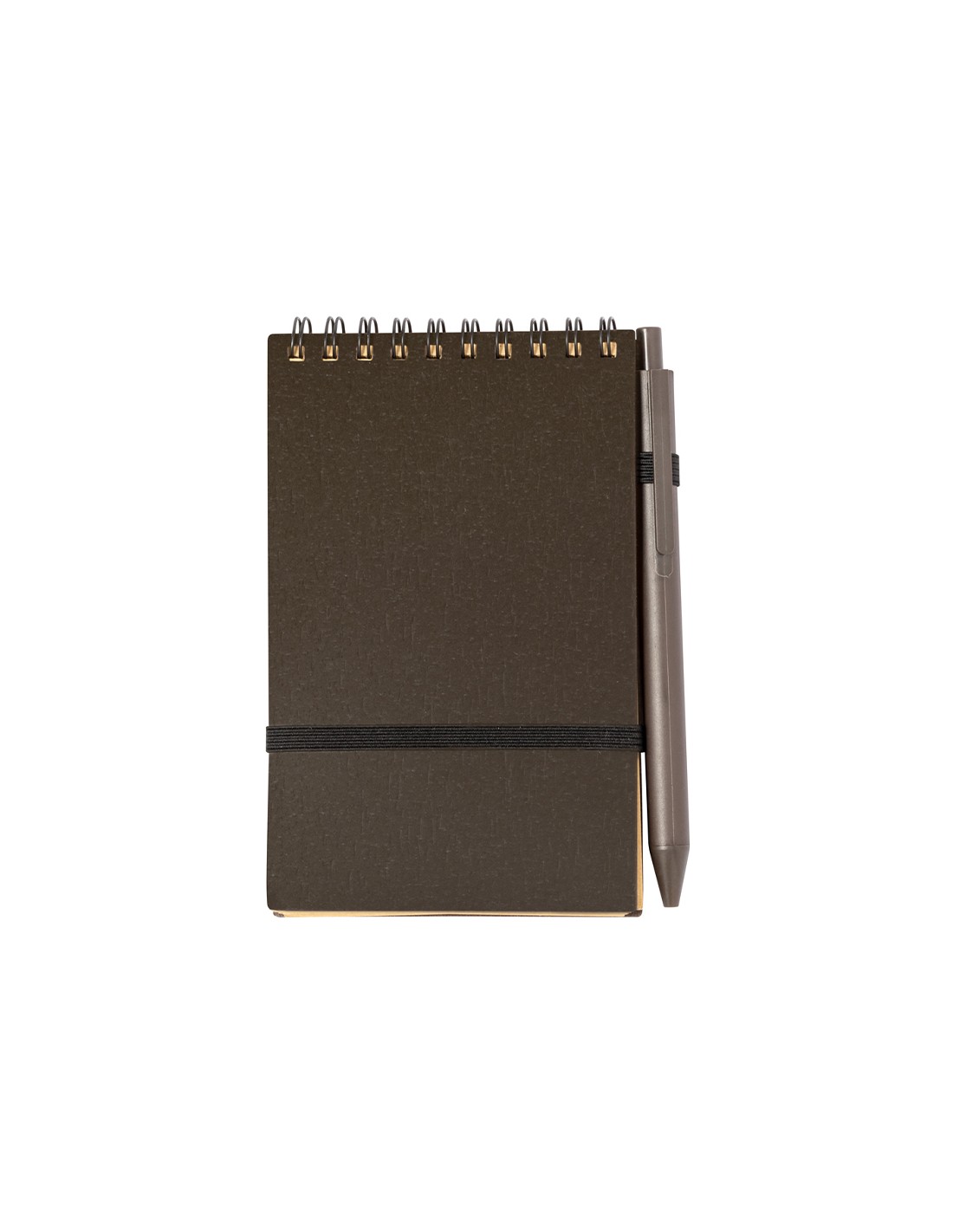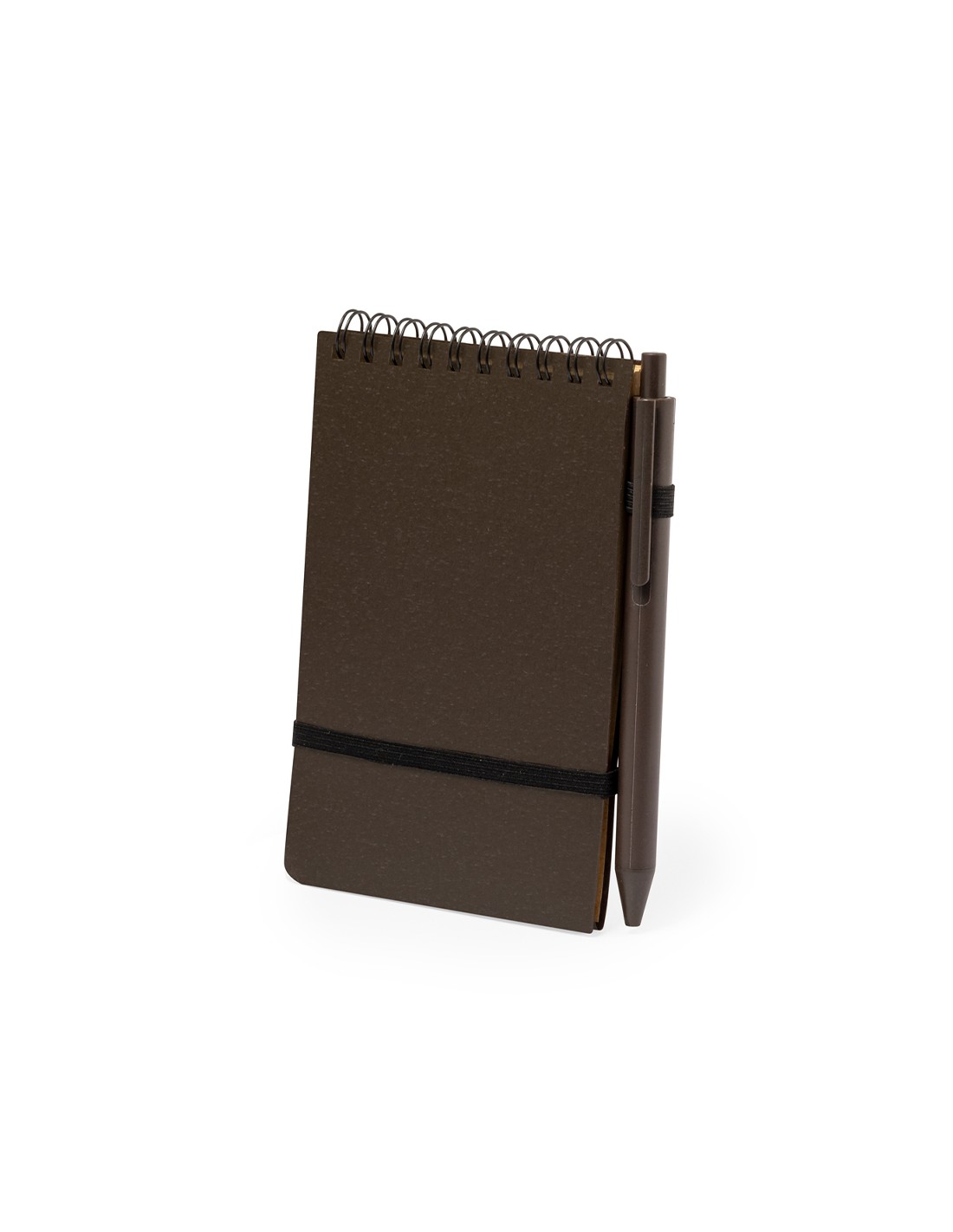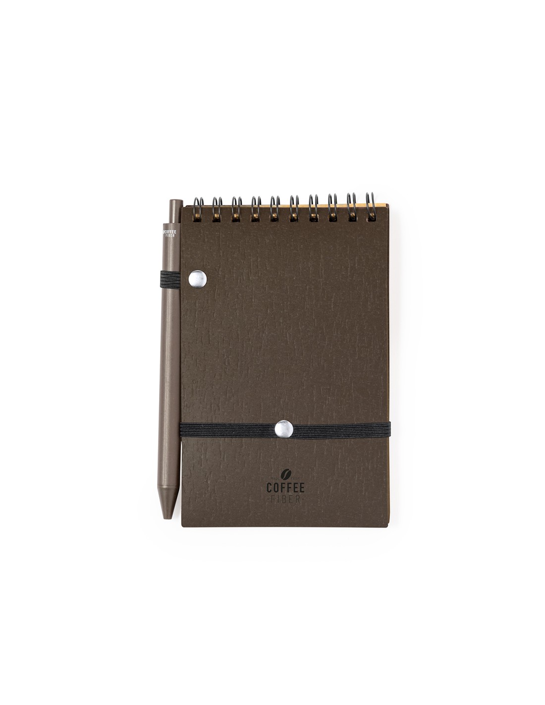 Set de libreta y bolígrafo fabricado en fibra de café. Libreta de anillas dobles con tapas blandas, cierre elástico y soporte para el bolígrafo. De 70 hojas y disposición a una raya. Bolígrafo de mecanismo pulsador y tinta azul. Incluye logotipo fibra de café impreso en libreta y bolígrafo. Presentado en bolsa individual reciclada.La fibra de café se elabora a partir de los residuos producidos en la obtención del café. Una alternativa sostenible que favorece la reducción del uso de plásticos, ahorrando energía en el proceso de fabricación y fomentando así el cuidado del medio ambiente.