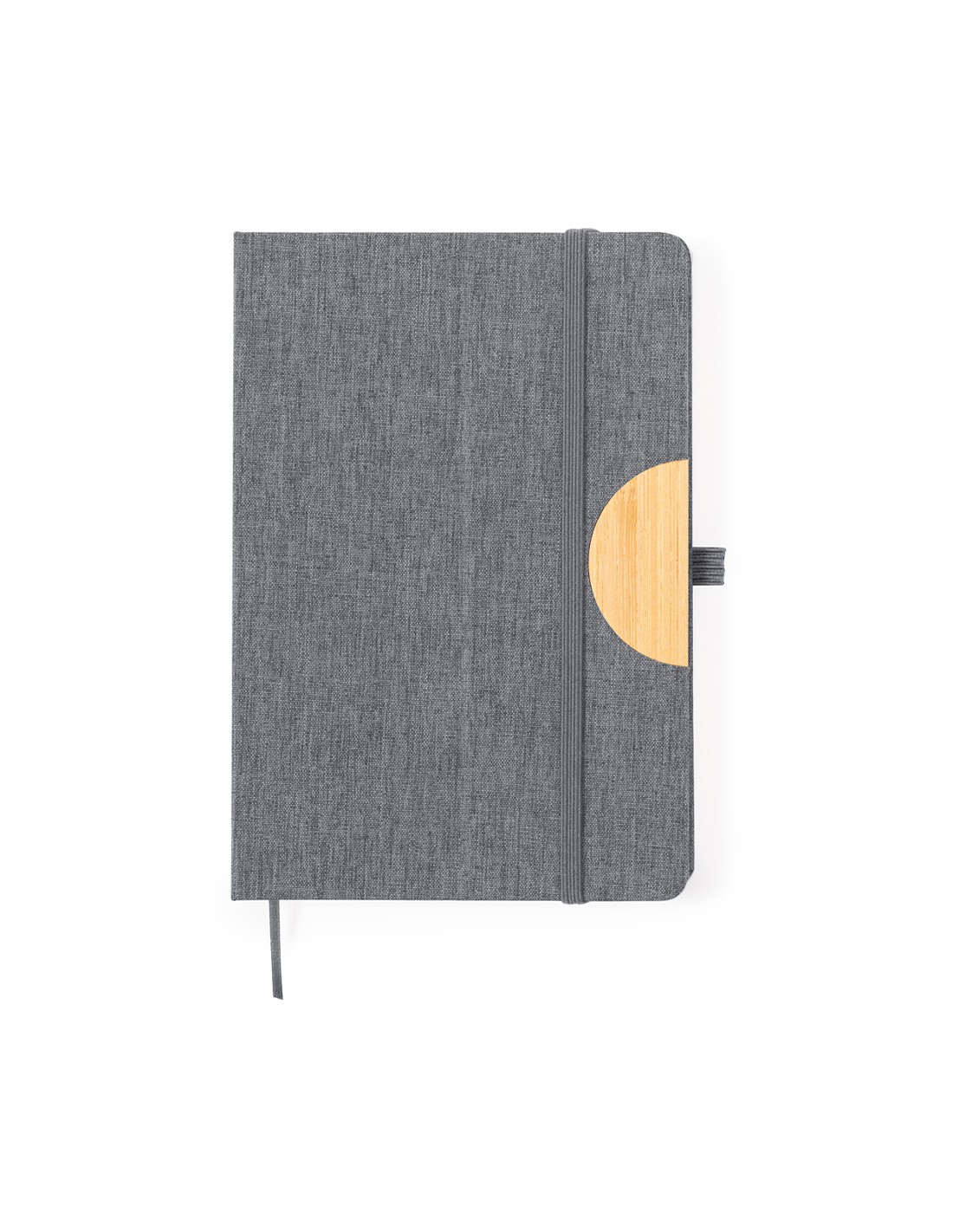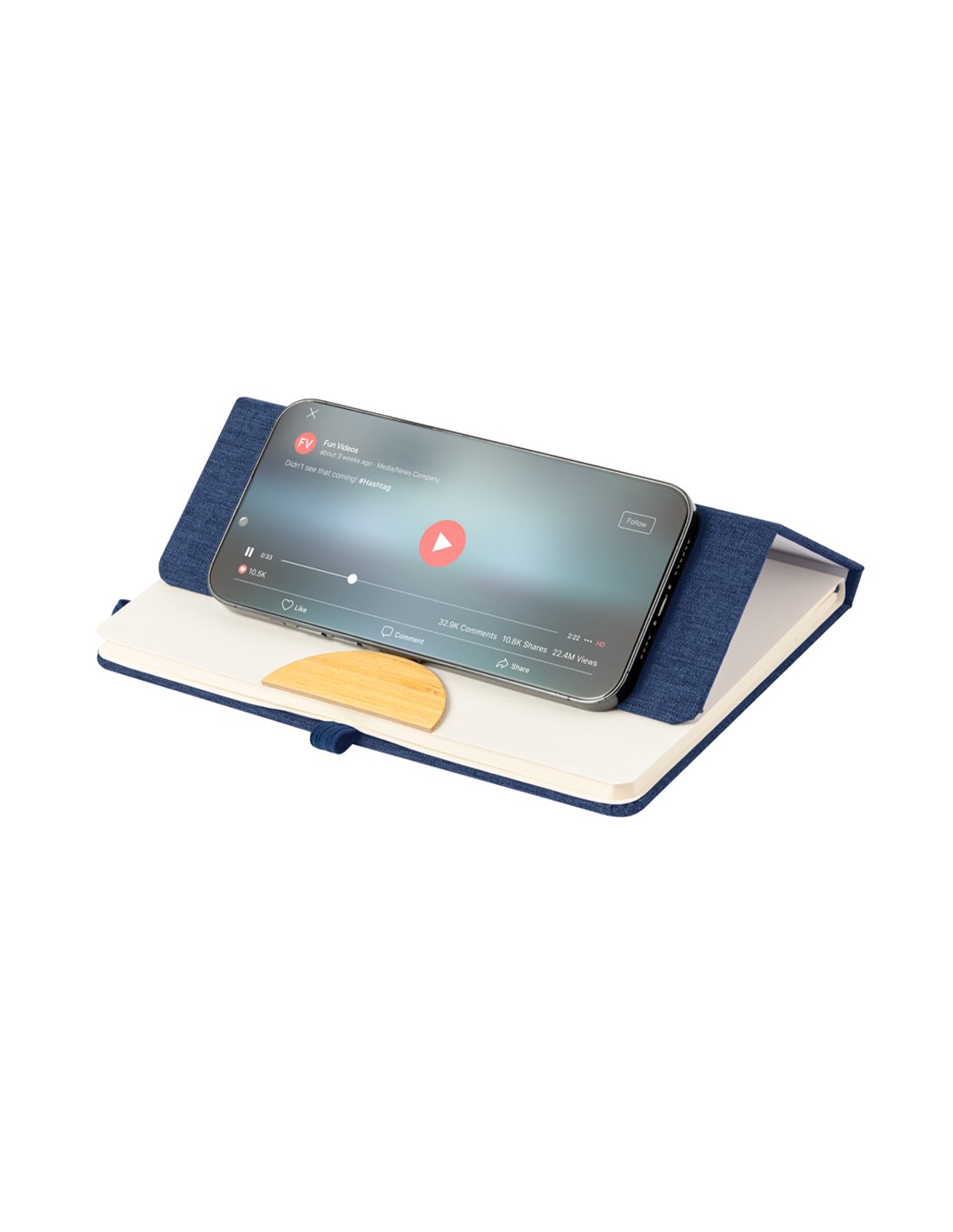 Bloc de notas soporte con tapas rígidas fabricado en RPET 300D y bambú. Versátil soporte integrado en la portada para smartphone y tablet, confeccionado en bambú. Cuenta con elástico de cierre y soporte para bolígrafo a juego. Contiene 80 hojas interiores lisas y está disponible en una amplia gama de colores. Con logotipo RPET en contraportada y presentado en bolsa individual de papel reciclada.El material RPET se elabora a partir de plástico reciclado, para así fomentar la reutilización de residuos plásticos y ayudar a la sostenibilidad del planeta.
