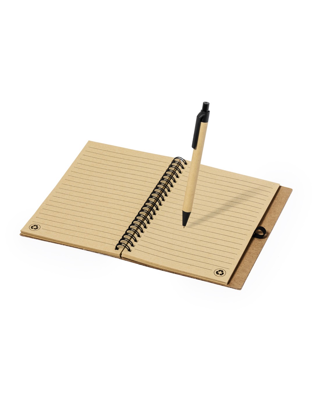 Set de libreta y bolígrafo confeccionado en corcho y cartón reciclado. La libreta de anillas destaca por sus tapas rígidas en corcho natural, con 80 hojas de disposición a una raya. Incluye bolígrafo de mecanismo pulsador con cuerpo fabricado en cartón reciclado y en tinta azul. Presentado en bolsa de papel reciclado. Elaborado con elementos vegetales para así fomentar la utilización de materias primas naturales y reducir las emisiones contaminantes.