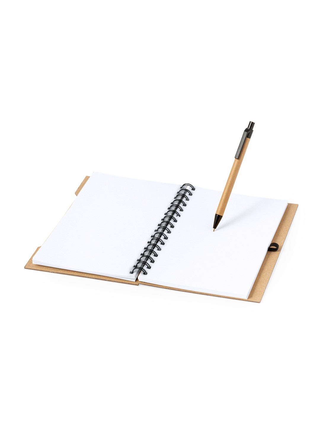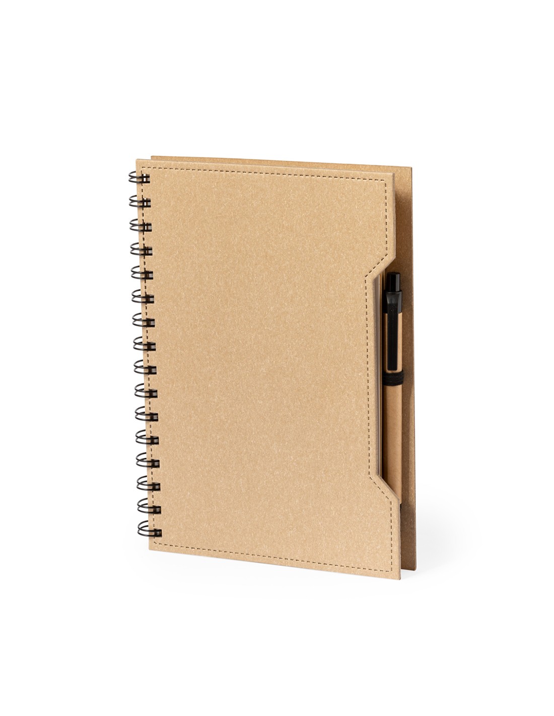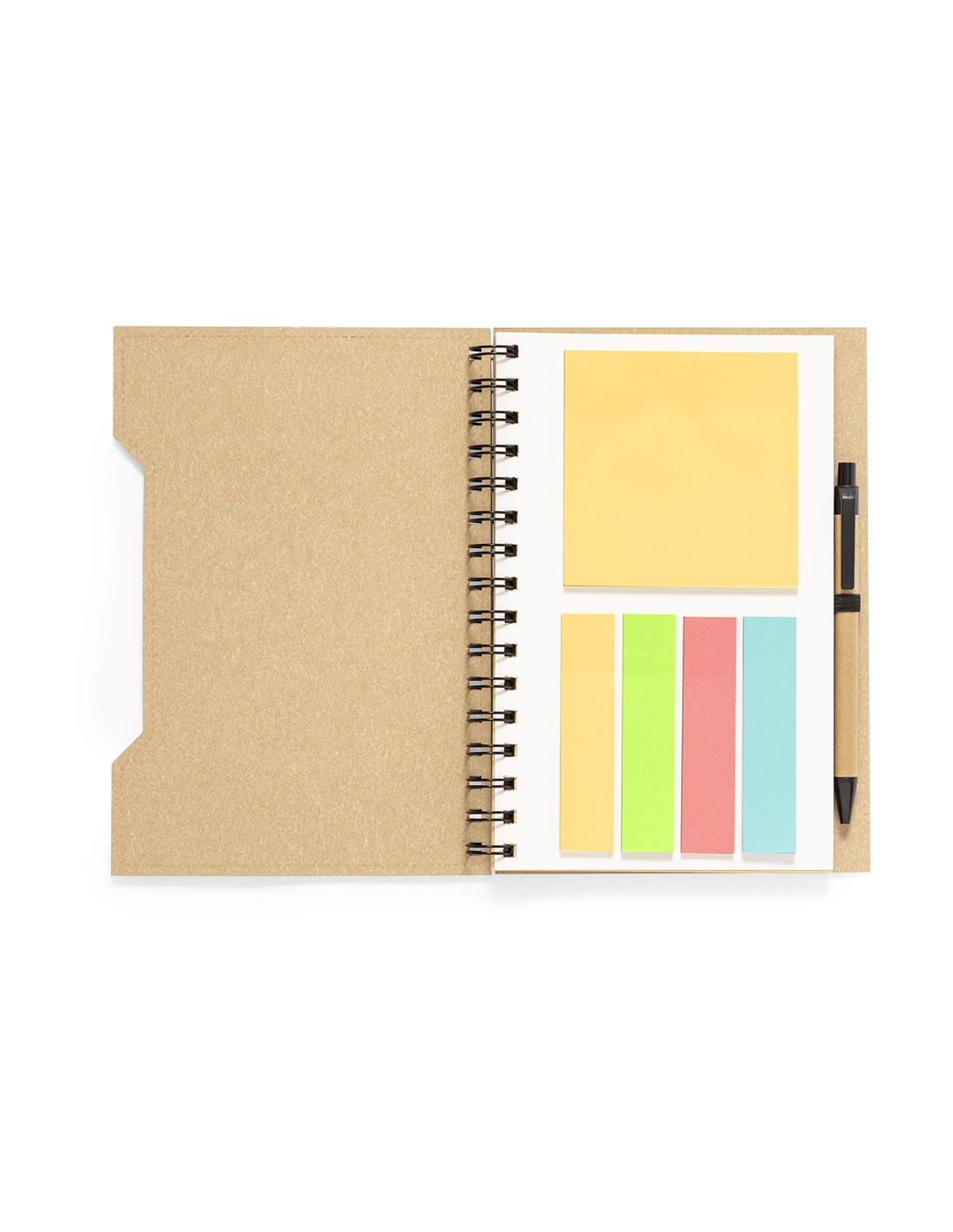 Set de bloc de notas hecho en cartón reciclado. Incluye una libreta de anillas con tapas rígidas en cartón reciclado, decoradas con pespunte, de 80 hojas lisas en color natural. 25 notas adhesivas grandes y 100 mininotas adhesivas en 4 colores pastel distintos, junto a un práctico soporte para bolígrafo. Además, incluye un bolígrafo fabricado en cartón reciclado con tinta azul. Presentado individualmente en bolsa de papel. El cartón reciclado proviene del reaprovechamiento de excedente de fabricaciones y reciclaje de papel en el final de su vida útil, convirtiéndose en un lienzo ecológico y sostenible.