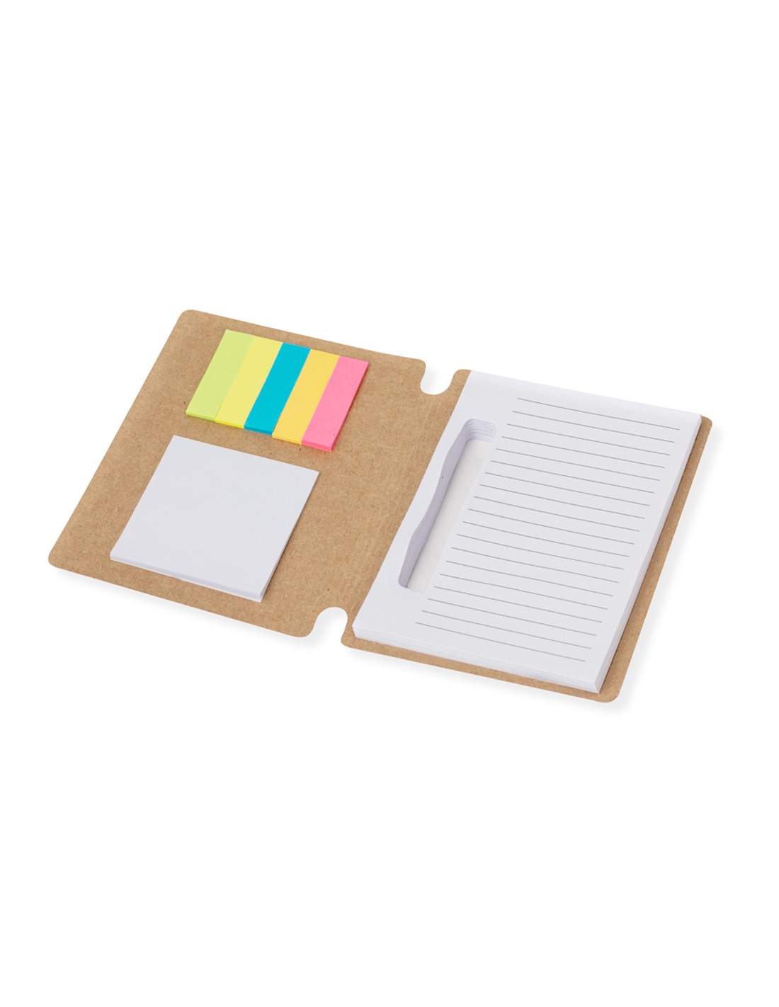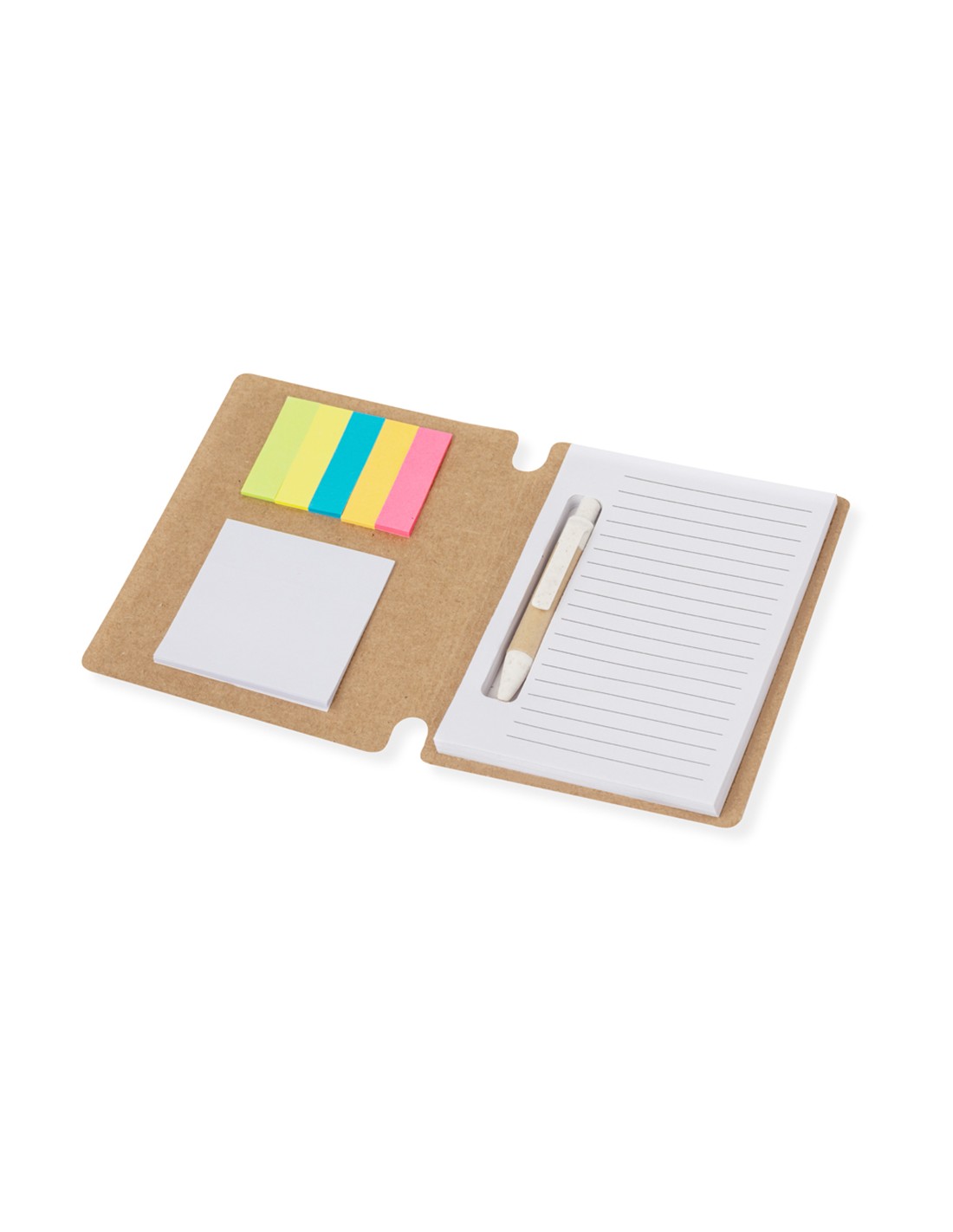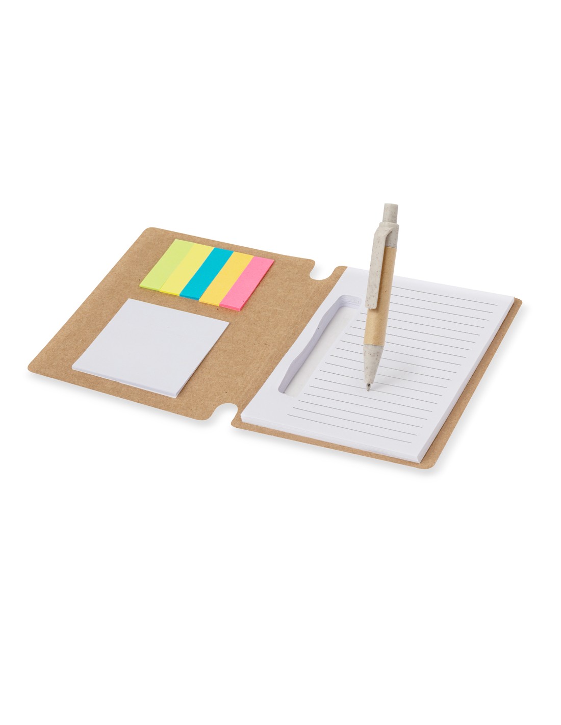 Bloc de notas elaborado en cartón reciclado. Incluye 70 hojas blancas con disposición a una raya, 15 notas adhesivas de 5x6,5 cm y 75 mininotas adhesivas de 1,2x4,5 cm en diversos colores. Además, cuenta con un bolígrafo fabricado en cartón reciclado y caña de trigo con mecanismo pulsador y tinta azul. Presentado individualmente en bolsa de papel. El cartón reciclado proviene del reaprovechamiento de excedente de fabricaciones y reciclaje de papel en el final de su vida útil, convirtiéndose en un lienzo ecológico y sostenible.