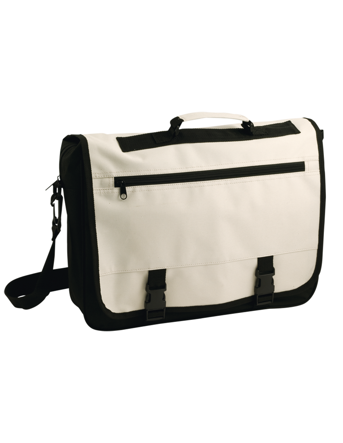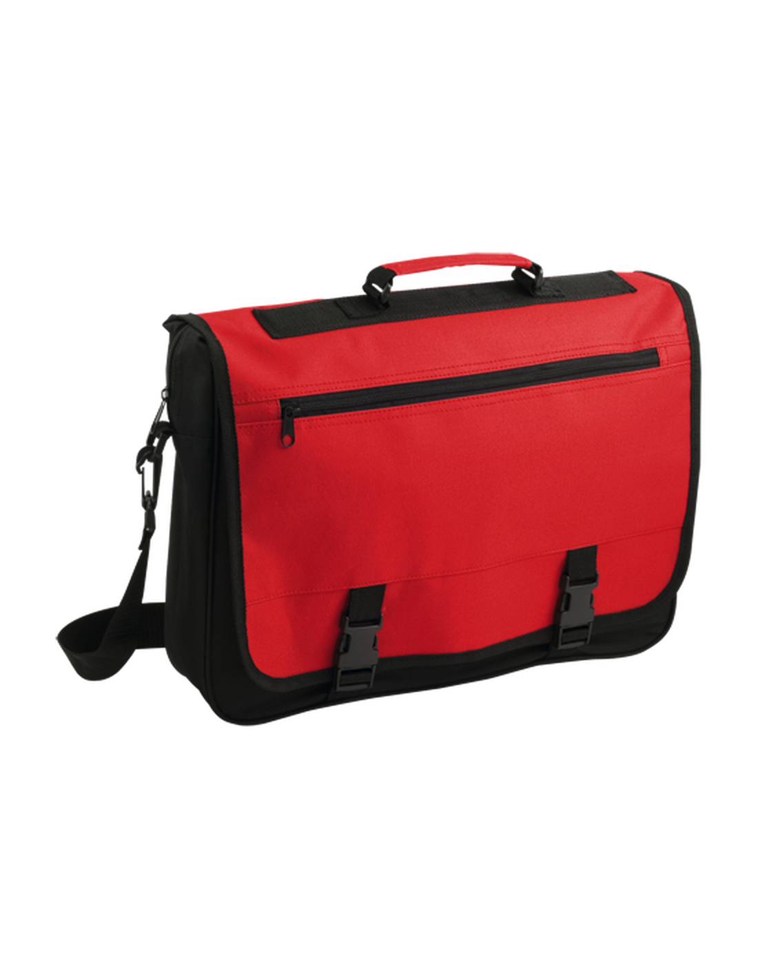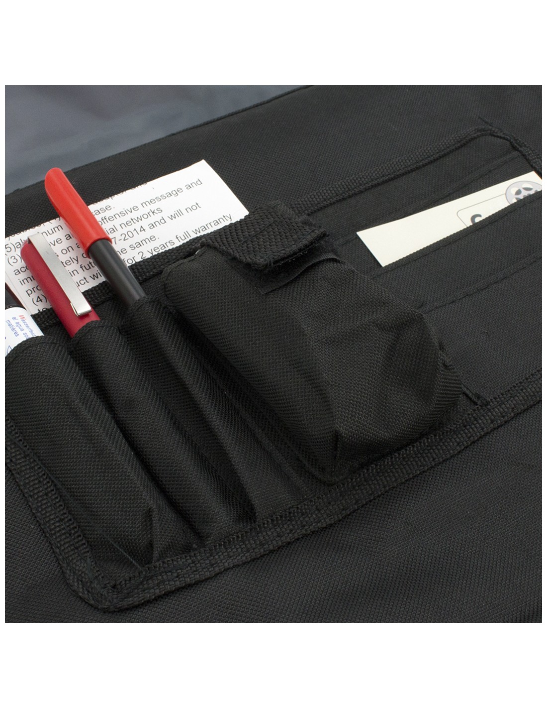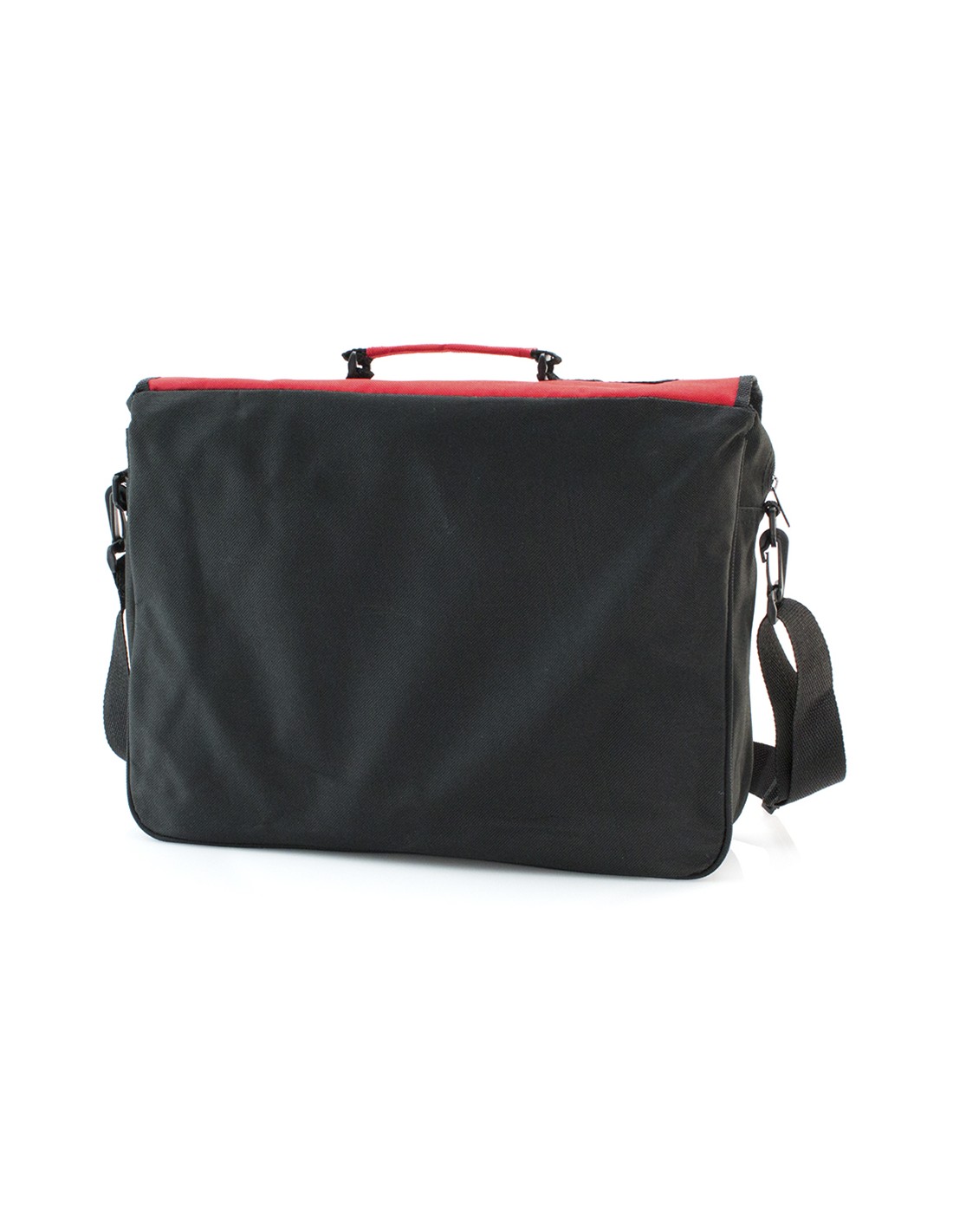 Portadocumentos con solapa de cierre de velcro en poliéster 600D con elegante tira frontal en color negro. Con asas de transporte reforzadas y cinta bandolera ajustable. Compartimentos interiores para bolígrafos y funda para smartphone en PVC con función táctil.