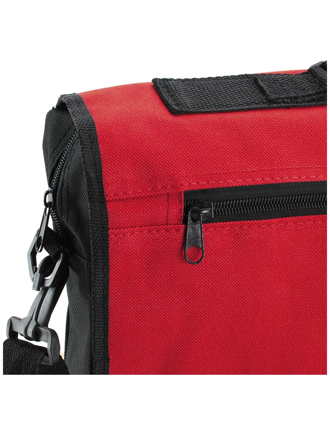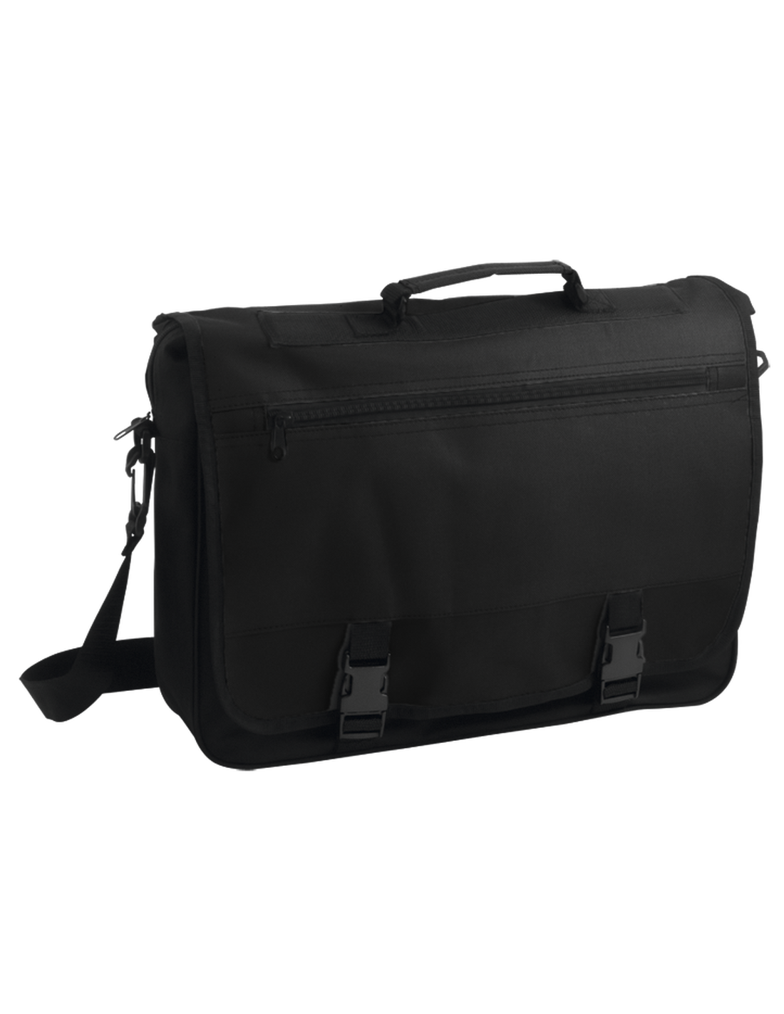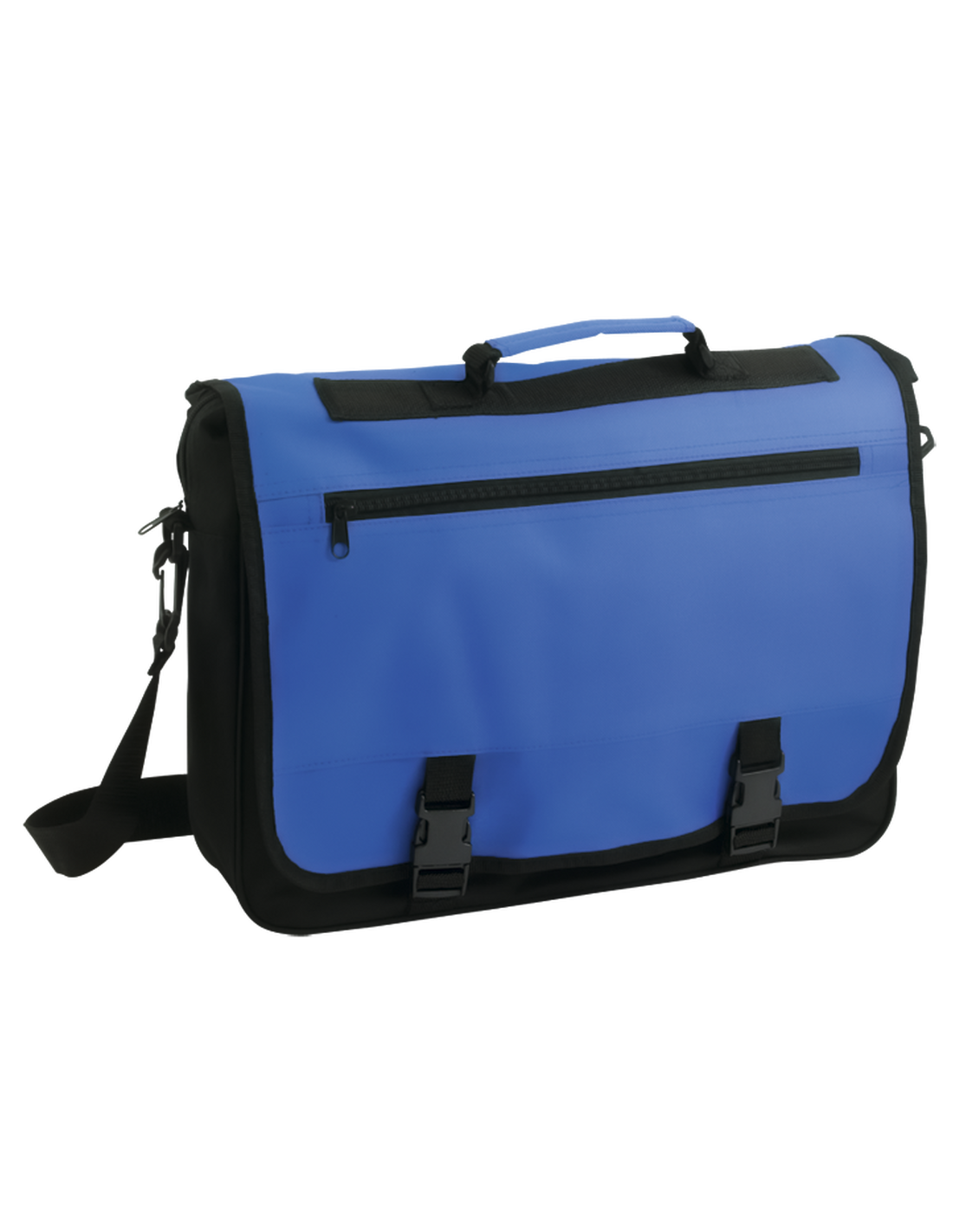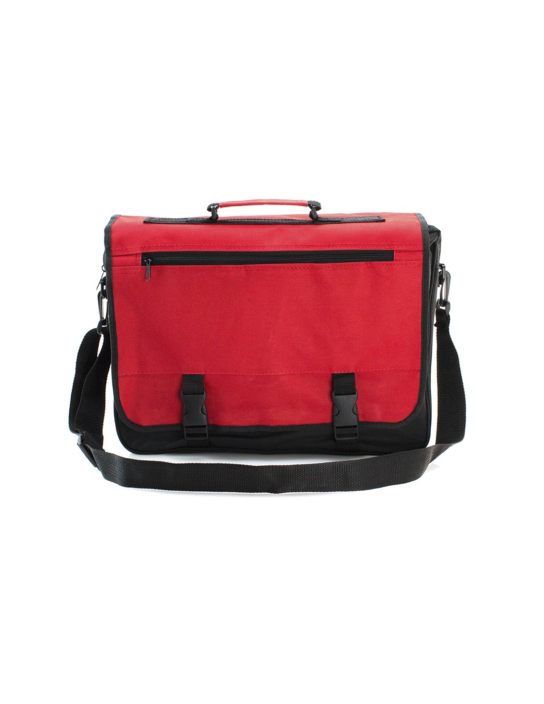 Portadocumentos con solapa de cierre de velcro en poliéster 600D con elegante tira frontal en color negro. Con asas de transporte reforzadas y cinta bandolera ajustable. Compartimentos interiores para bolígrafos y funda para smartphone en PVC con función táctil.