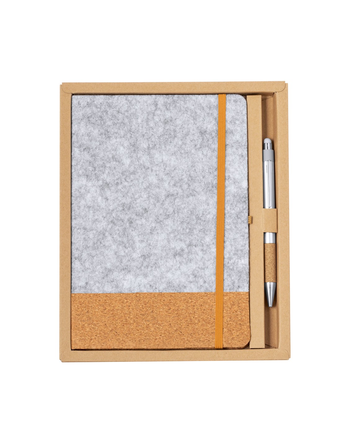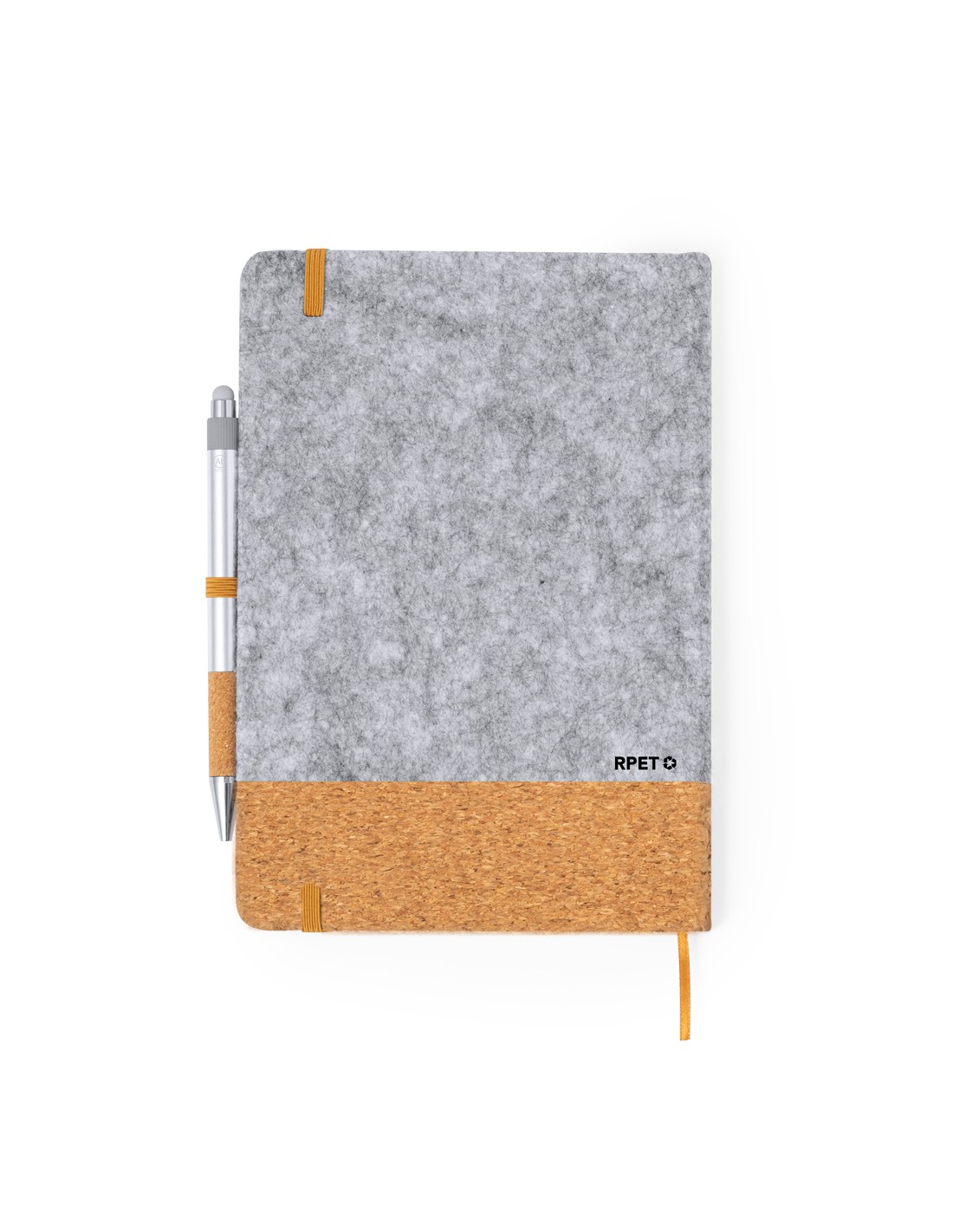 Set de bloc de notas y bolígrafo confeccionados en fieltro RPET y Aluminio Reciclado. Incluye un bloc de notas de tapas rígidas, elaboradas en fieltro RPET y corcho natural, con 80 páginas lisas, banda elástica, marcapáginas y un elástico para sujetar bolígrafos de color marrón. Además, cuenta con un bolígrafo de Aluminio Reciclado con empuñadura de corcho natural, mecanismo pulsador y tinta azul. Se presenta de manera elegante en una caja de presentación.El fieltro RPET es fruto de la combinación del proceso de reciclaje de materiales plásticos junto con la técnica milenaria de fabricación del fieltro, dando como resultado un material de eco-tendencia que, además de ser de origen reciclado, también se convierte en reciclable.