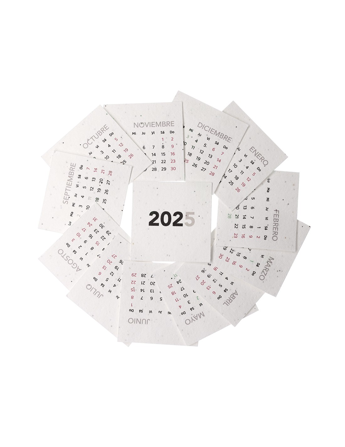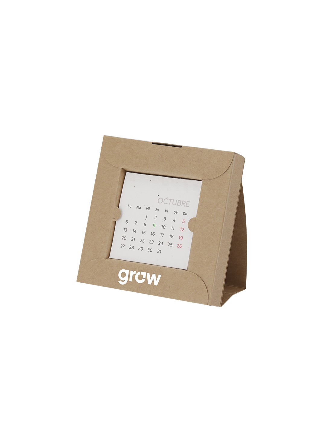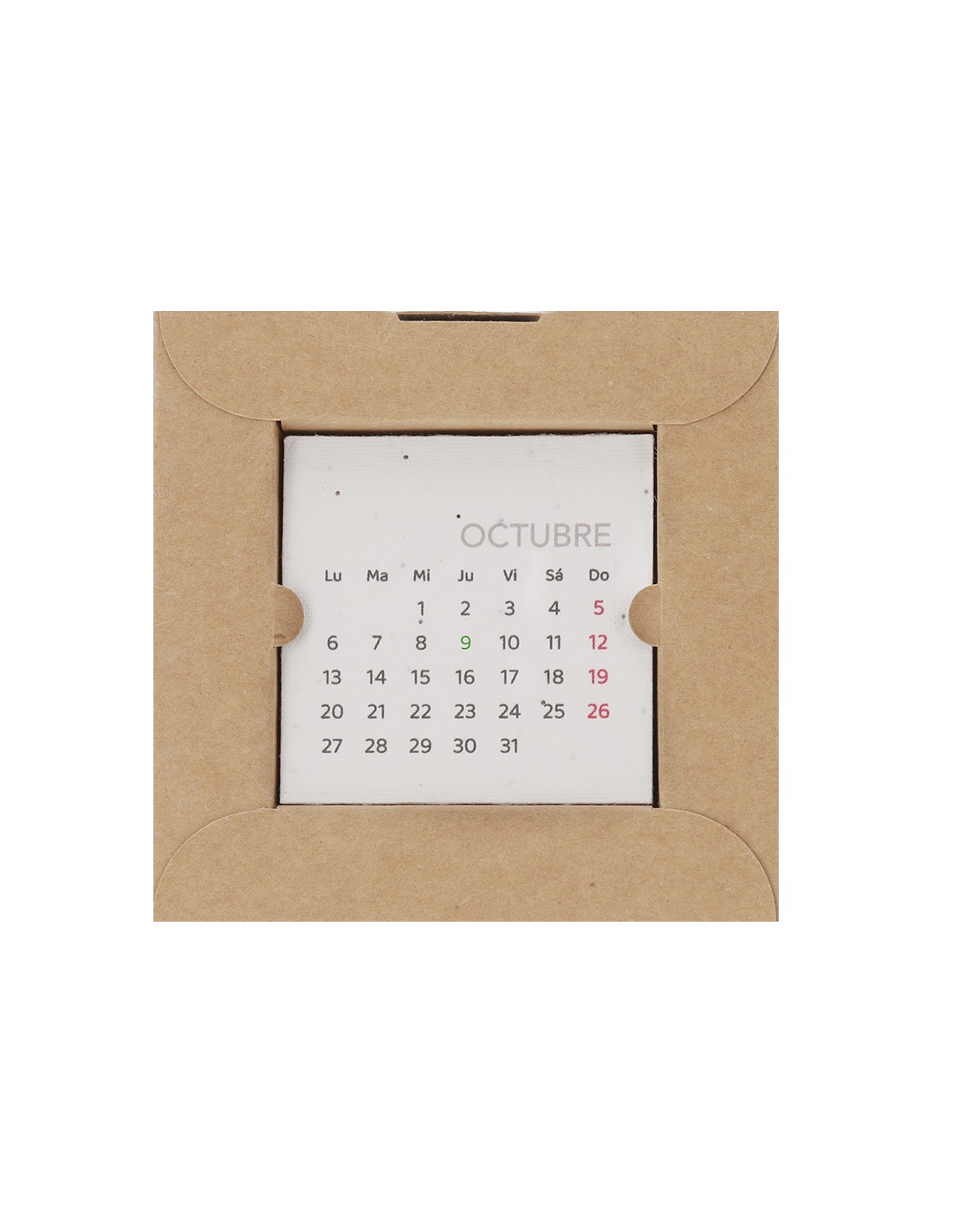 Calendario plantable fabricado en papel de semilla. Incluye 13 hojas con semillas de petunia de colores surtidos, convirtiéndolo en papel plantable después de su vida útil. Diseño de mes en curso, con festividades nacionales marcadas en rojo y autonómicas en verde. Presentado en caja soporte de cartón.