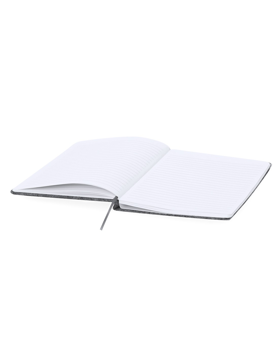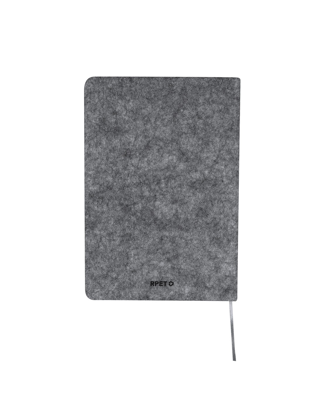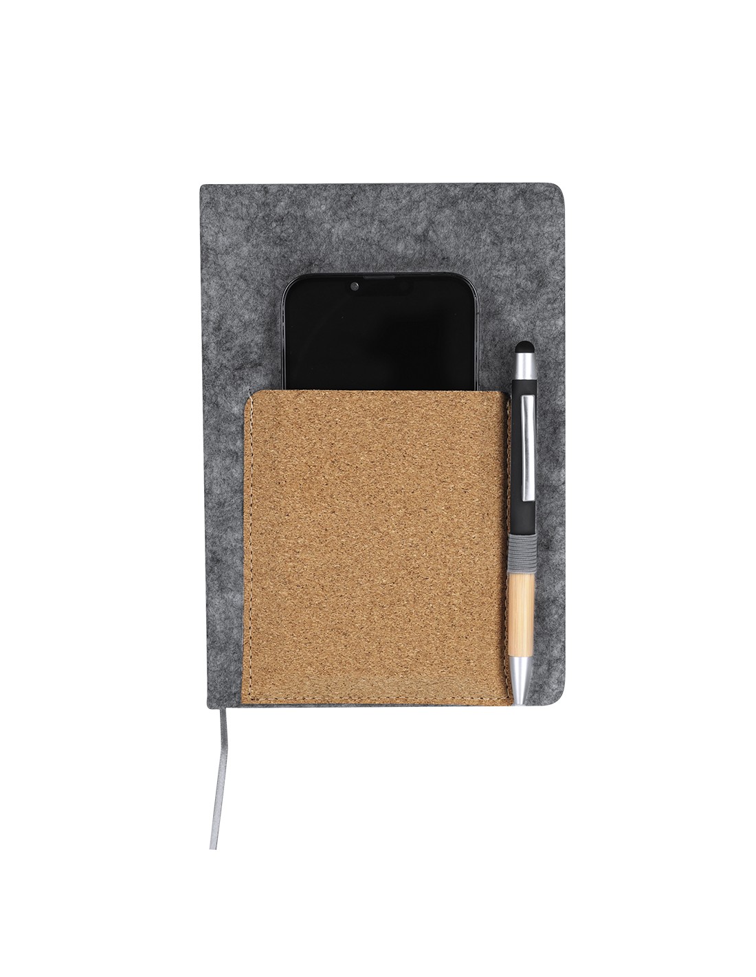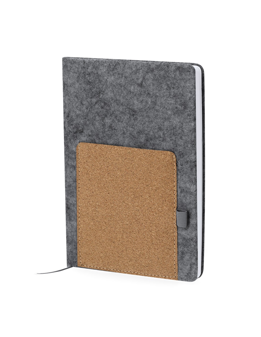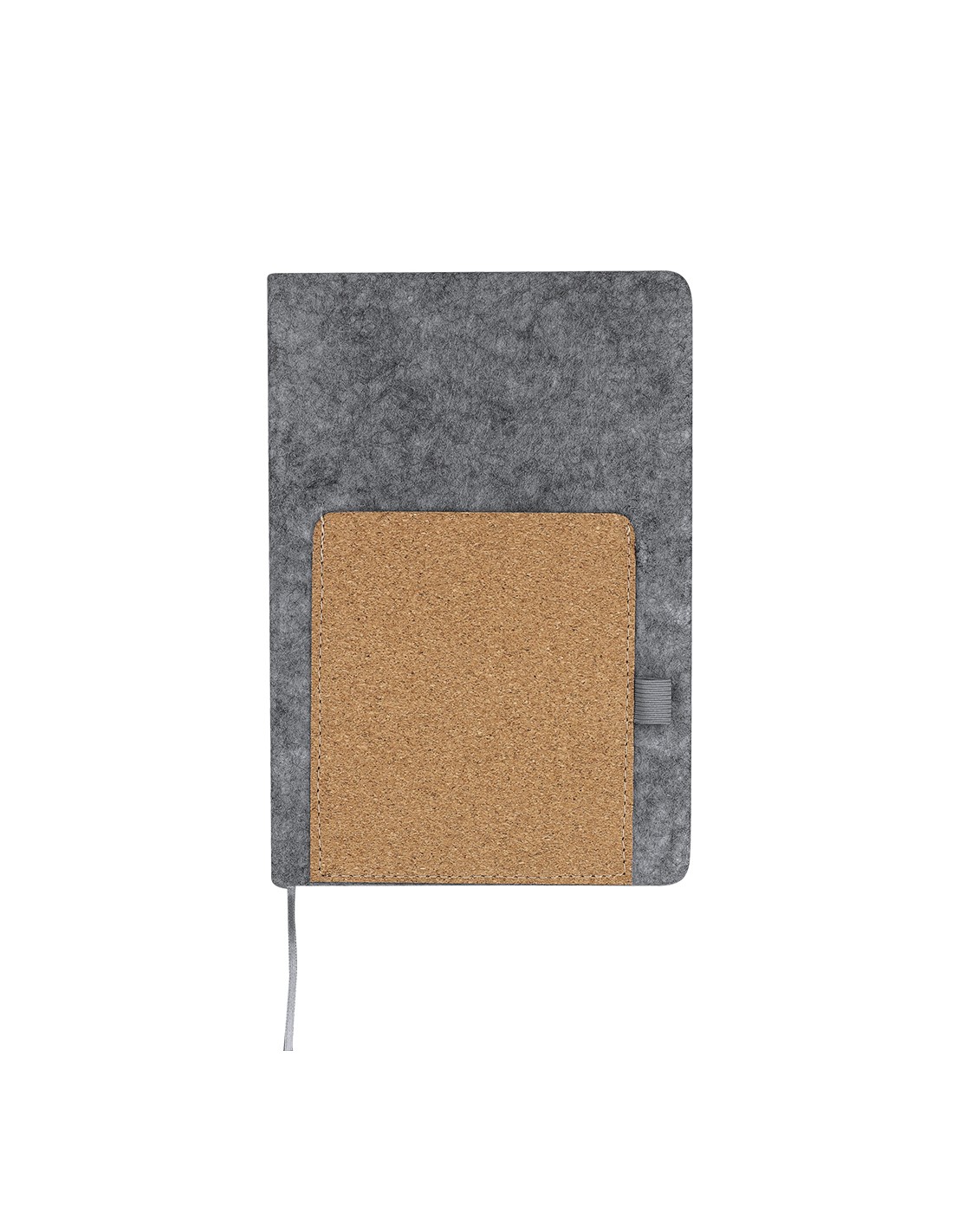 Bloc de notas de tapas rígidas, elaboradas en fieltro RPET. Incluye bolsillo de corcho cosido en portada. Contiene 80 páginas de disposición a una raya, marcapáginas y soporte elástico para bolígrafo a juego. Distintivo RPET en contraportada. El material RPET se elabora a partir de plástico reciclado, para así fomentar la reutilización de residuos plásticos y ayudar a la sostenibilidad del planeta.