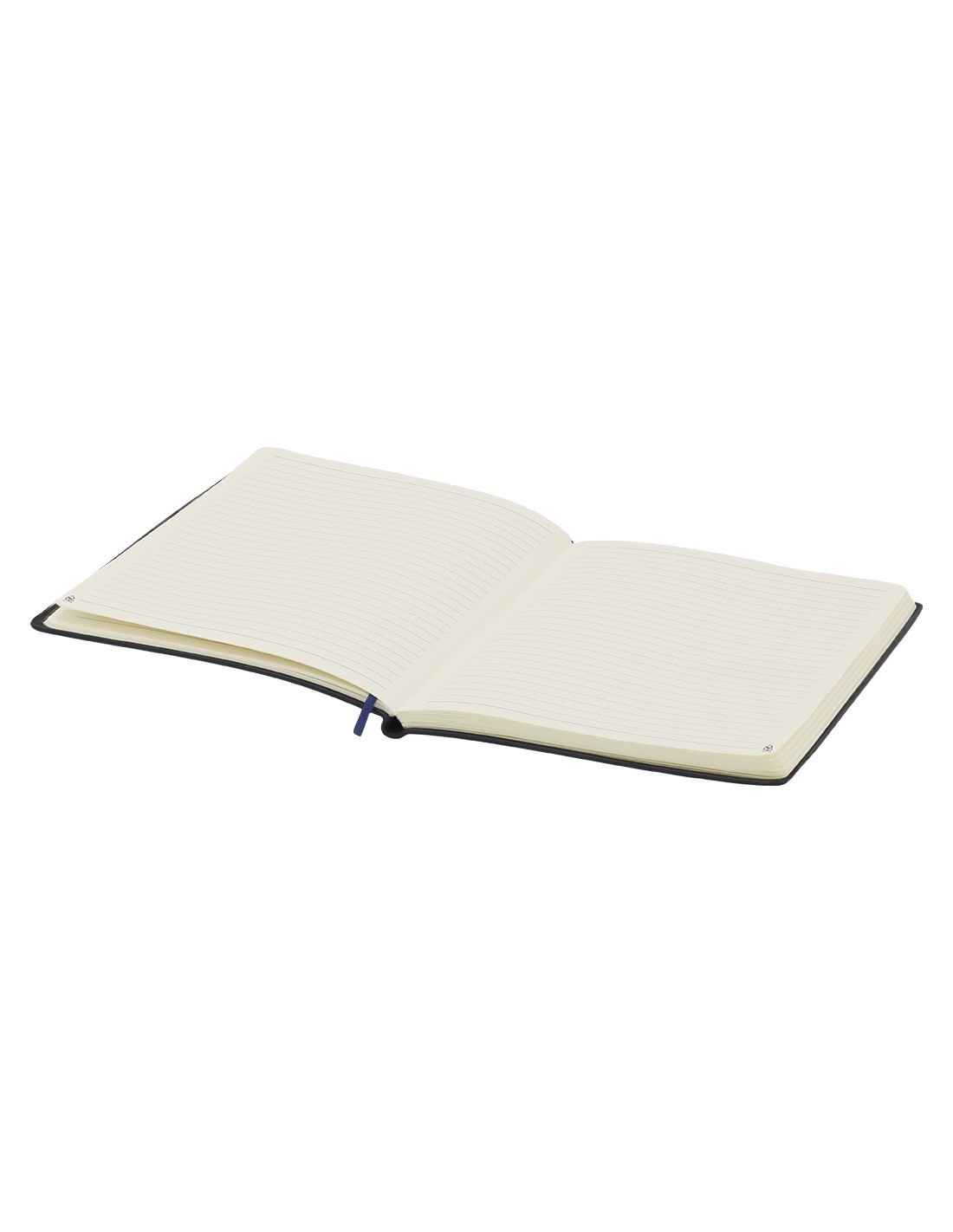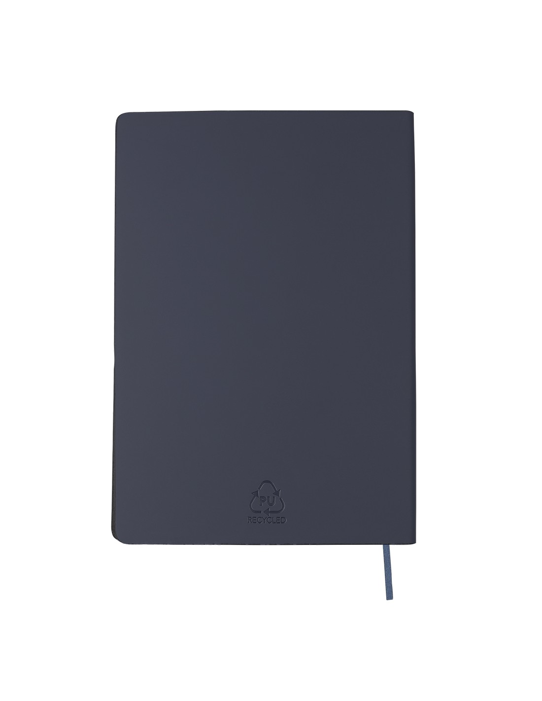 Bloc de notas con tapas blandas fabricadas en PU reciclada. Interior con 80 hojas color crema de disposición a una raya. Incluye marcapáginas a juego. Con distintivo PU Reciclada. La PU reciclada destaca por su resistencia y elasticidad. Este material reciclado y reciclable es una opción sostenible que rescata las fibras desechadas en los procesos de fabricación, minimizando así el desperdicio de material y contribuyendo a su vez a reducir el impacto ambiental, manteniendo a la vez sus propiedades originales.