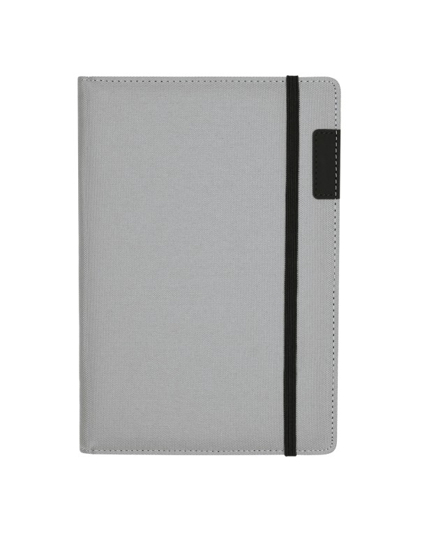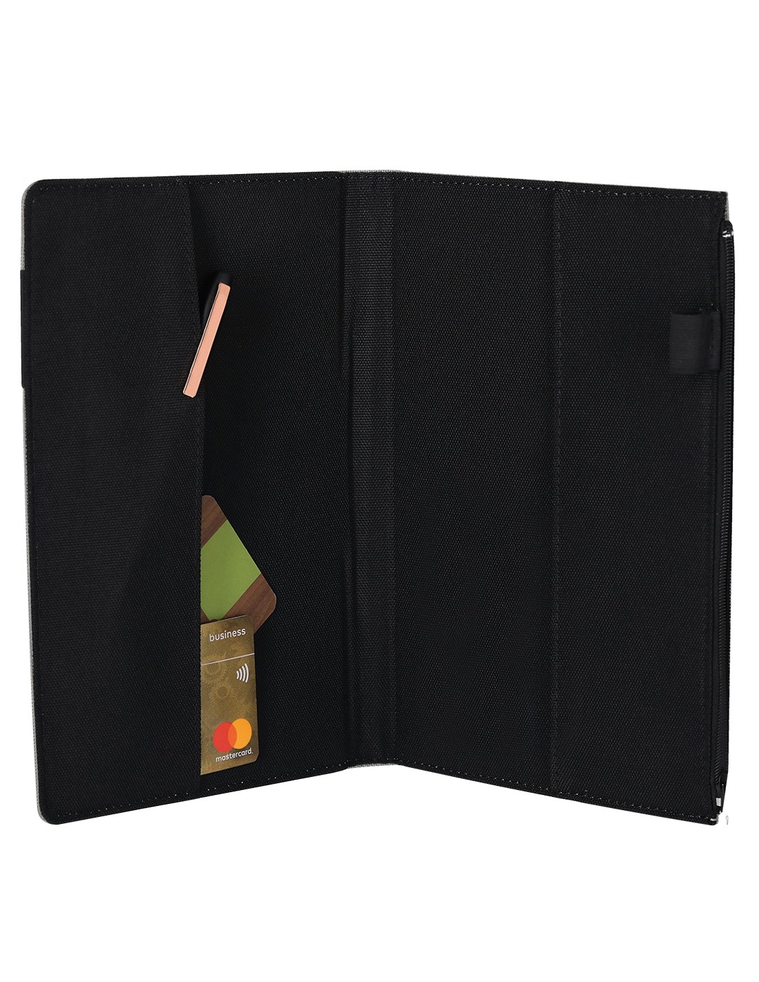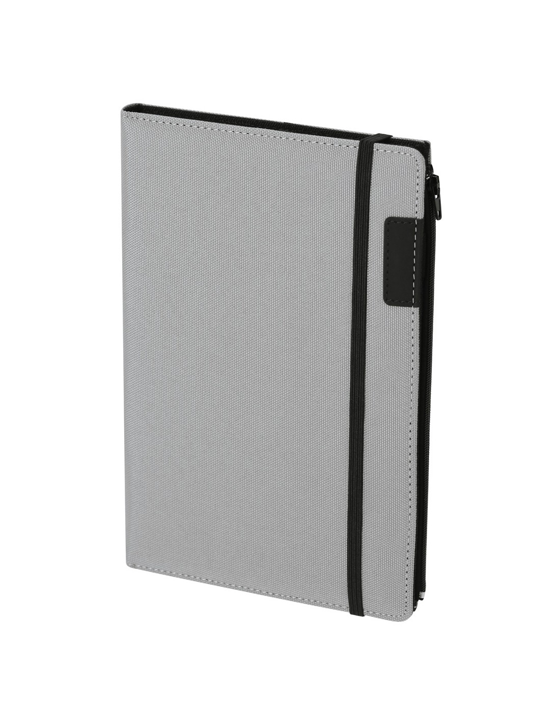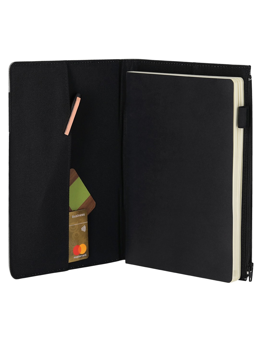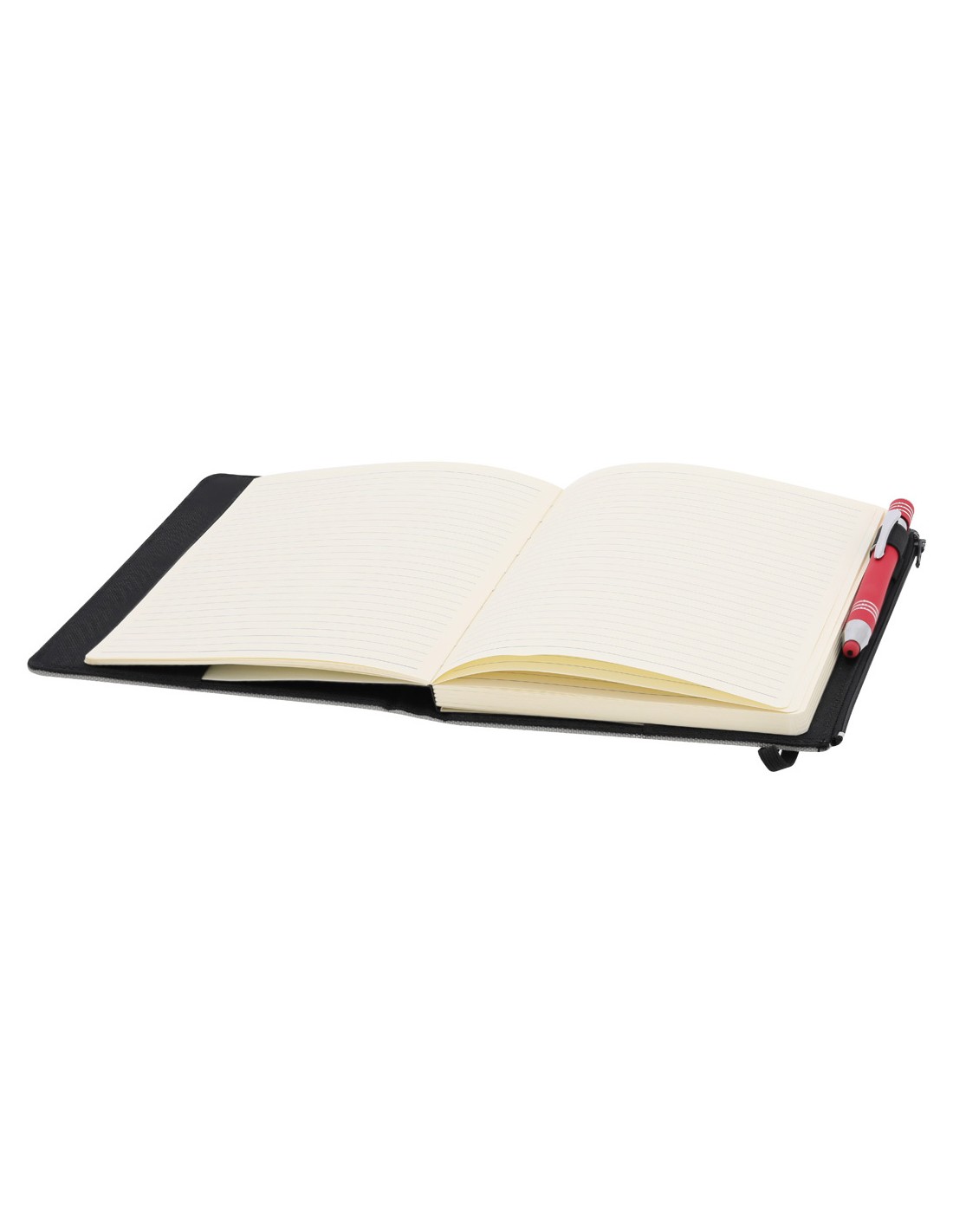 Bloc de Notas con Funda. Incluye:- Bloc de notas interior tamaño A5, con tapas rígidas y 100 hojas de disposición a una raya. - Funda fabricada en RPET 600D, con práctico bolsillo lateral de cremallera, ideal para tener siempre a mano los objetos personales. Además, es extraíble y reutilizable en otros modelos de bloc, convirtiéndose en una solución versátil y sostenible. Incluye soporte para bolígrafo y cierre elástico en color negro. Con logotipo RPET en contraportada.El material RPET se elabora a partir de plástico reciclado, para así fomentar la reutilización de residuos plásticos y ayudar a la sostenibilidad del planeta.