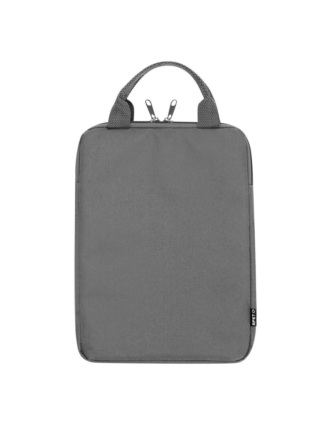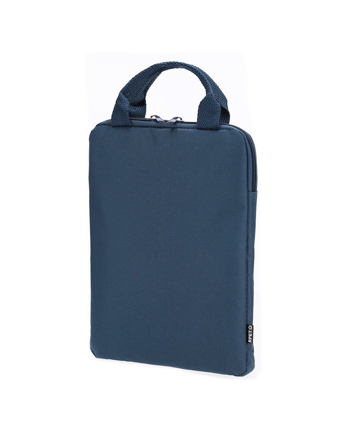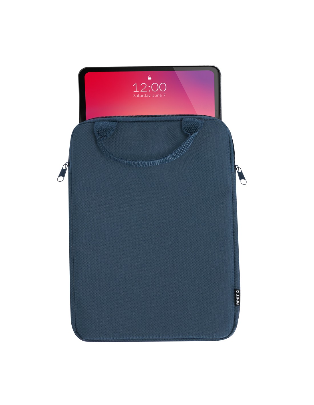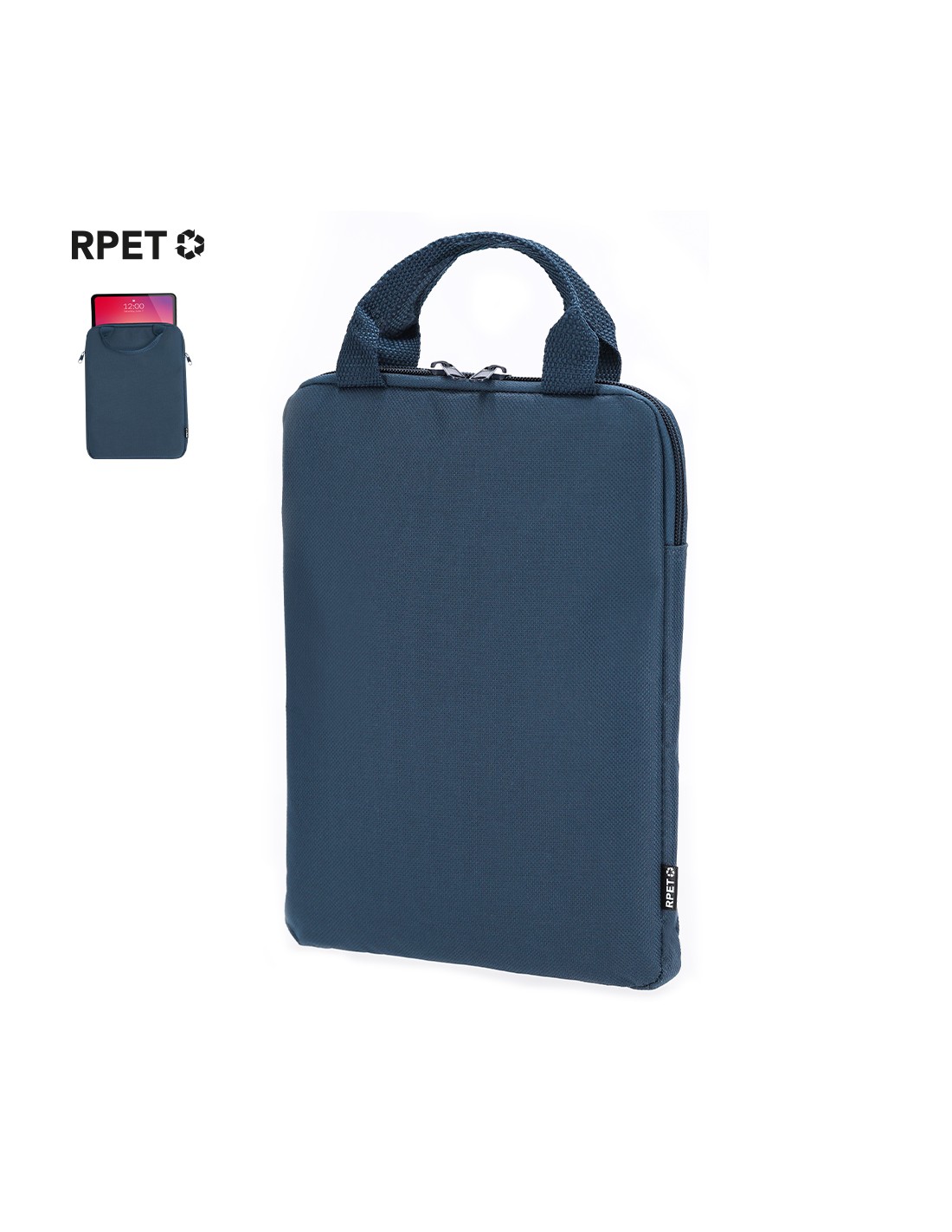Práctica funda acolchada para tablet fabricada en 600D RPET. Apertura en parte superior, con cierre de cremallera, tiradores metálicos y asas de transporte. Para tablets de hasta 10 pulgadas. Etiqueta exterior con logotipo RPET.El material RPET se elabora a partir de plástico reciclado, para así fomentar la reutilización de residuos plásticos y ayudar a la sostenibilidad del planeta.