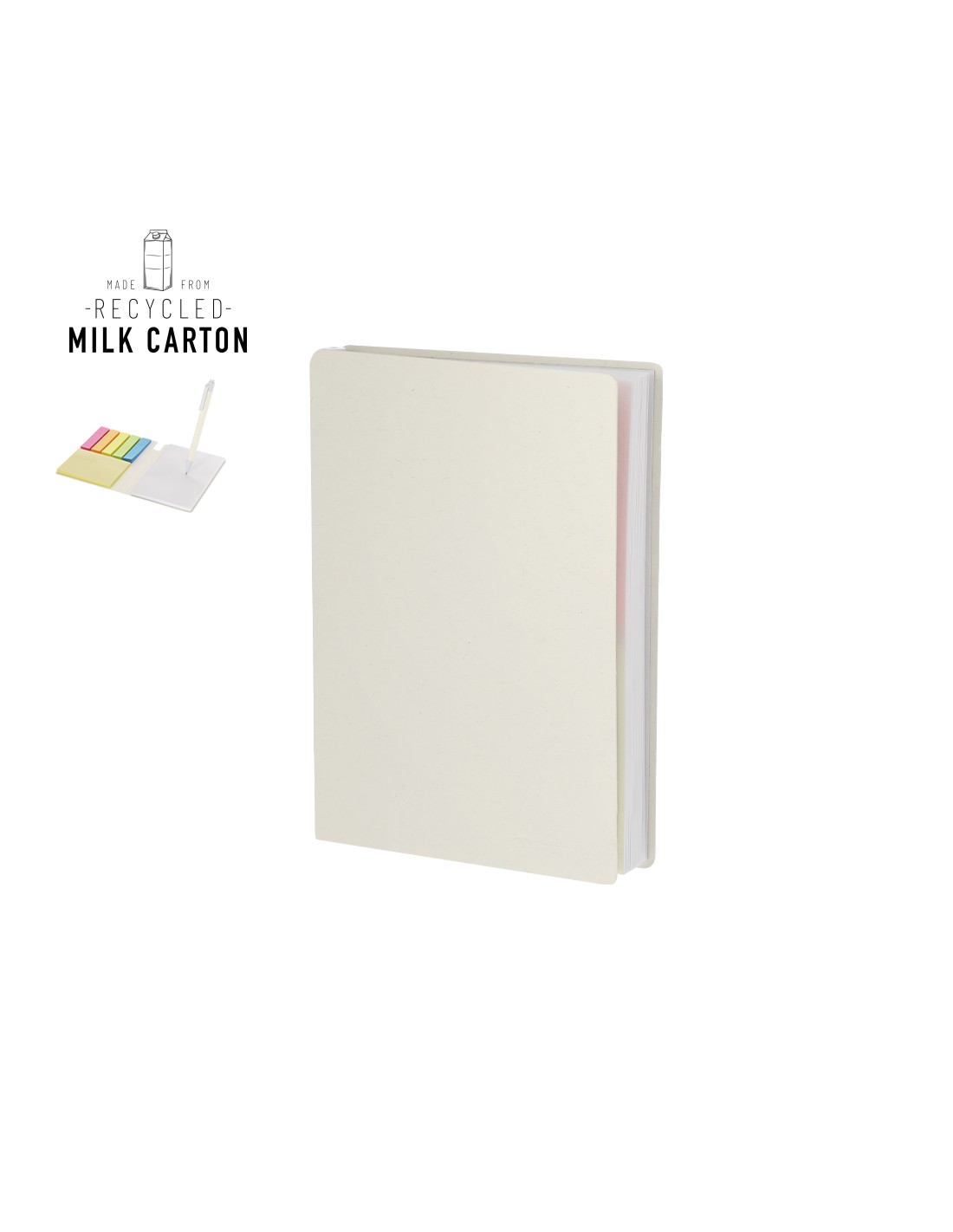 50 Hojas. 50 Notas Adhesivas 6,4 x 8,2 cm. 250 Mininotas Adhesivas 1,5 x 6,4 cm. Bolígrafo Cartones de Leche Reciclados Incluido