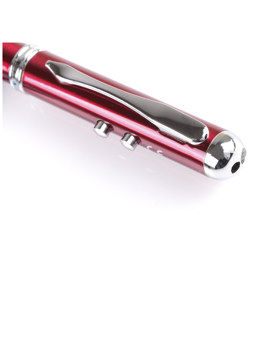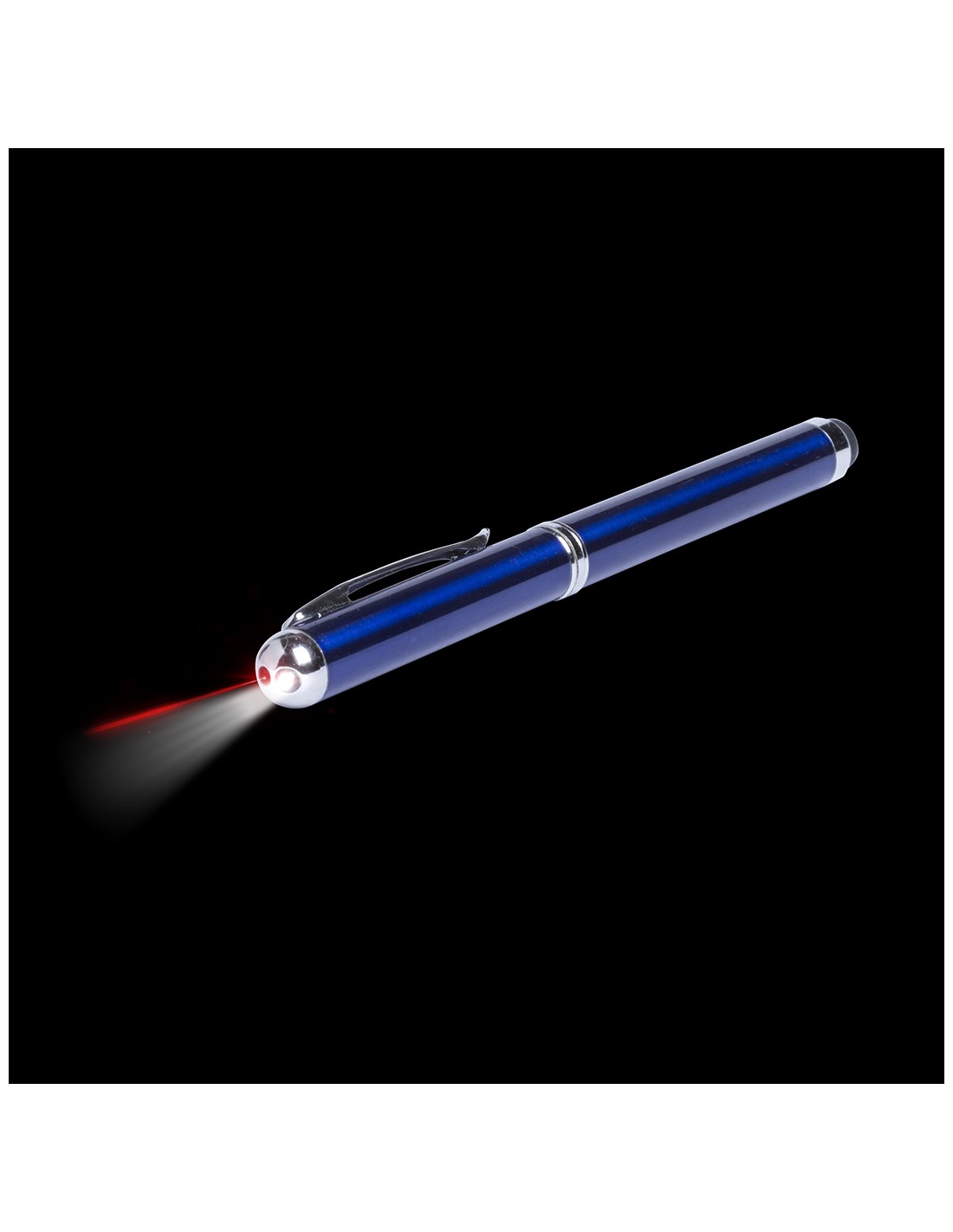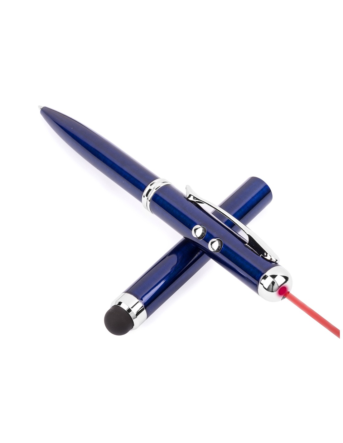 Bolígrafo láser metálico en elegante acabado brillo, con pulsadores de activación laterales para funciones láser y linterna (pilas de botón incluidas). En tinta azul, con puntero táctil integrado, cierre de capucha y clip cromado. Especialmente diseñado para marcaje en láser. Presentado en un elegante estuche metálico en caja individual de cartón de acabado plateado. Interior en suave esponja troquelada, con pilas de recambio.