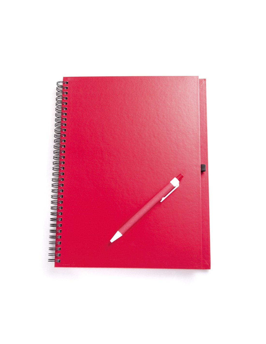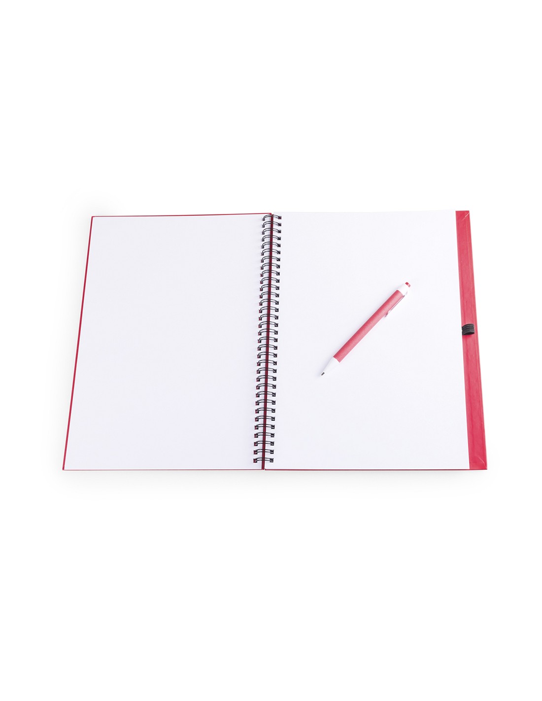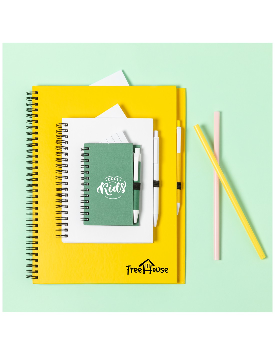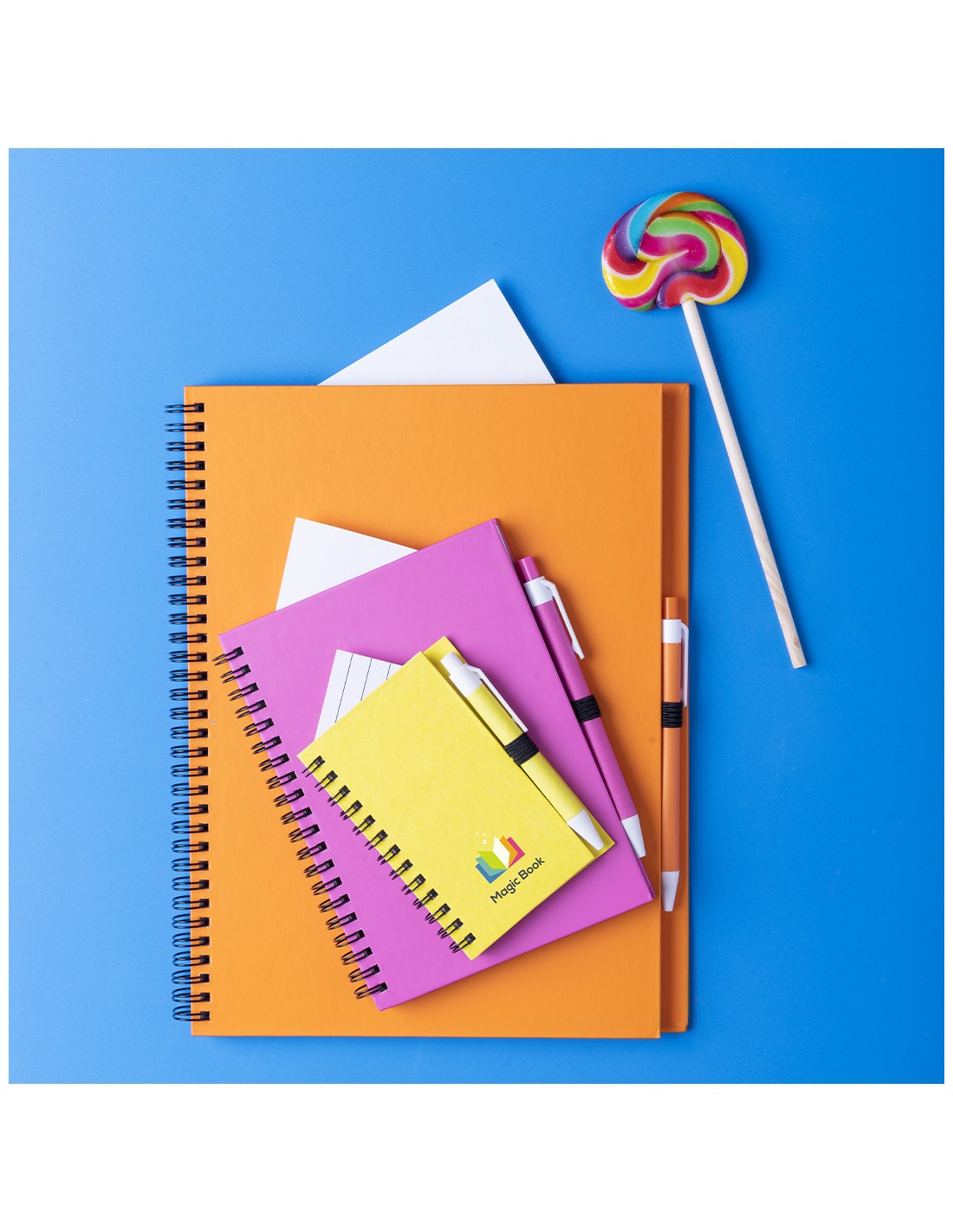 Libreta de anillas con tapas de suave tacto acabadas en resistente cartón reciclado y bolígrafo en cartón reciclado a juego. De atrevidos colores, 80 hojas lisas y con soporte para bolígrafo en contraportada.