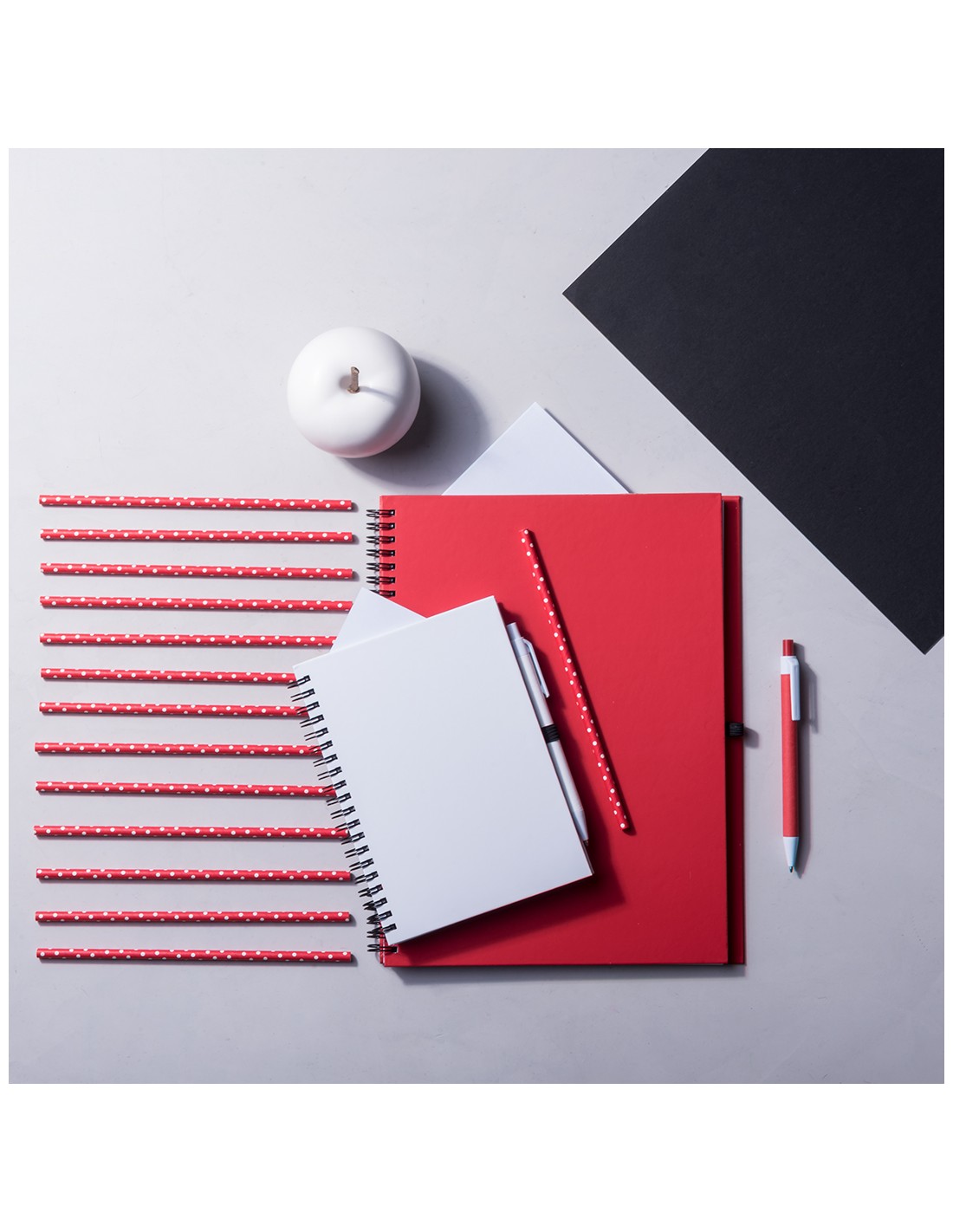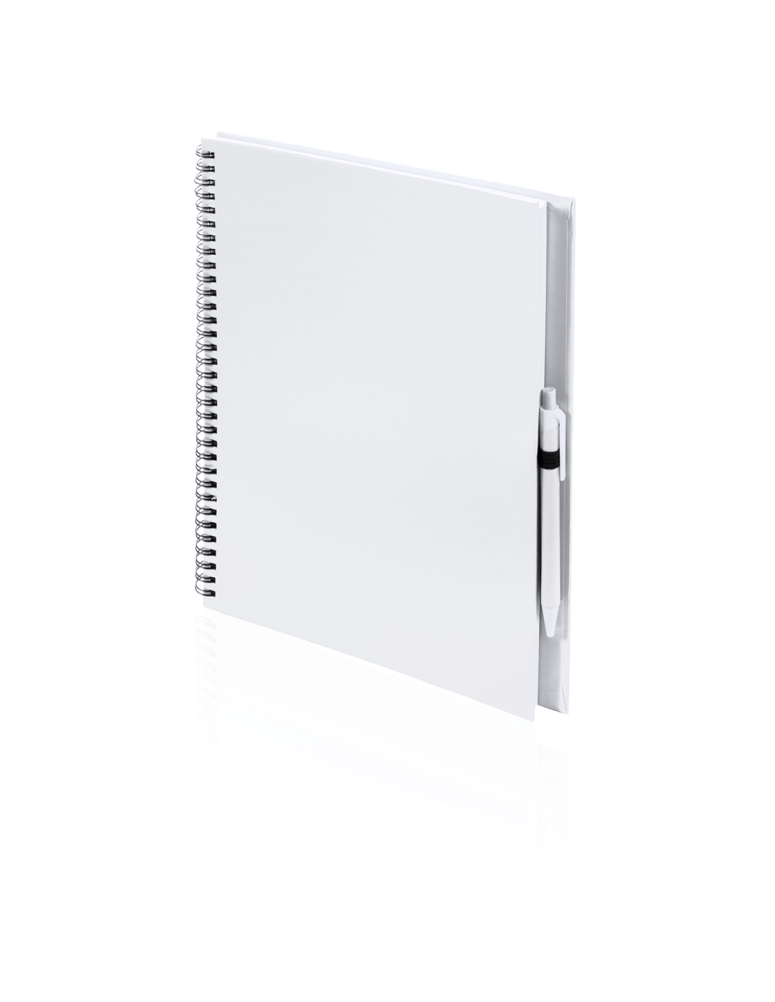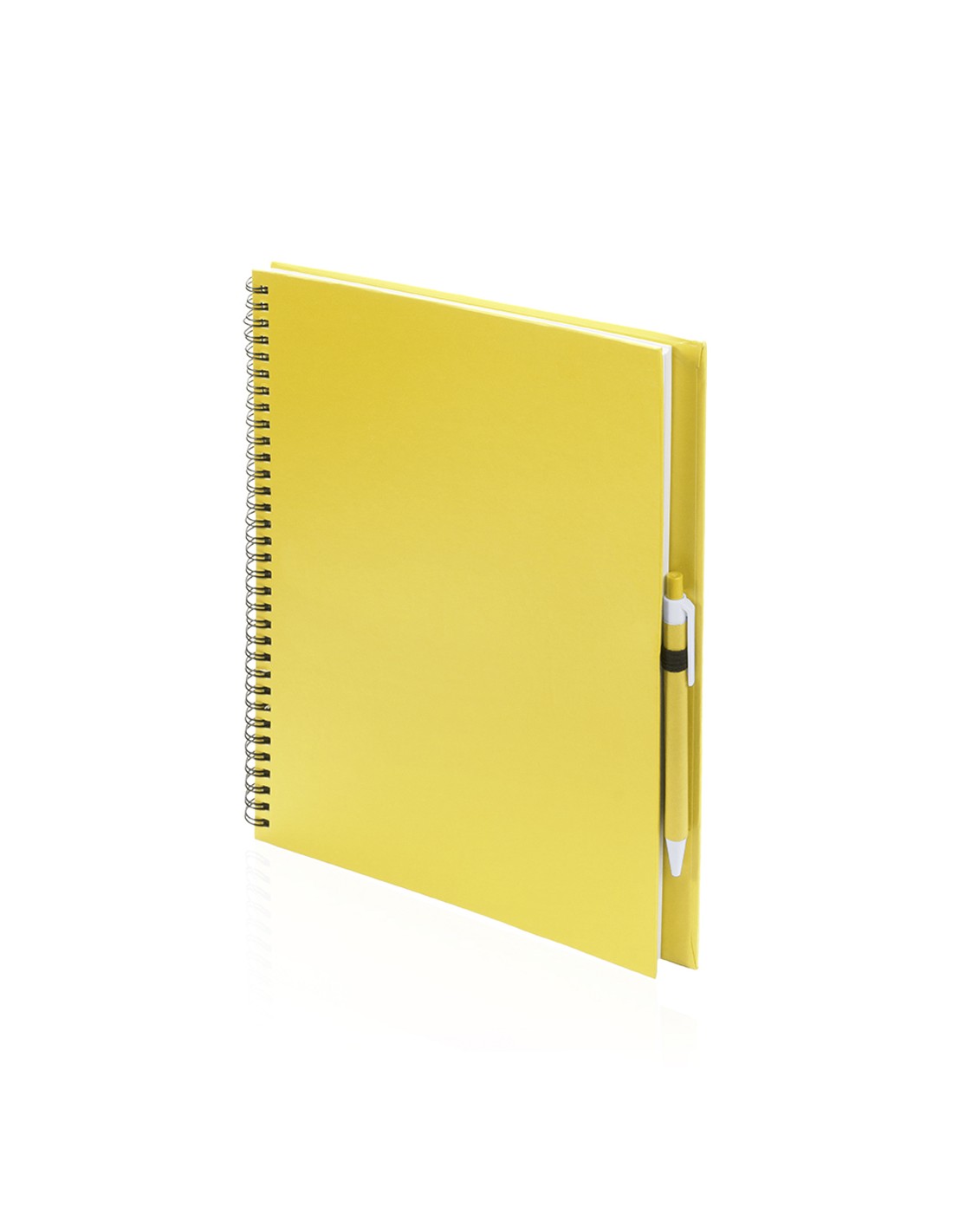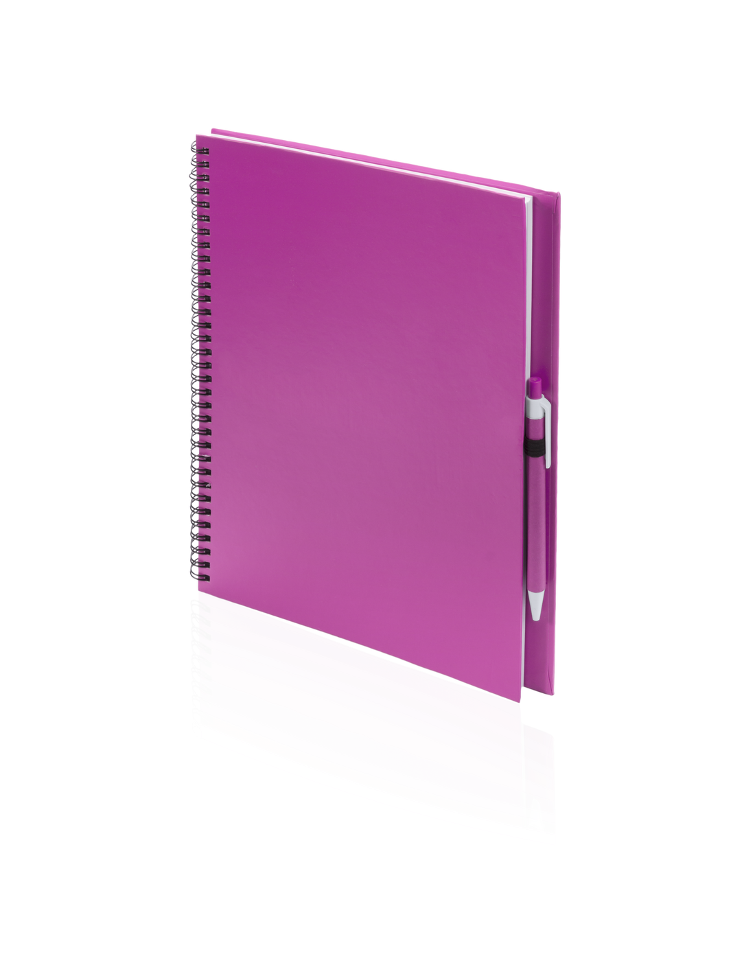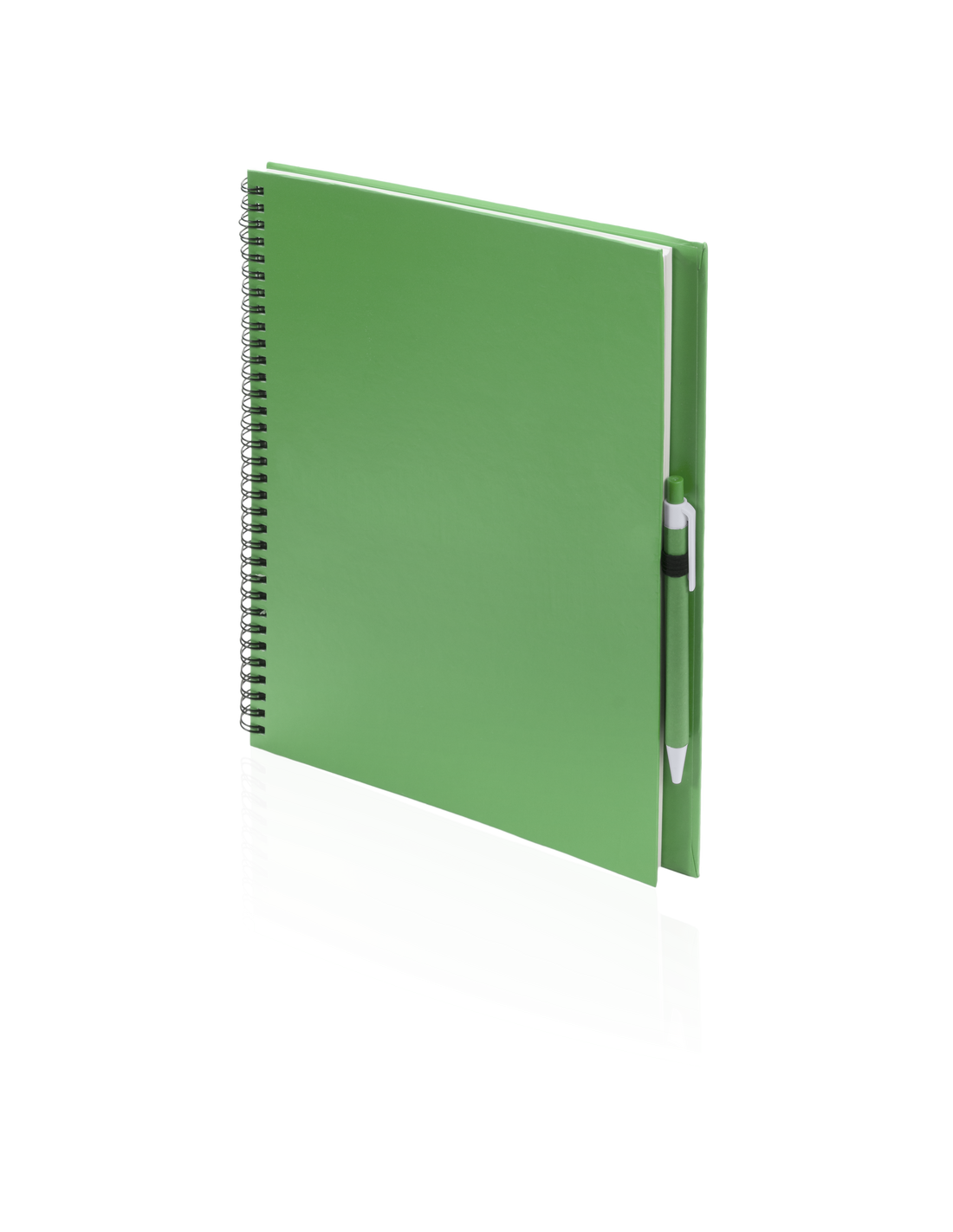 Libreta de anillas con tapas de suave tacto acabadas en resistente cartón reciclado y bolígrafo en cartón reciclado a juego. De atrevidos colores, 80 hojas lisas y con soporte para bolígrafo en contraportada.