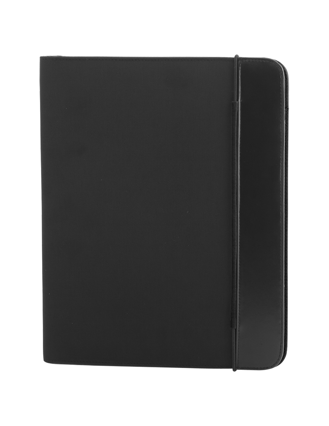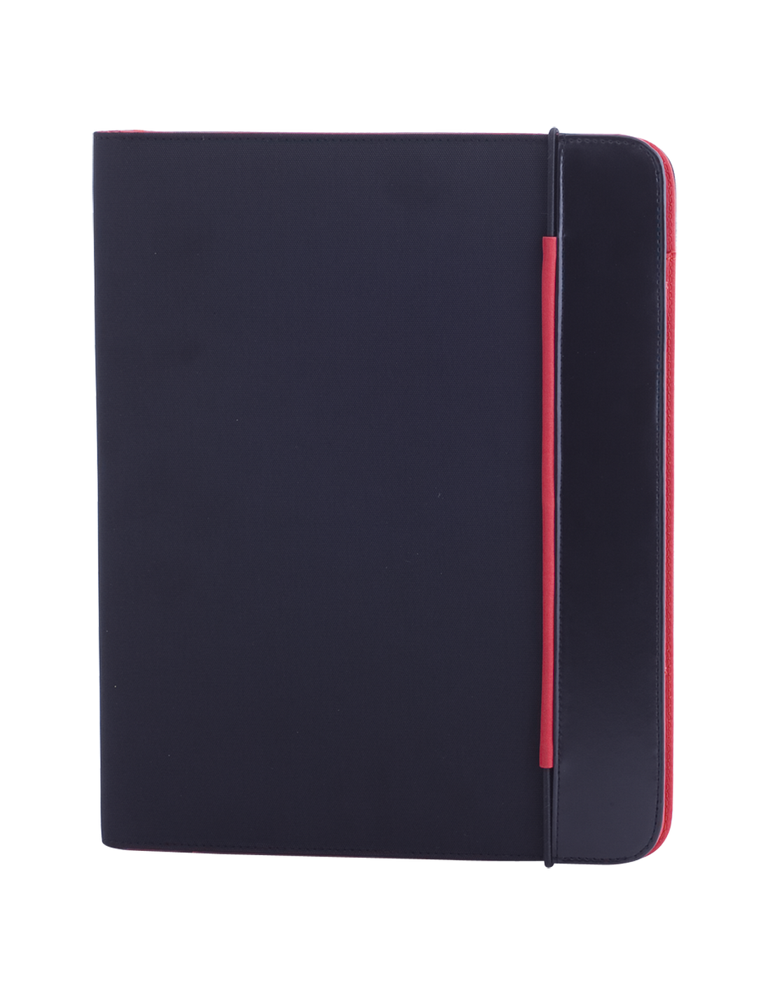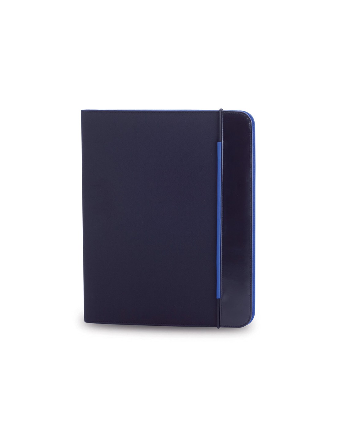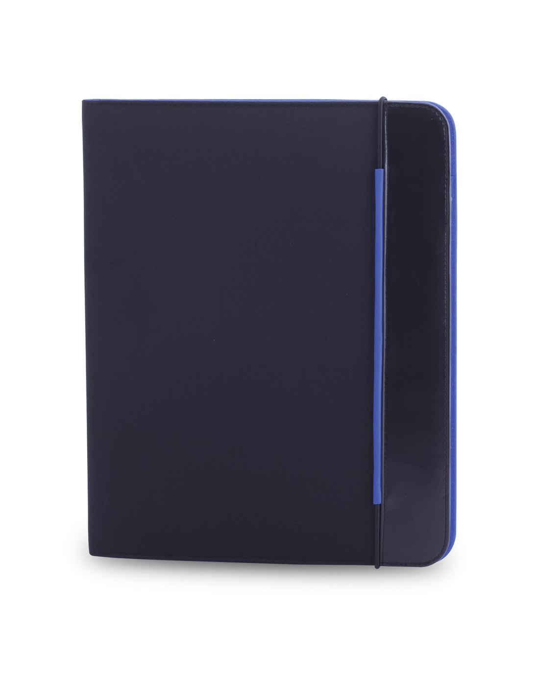Carpeta de diseño bicolor en vivos colores acabada en suave microfibra y con cierre elástico. Interior a juego con bloc extraíble de 20 hojas lisas, bolsillo de solapa, tarjeteros y soporte para bolígrafo.
