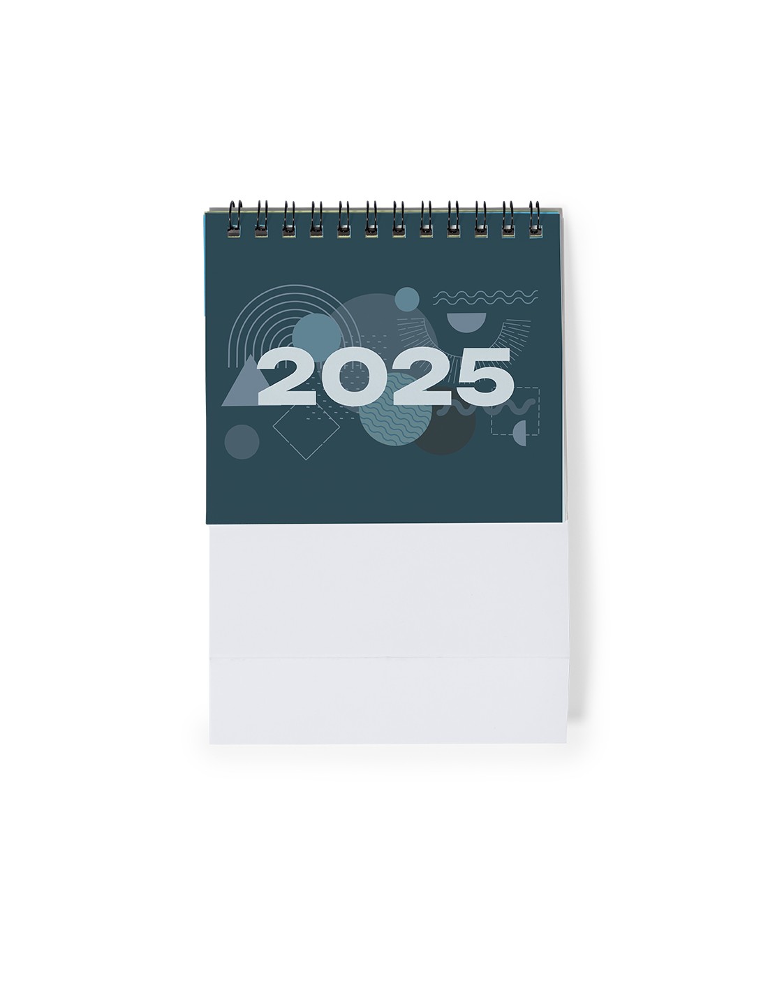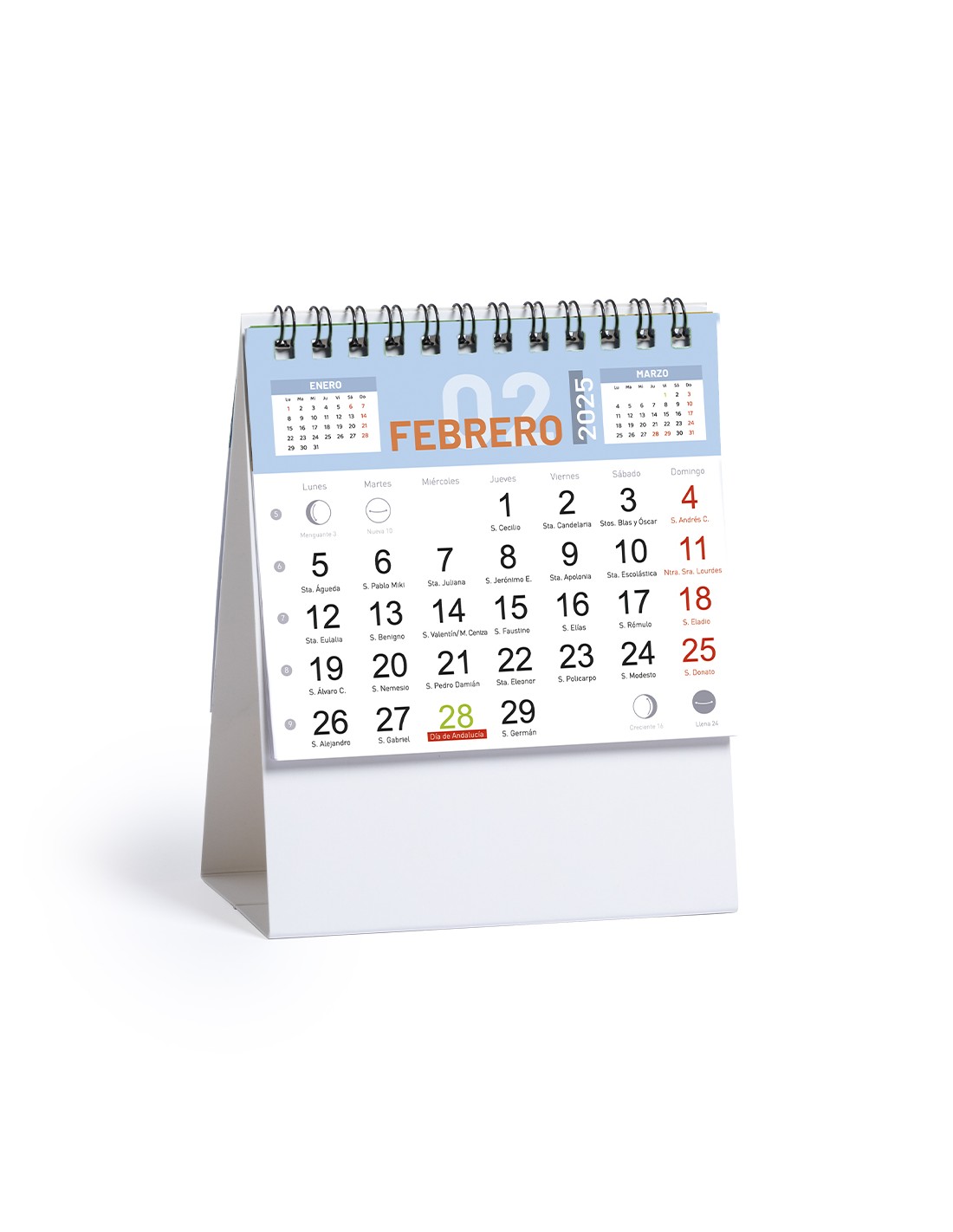 Calendario de sobremesa de anillas con cuerpo triangular en cartón. Diseño mes en curso/ mes anterior/ mes siguiente y santoral. Amplia superficie de marcaje en ambas caras.