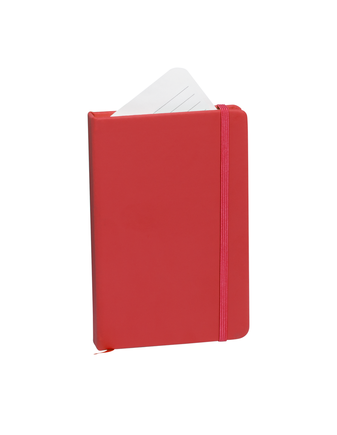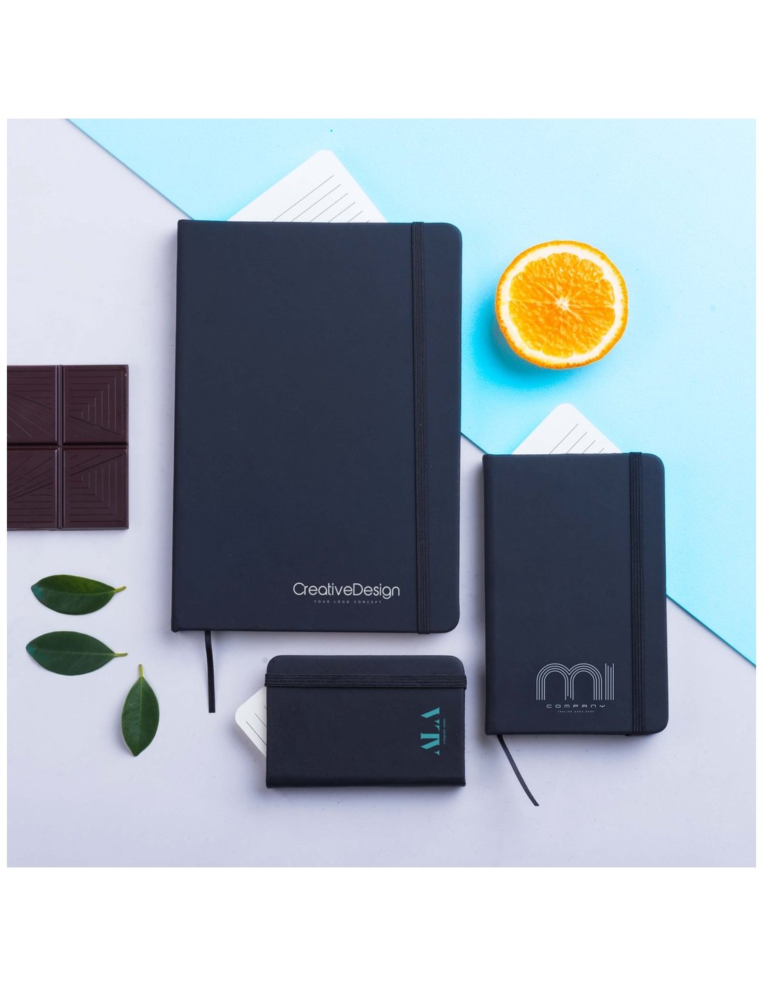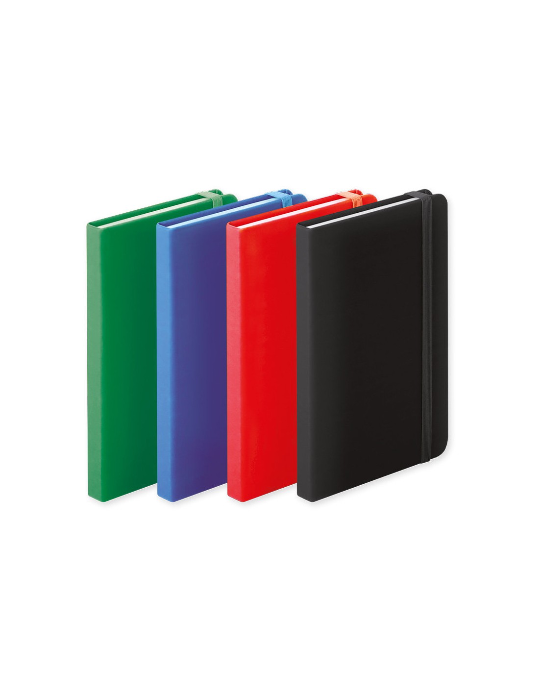 Bloc de notas con tapas de suave tacto, acabado en polipiel y en desenfadados colores. Con 100 hojas de distribución a una raya, elástico de sujeción y marcapáginas de tela a juego.
