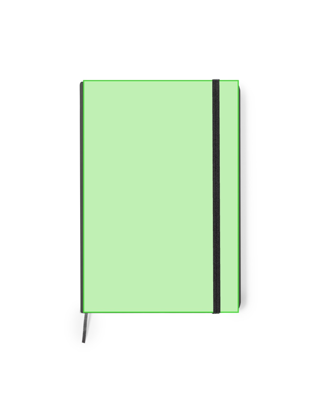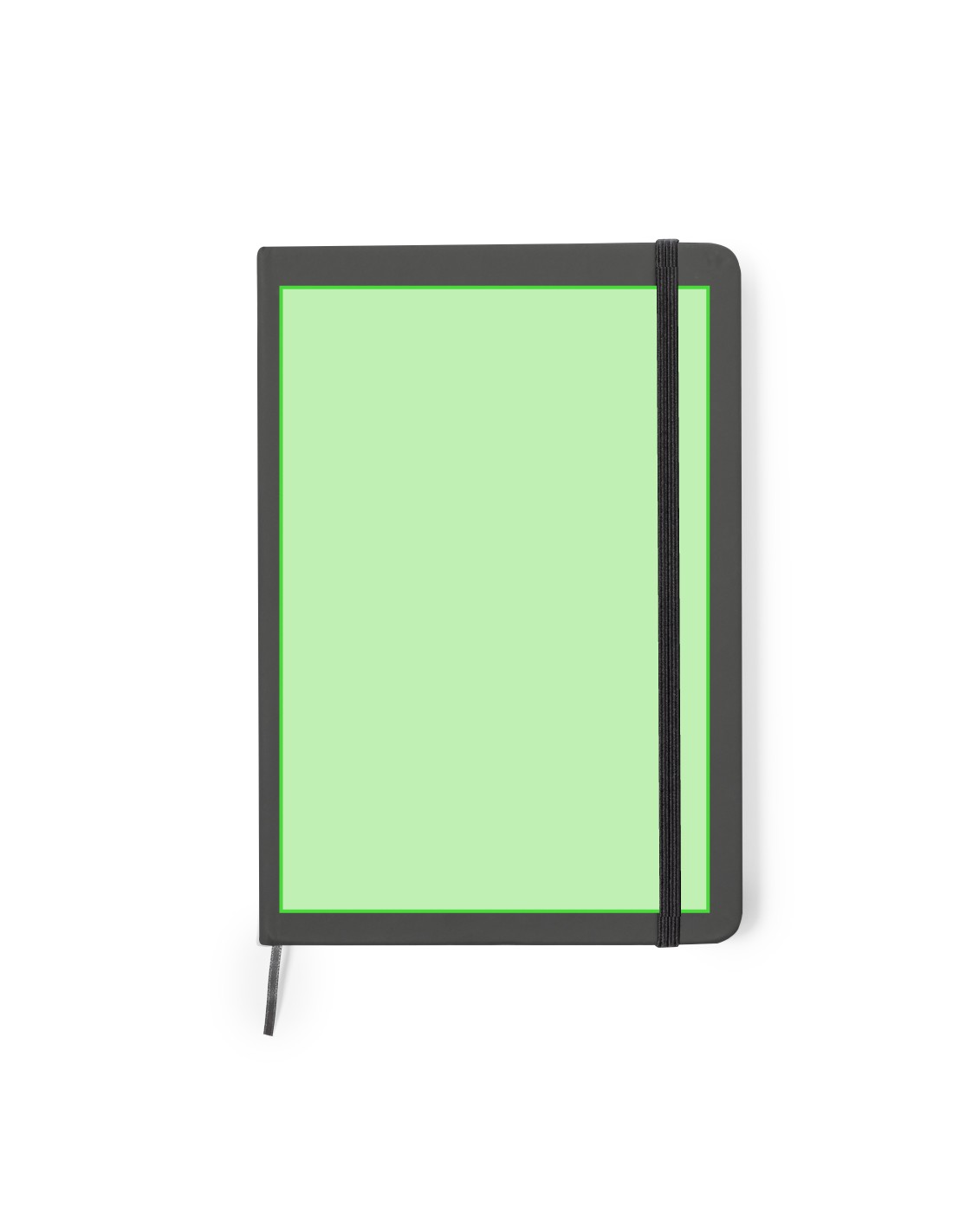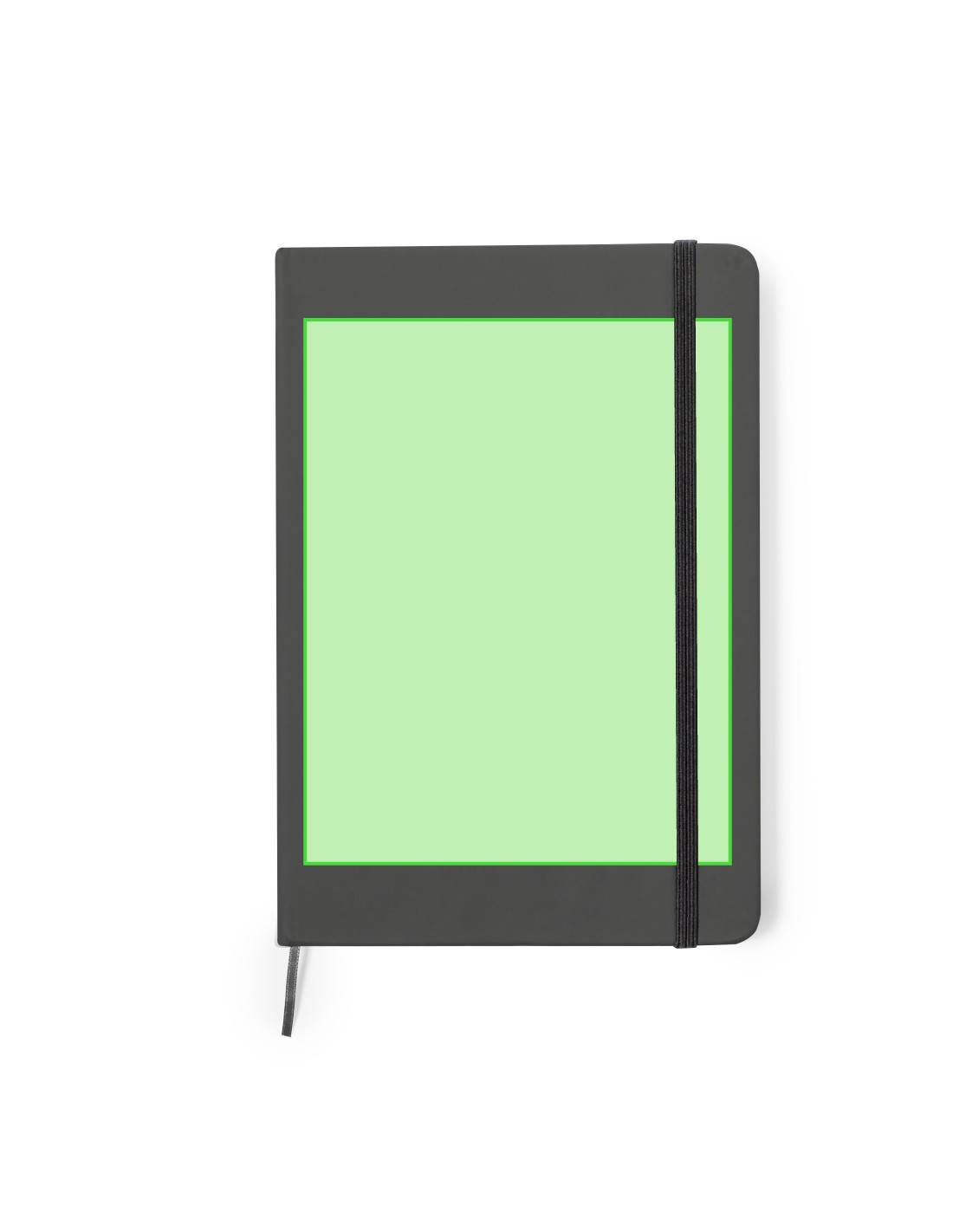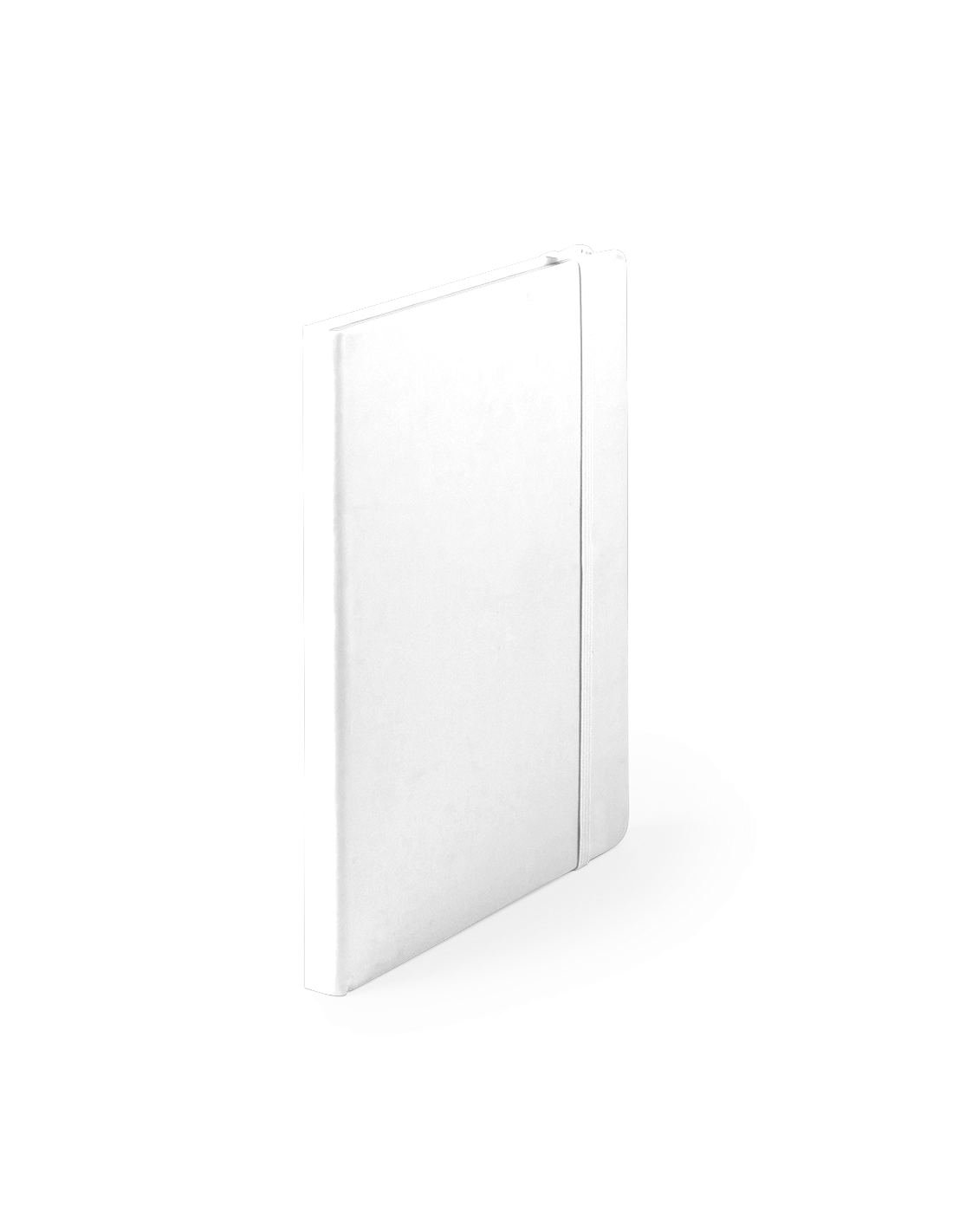 Bloc de notas A5 con tapas duras fabricado en suave polipiel y con 100 hojas de disposición a una raya. Incluye marcapáginas de tela y banda elástica a juego. Disponible en una variada gama de colores.