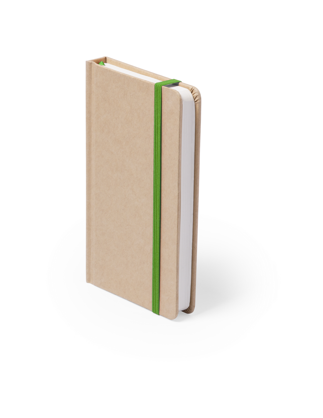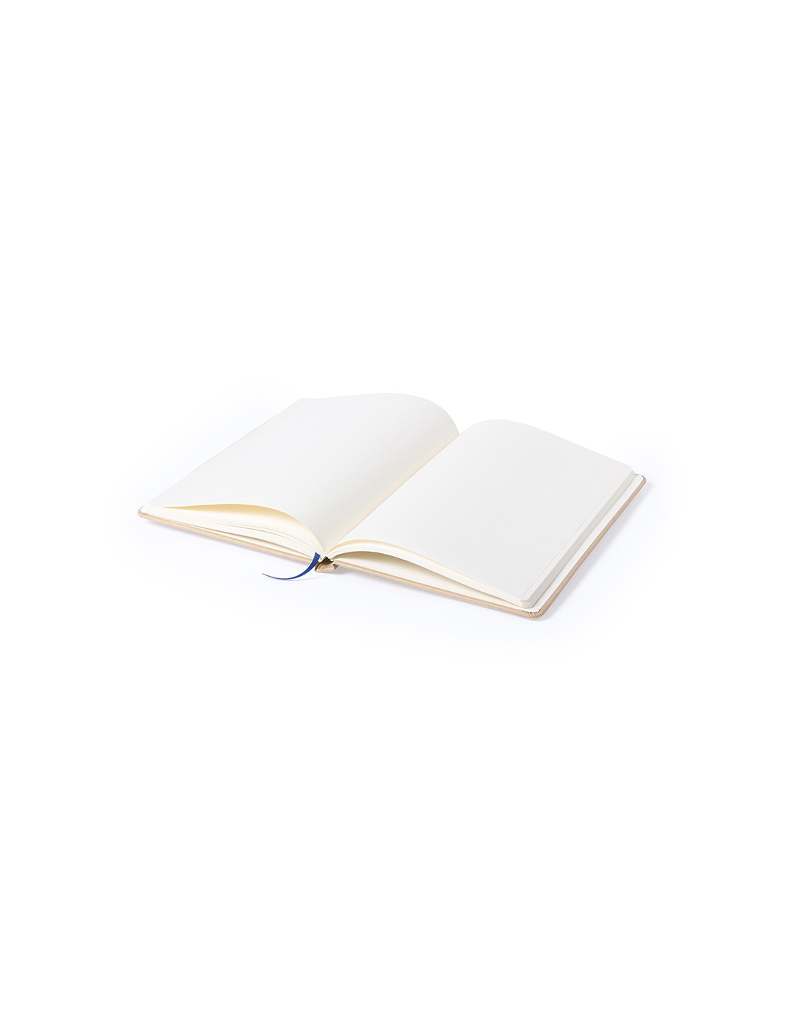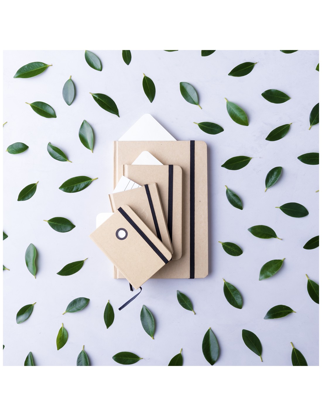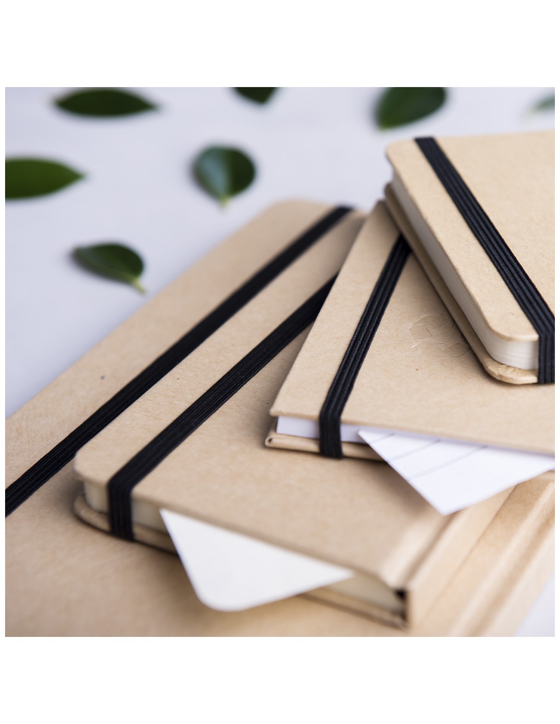 Bloc de notas con tapas de suave tacto acabadas en resistente cartón natural. De 100 hojas lisas, con elástico de sujeción y marcapáginas de tela a juego.