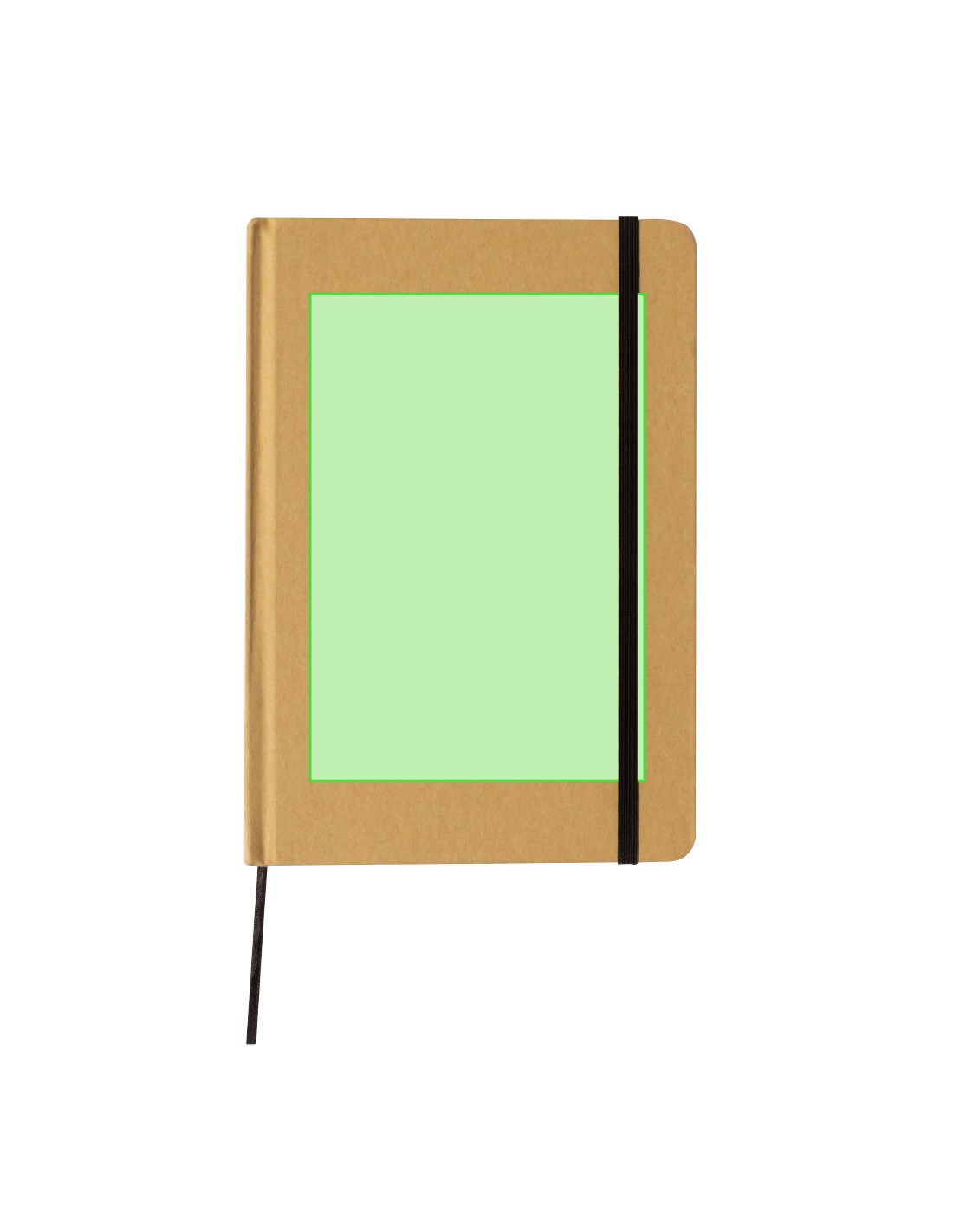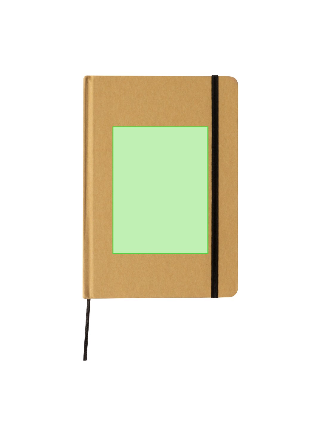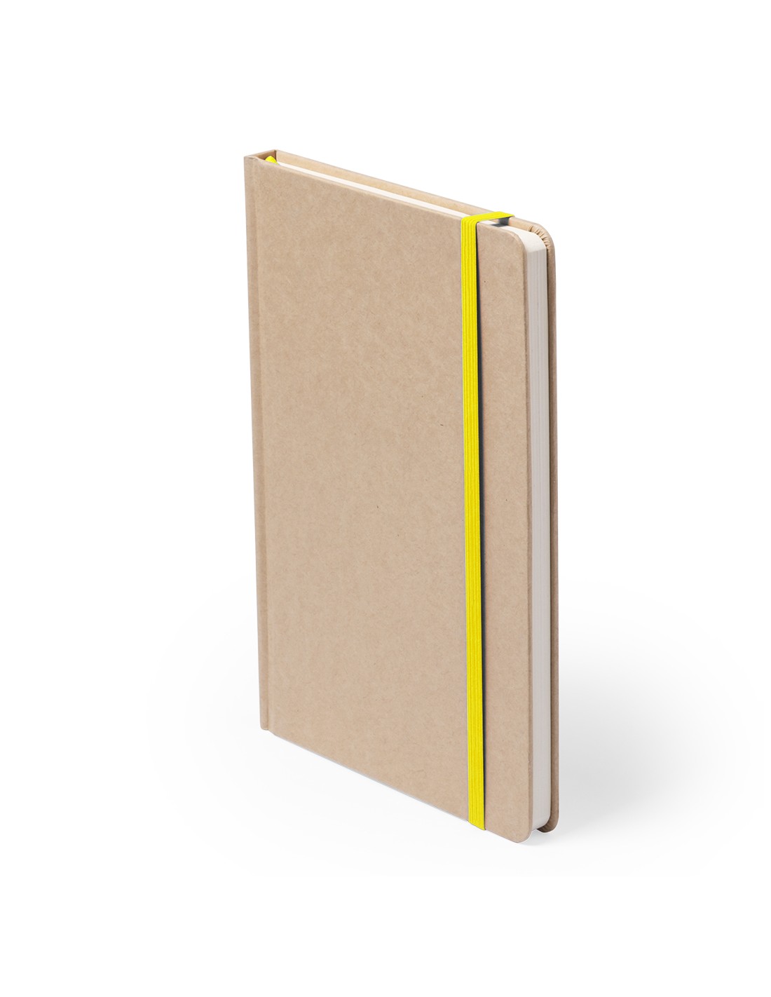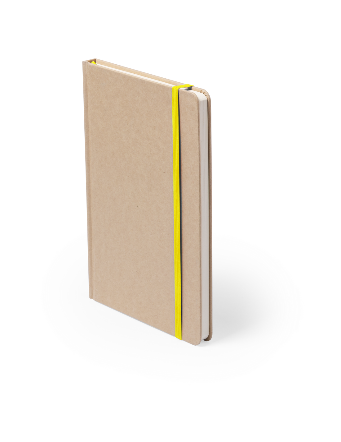 Bloc de notas A5 con tapas duras en resistente cartón reciclado. De 100 hojas blancas lisas y banda elástica para su cierre. Disponible en variada gama de colores.