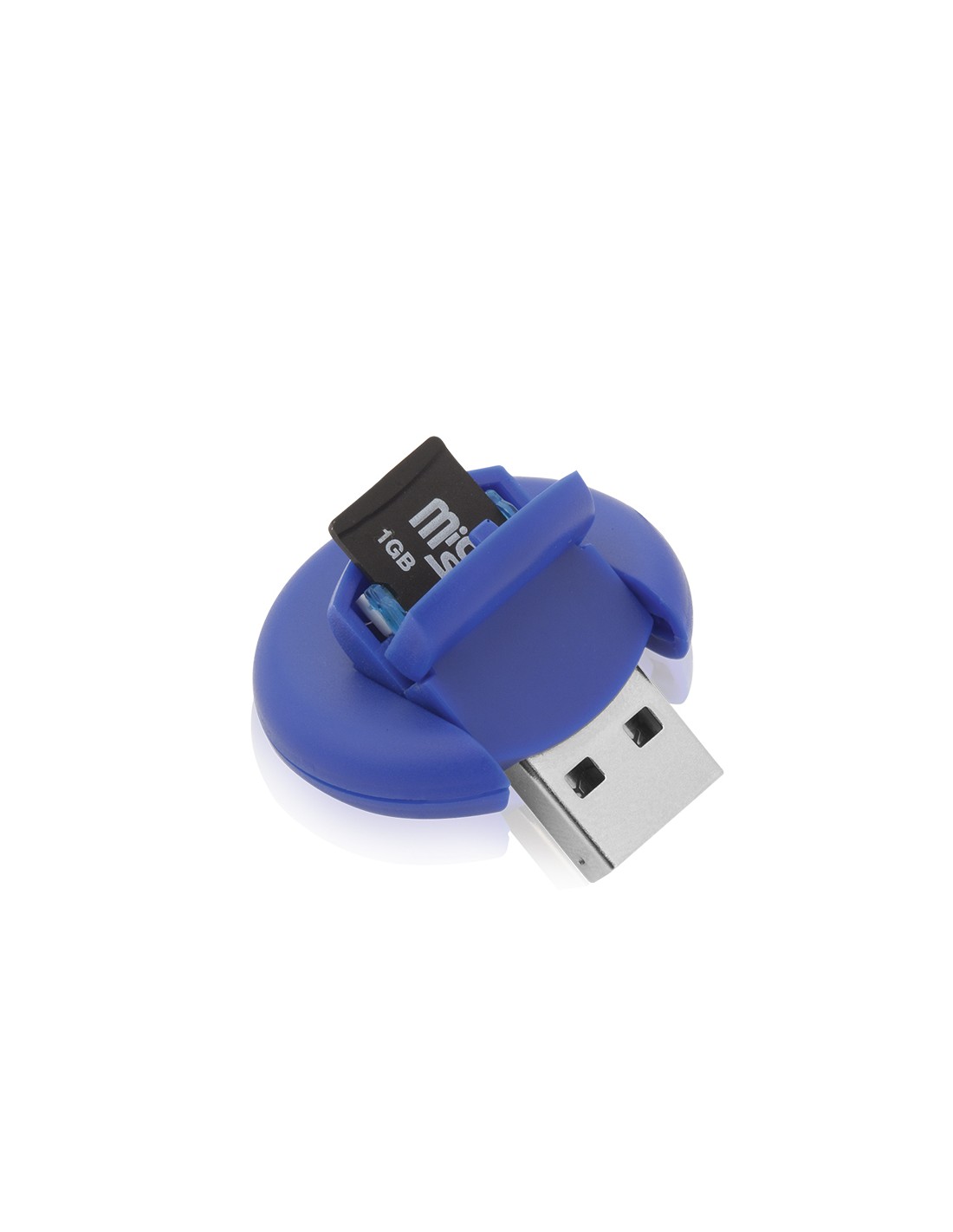 Original lector de tarjetas giratorio de diseño circular, con conexión USB 2.0, en divertidos colores y de suave acabado. De diseño circular y compatible con tarjetas micro SD. Presentado en caja individual.