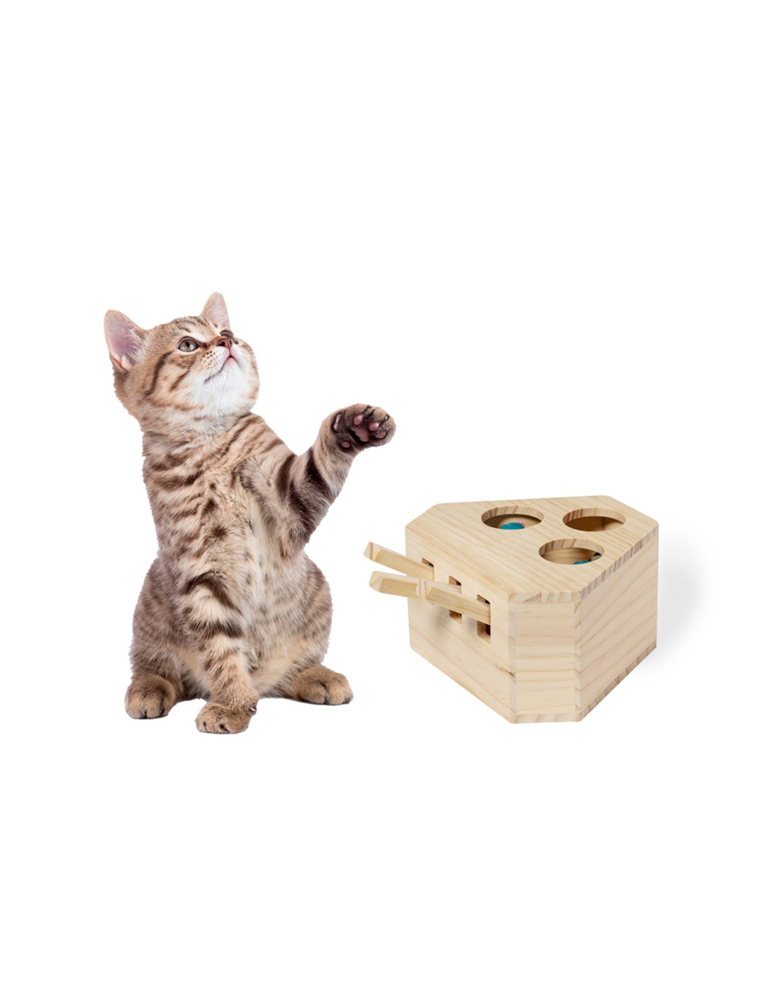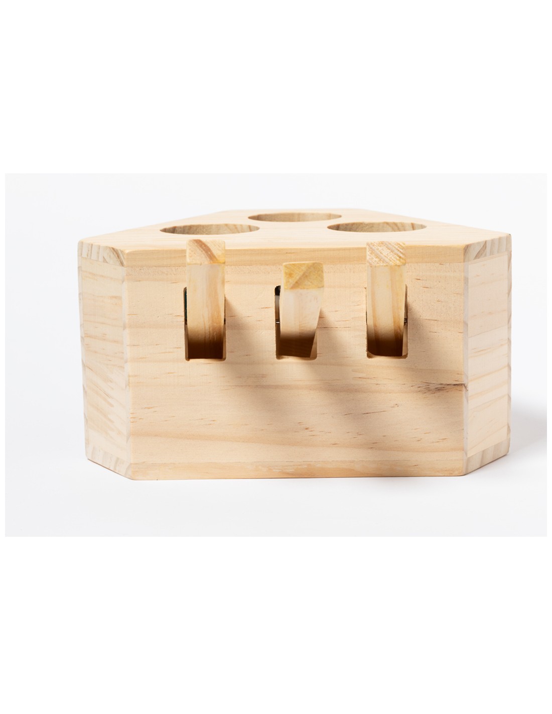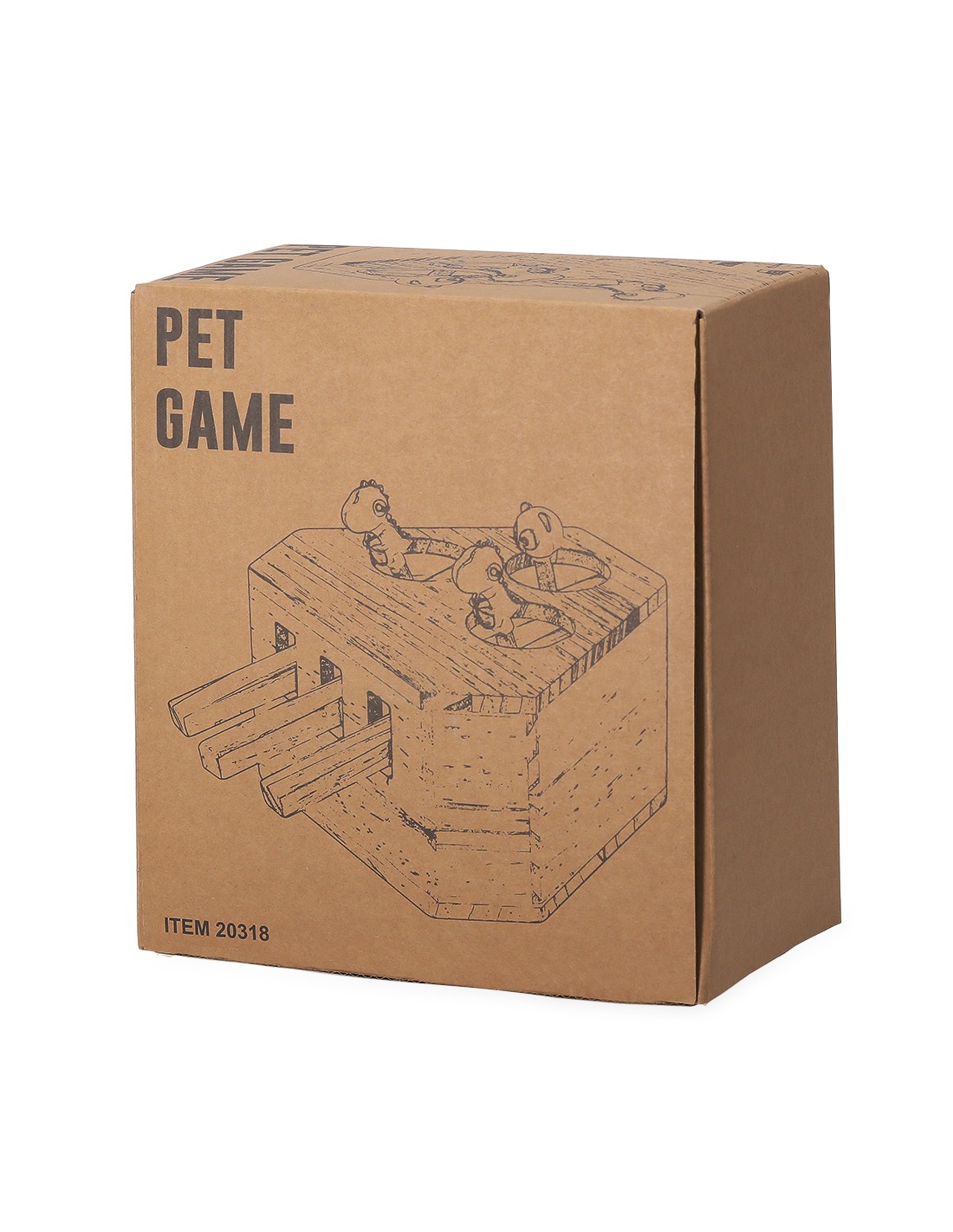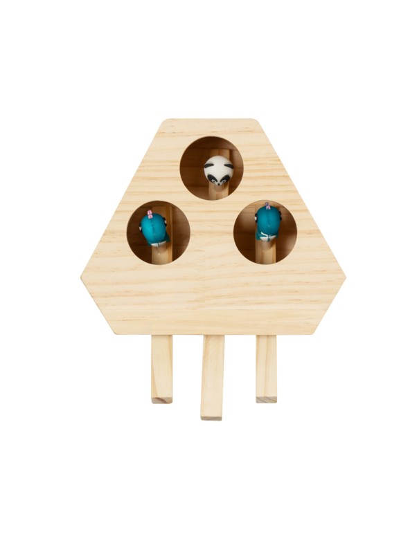 Juego para mascotas fabricado en madera. Divertido, seguro y fácil de usar: pulsando en las palancas aparecen 3 simpáticas figuras que despertarán la curiosidad de toda mascota. Presentado en caja individual kraft.
