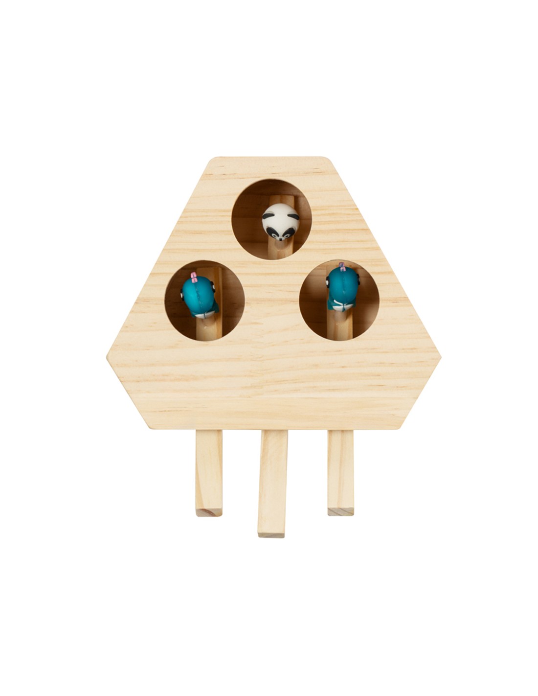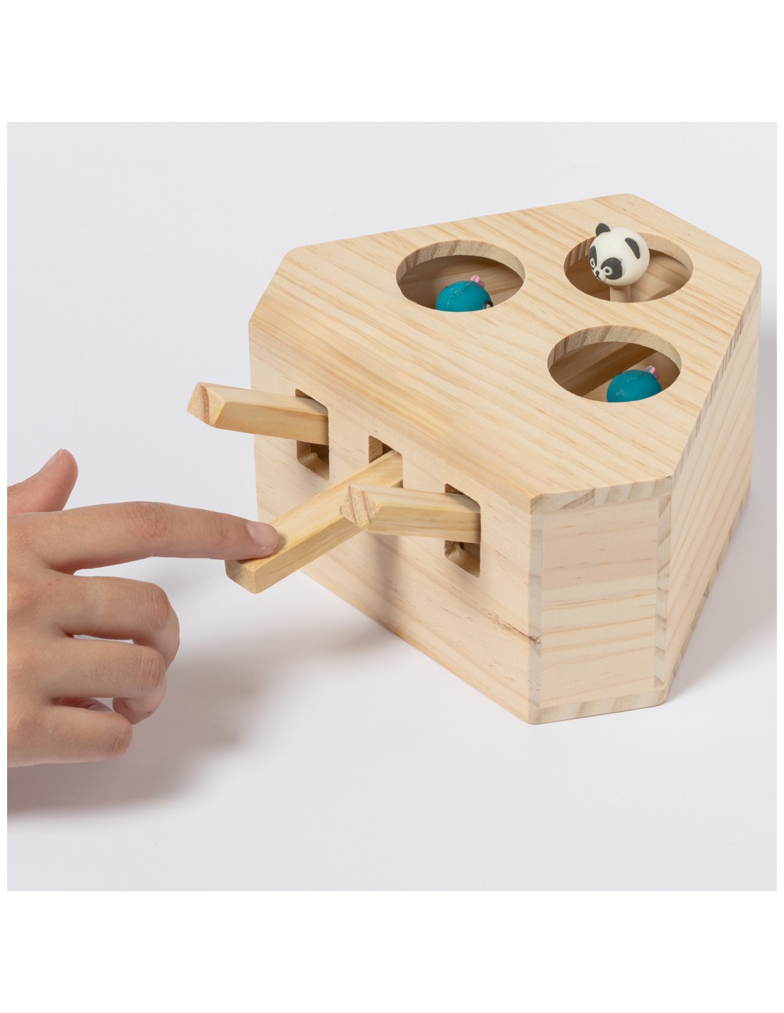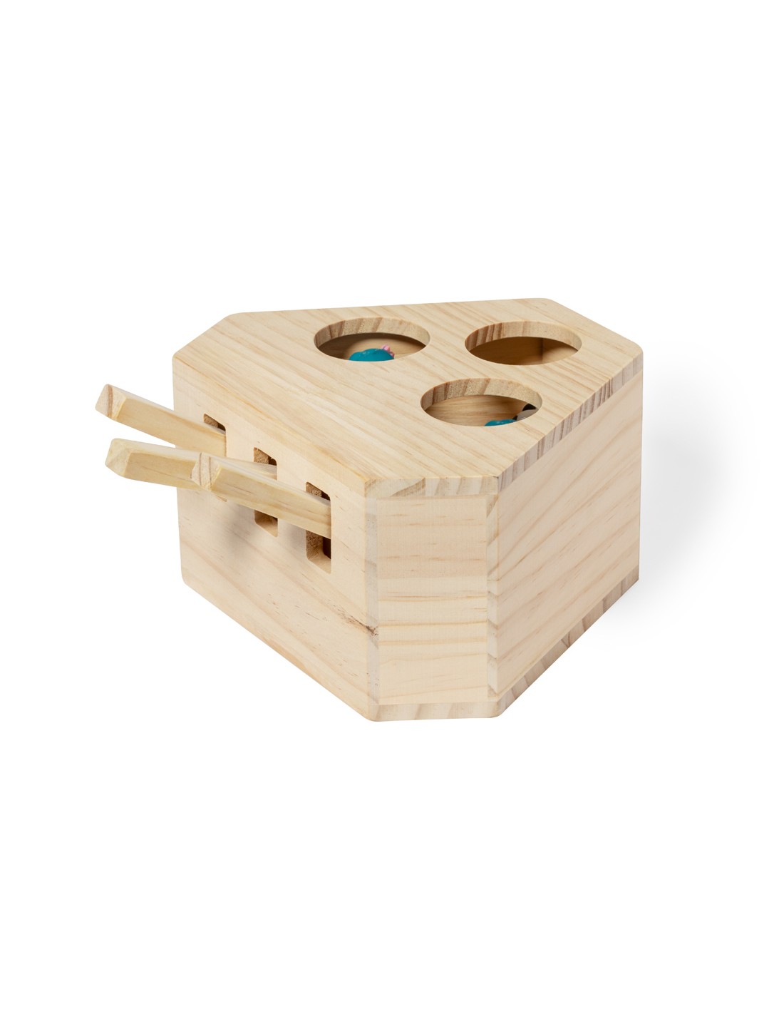 Juego para mascotas fabricado en madera. Divertido, seguro y fácil de usar: pulsando en las palancas aparecen 3 simpáticas figuras que despertarán la curiosidad de toda mascota. Presentado en caja individual kraft.